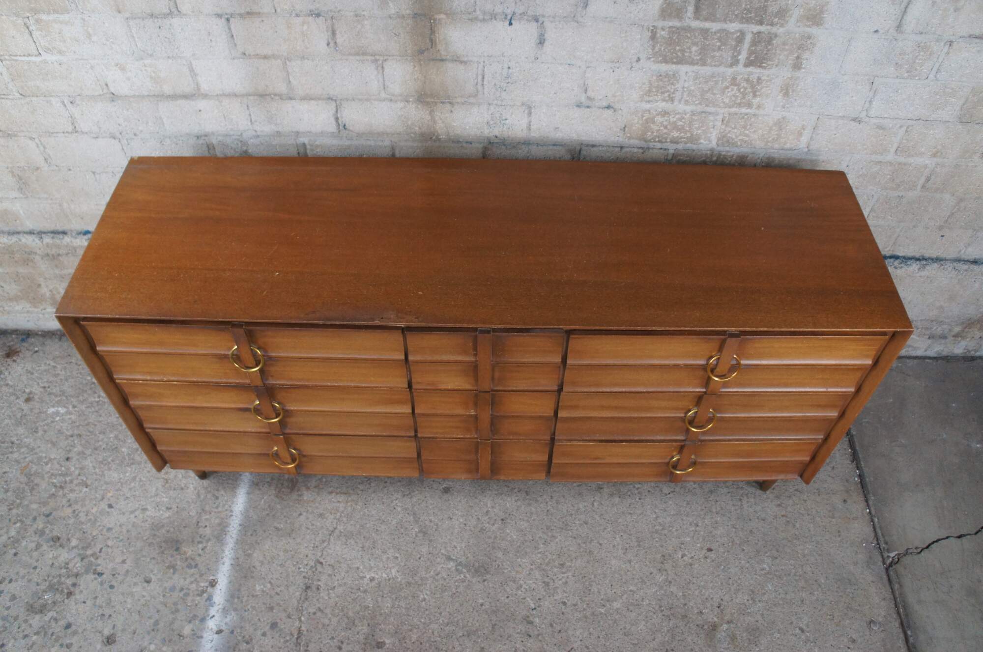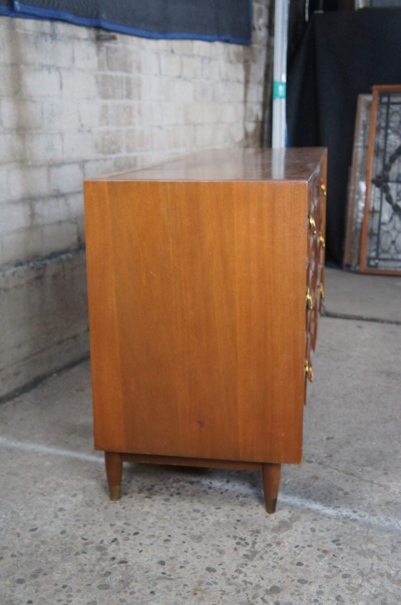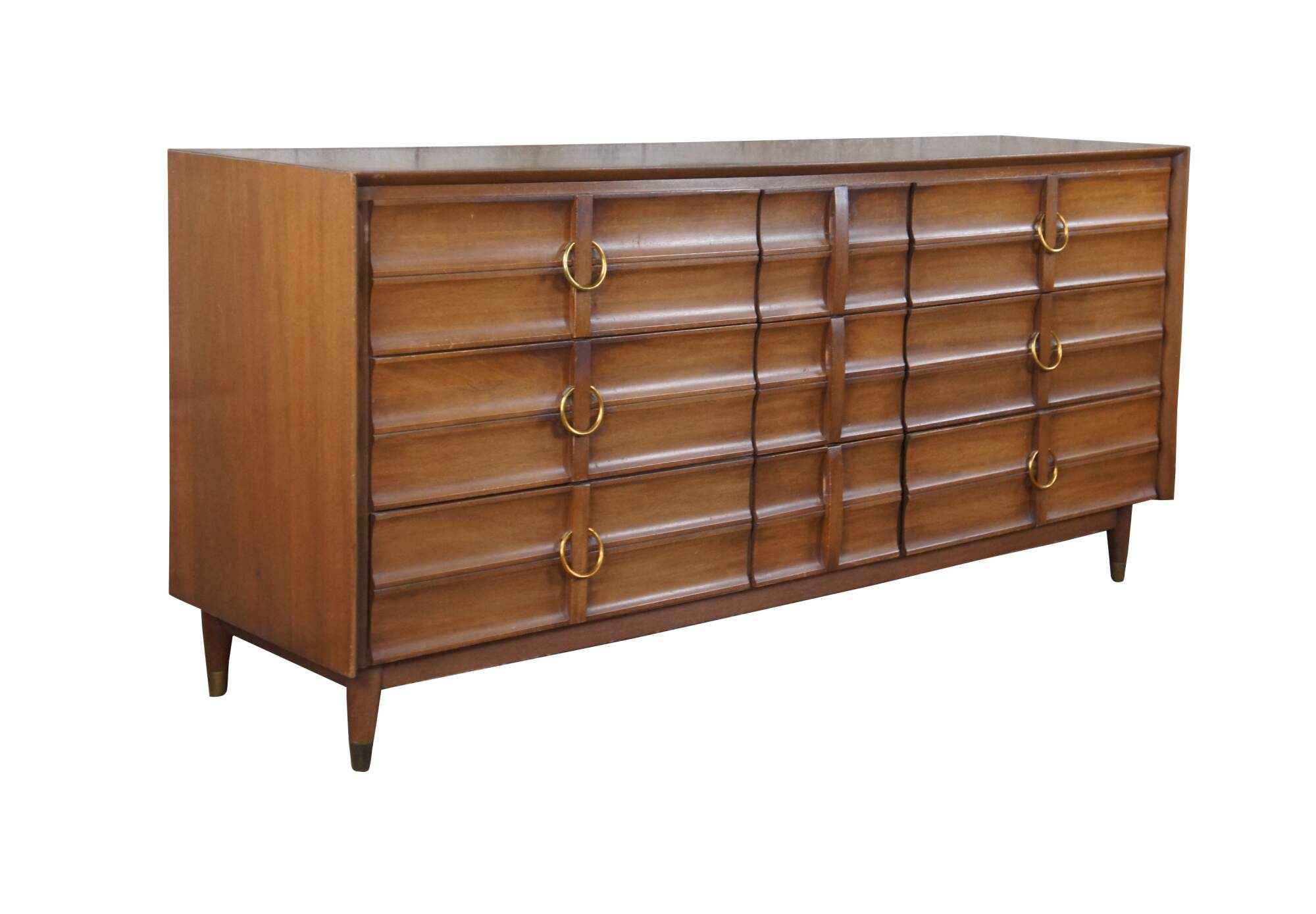 Mid Century Modern Hungerford of Memphis dresser or chest of drawers with vanity mirror. Made of mahogany featuring nine drawers with brass hardware, capped feet and rectangular mirror.