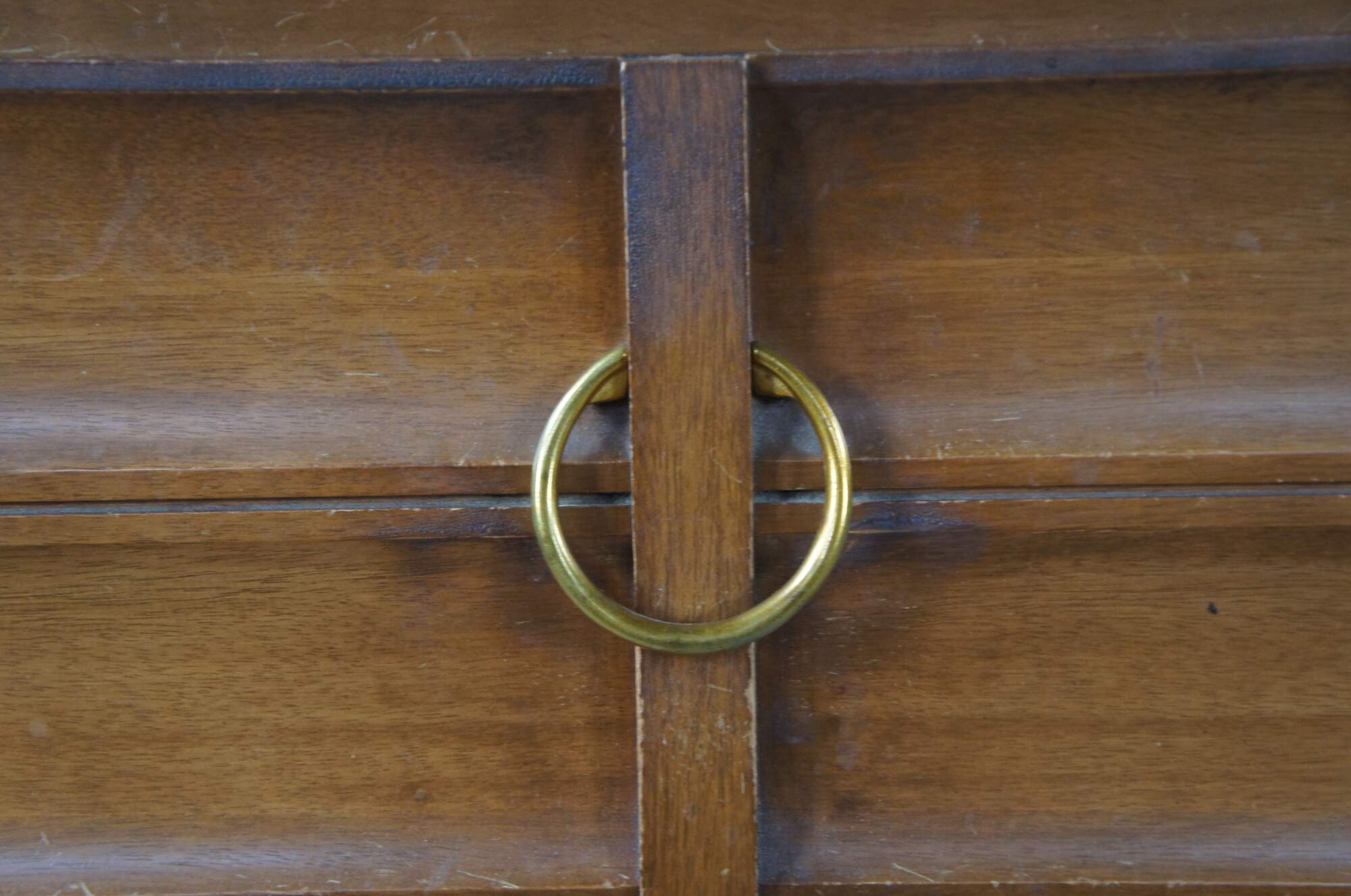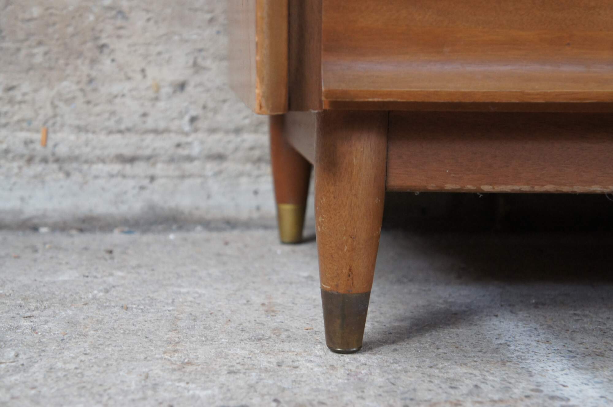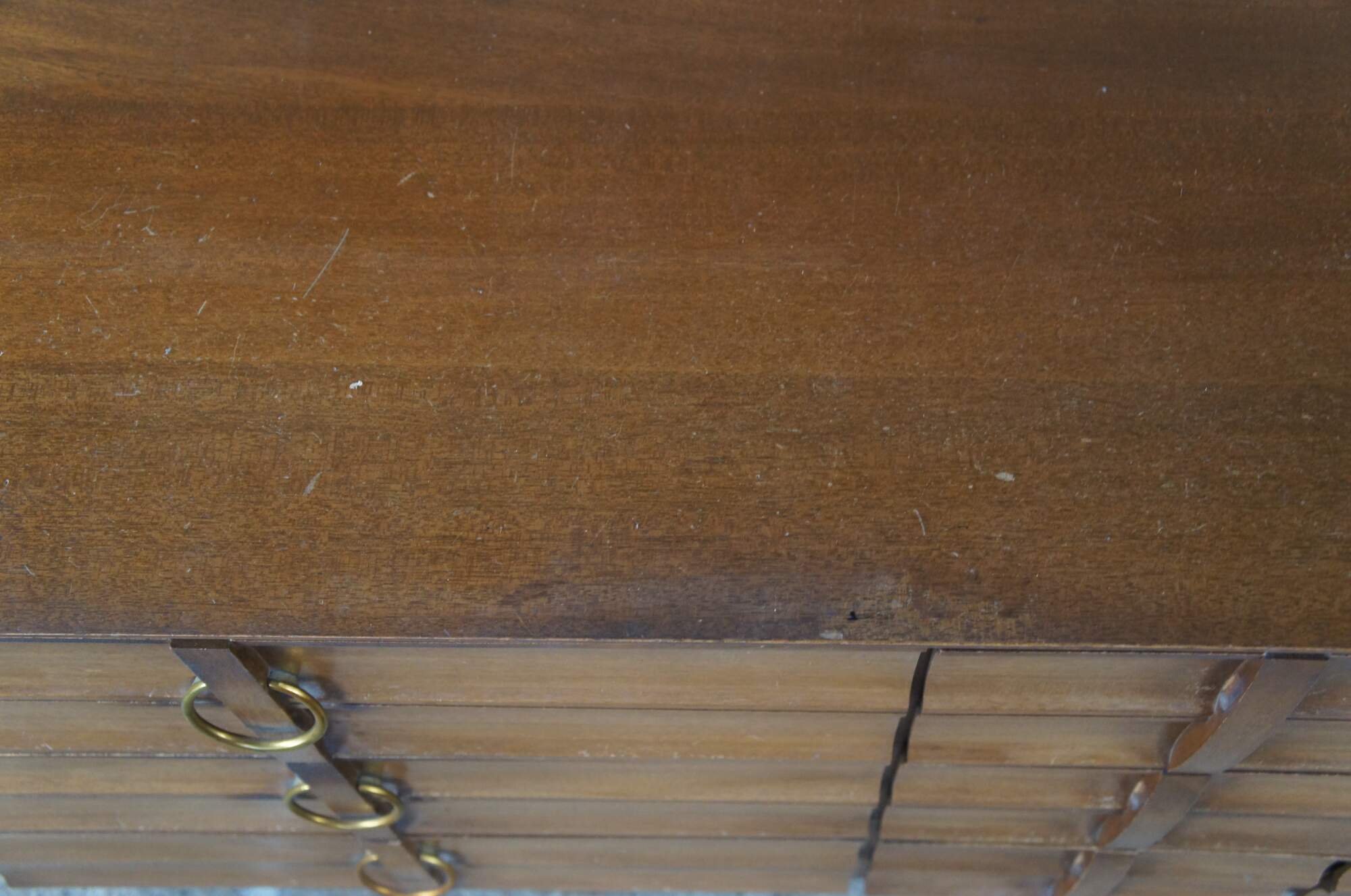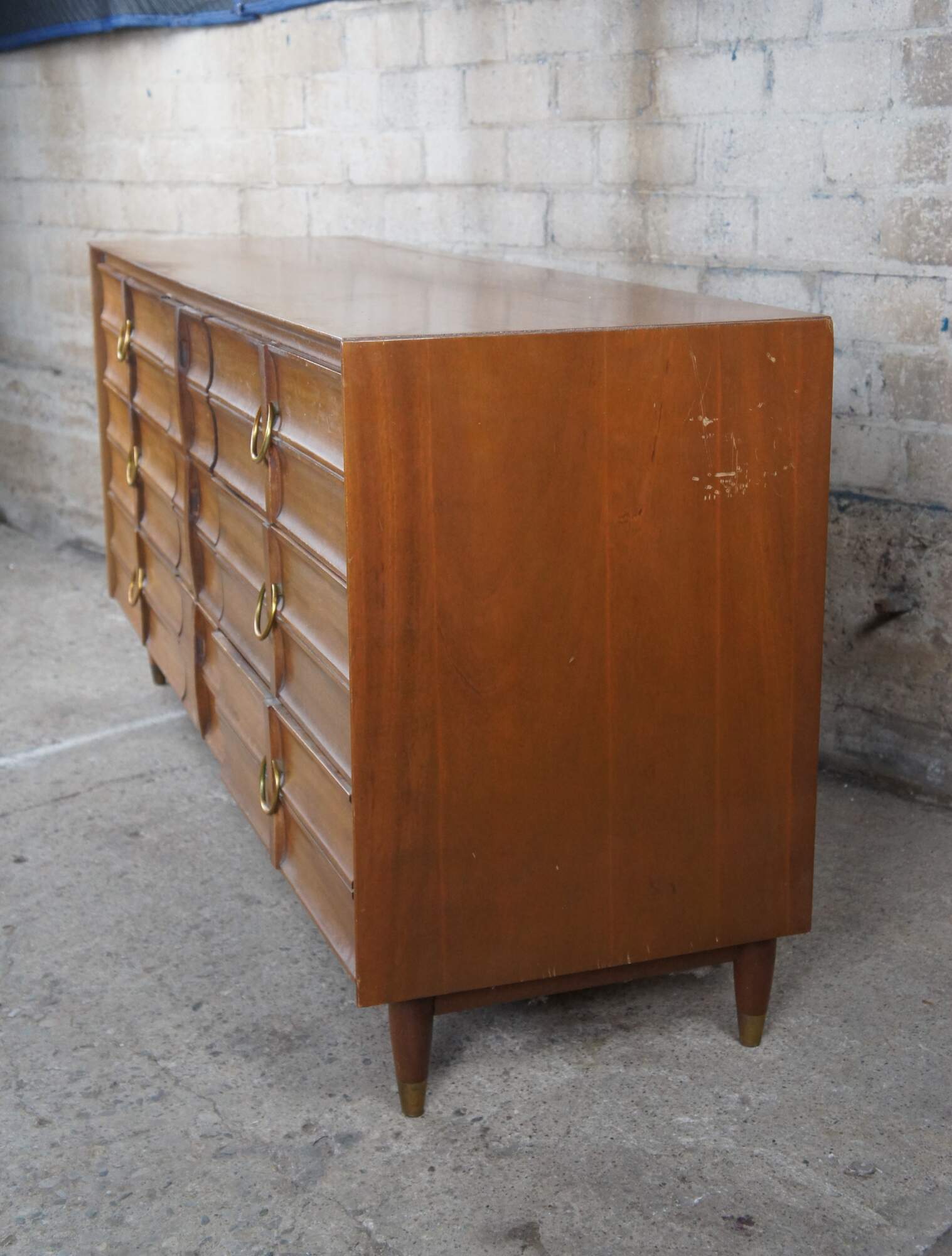Mid Century Modern Hungerford of Memphis dresser or chest of drawers with vanity mirror. Made of mahogany featuring nine drawers with brass hardware, capped feet and rectangular mirror.