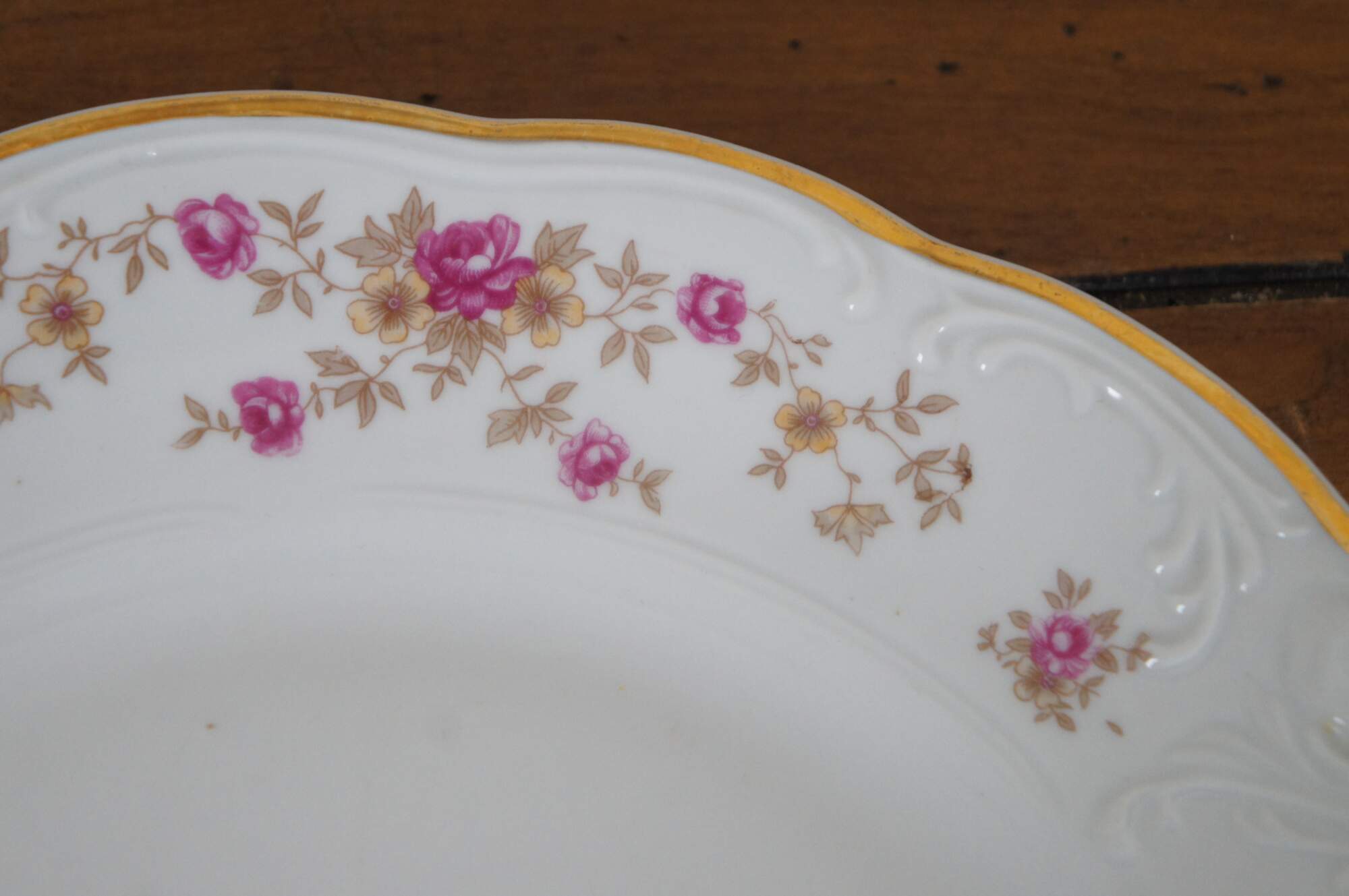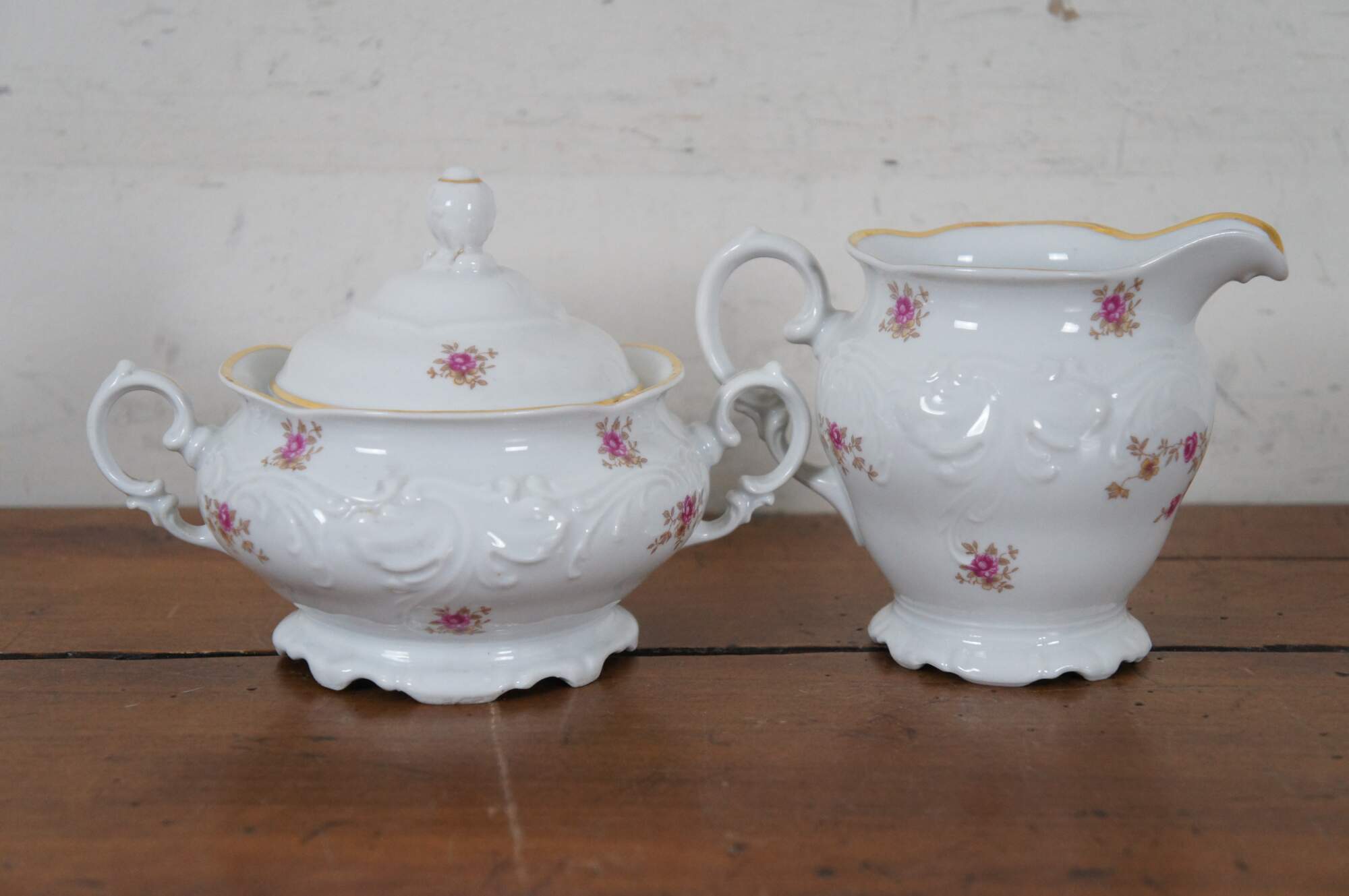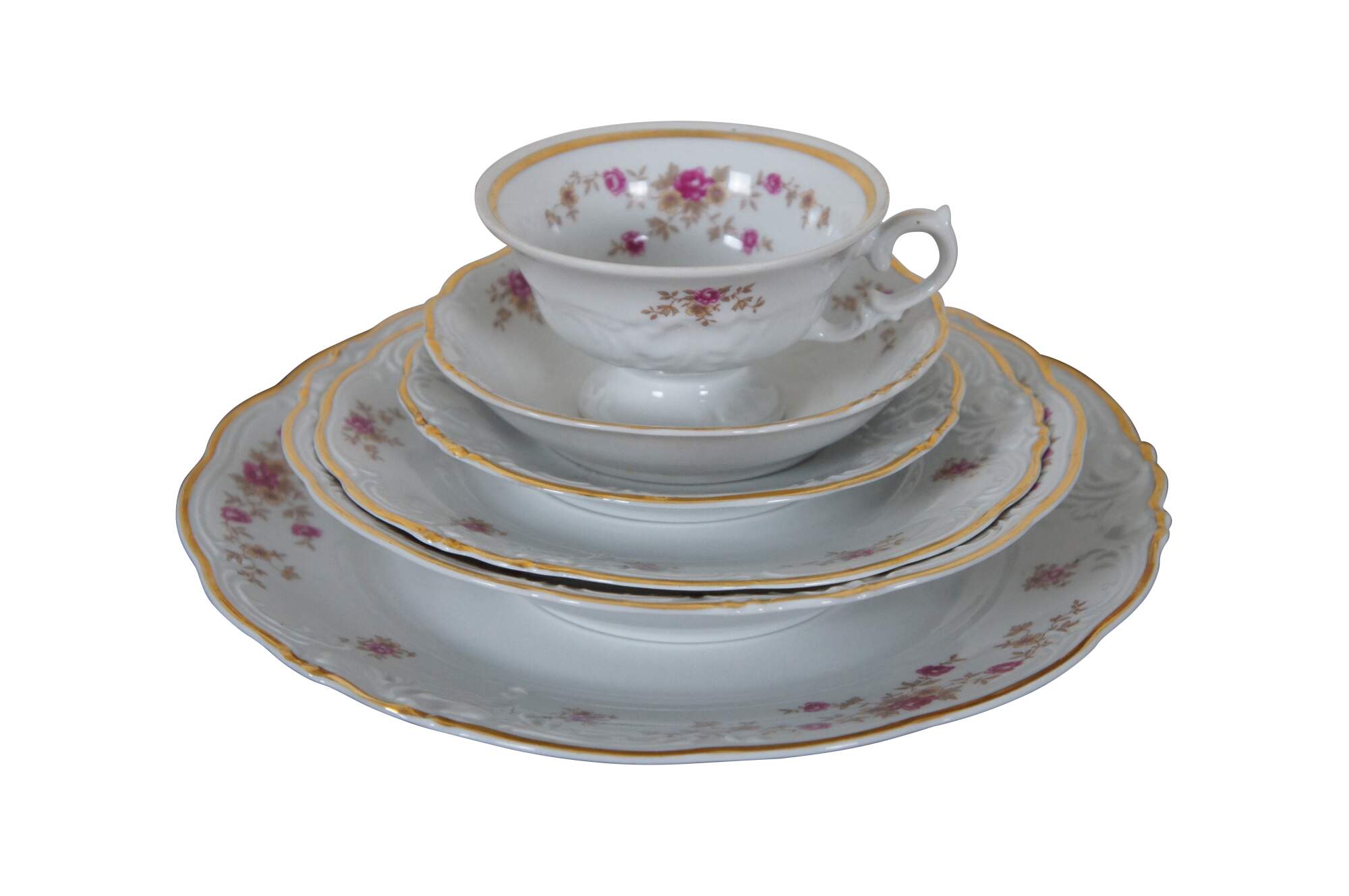 Vintage 57 piece dinnerware set by Walbrzych Porcelain Factory. Service for 8. Pattern number 3731 featuring gilded scalloped edges, embossed foliate swirls, and a printed floral branch design of pink roses and yellow primroses. Made in Poland.
