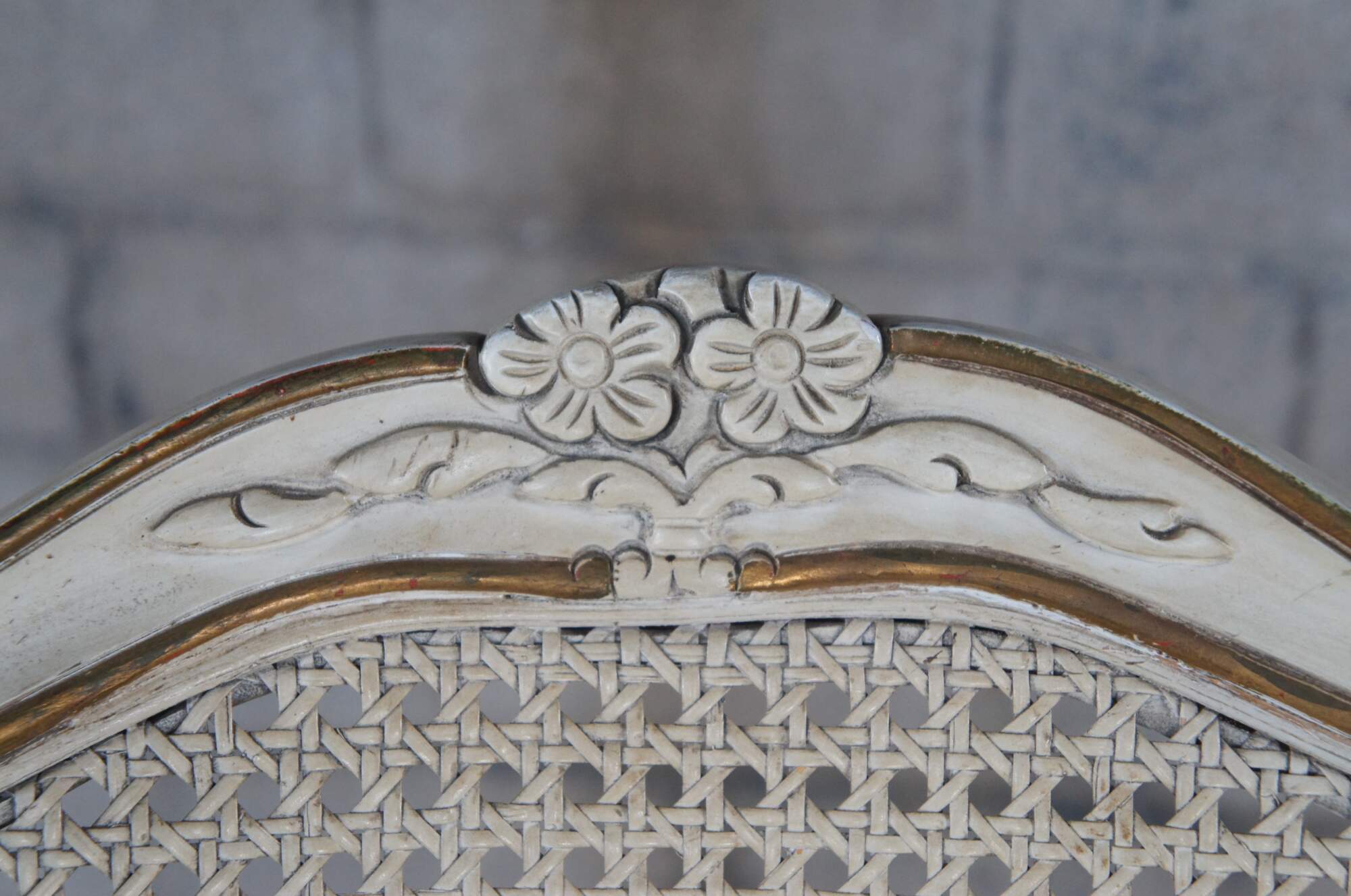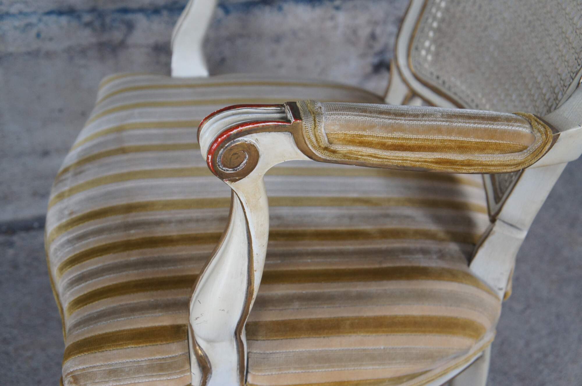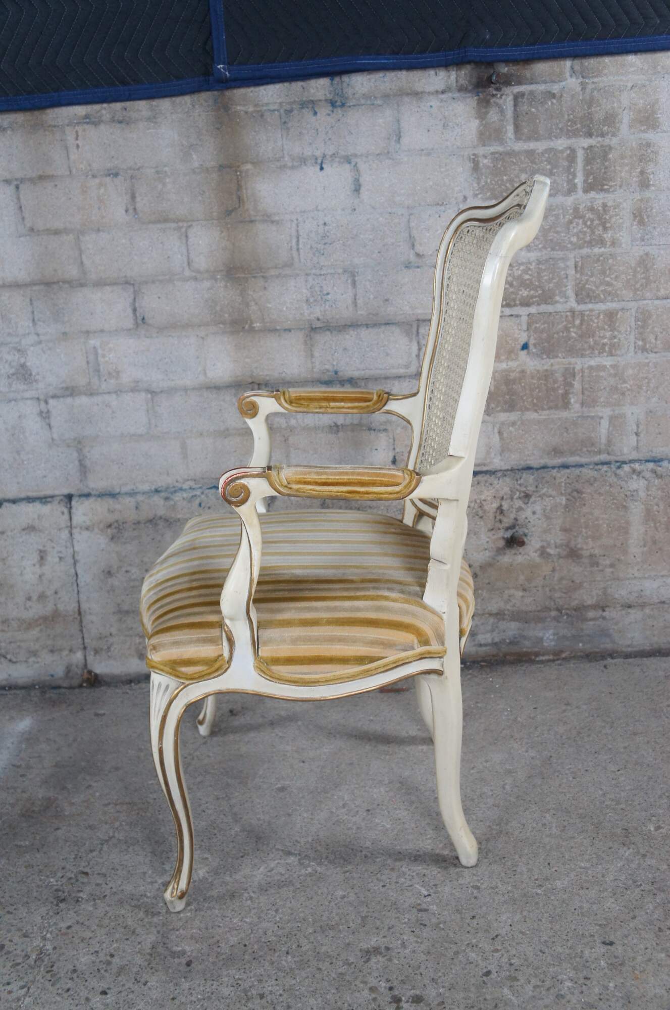 Vintage set of six Kindel Furniture Co. french provincial dining chairs featuring serpentine form with caned back, fauteuil arms, white and gold painted accents and striped velvet fabric. Made by Michigan Chair Co of Grand Rapids, circa 1978.
