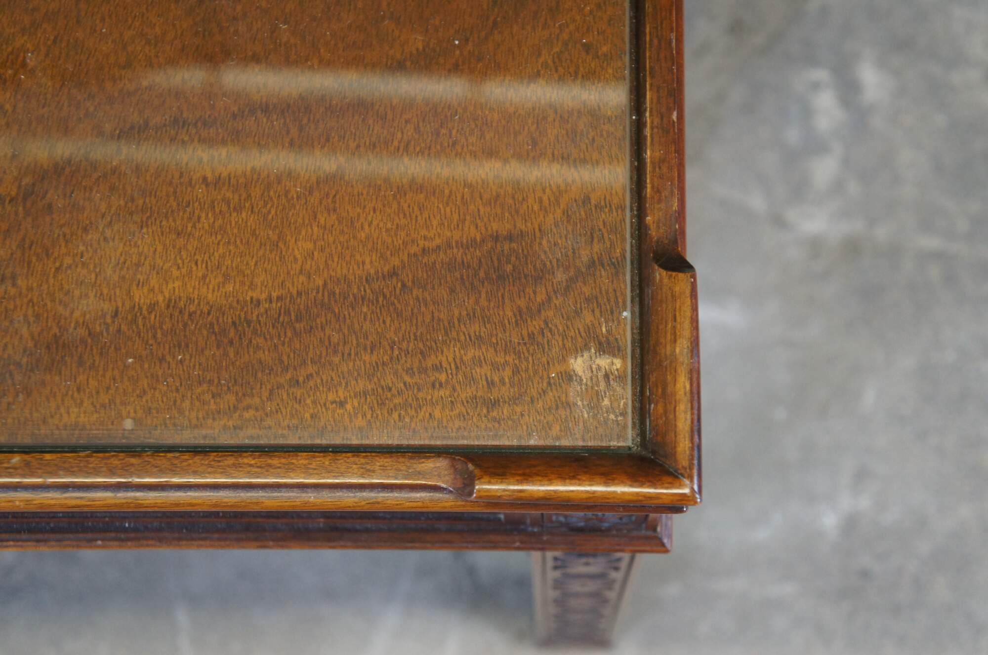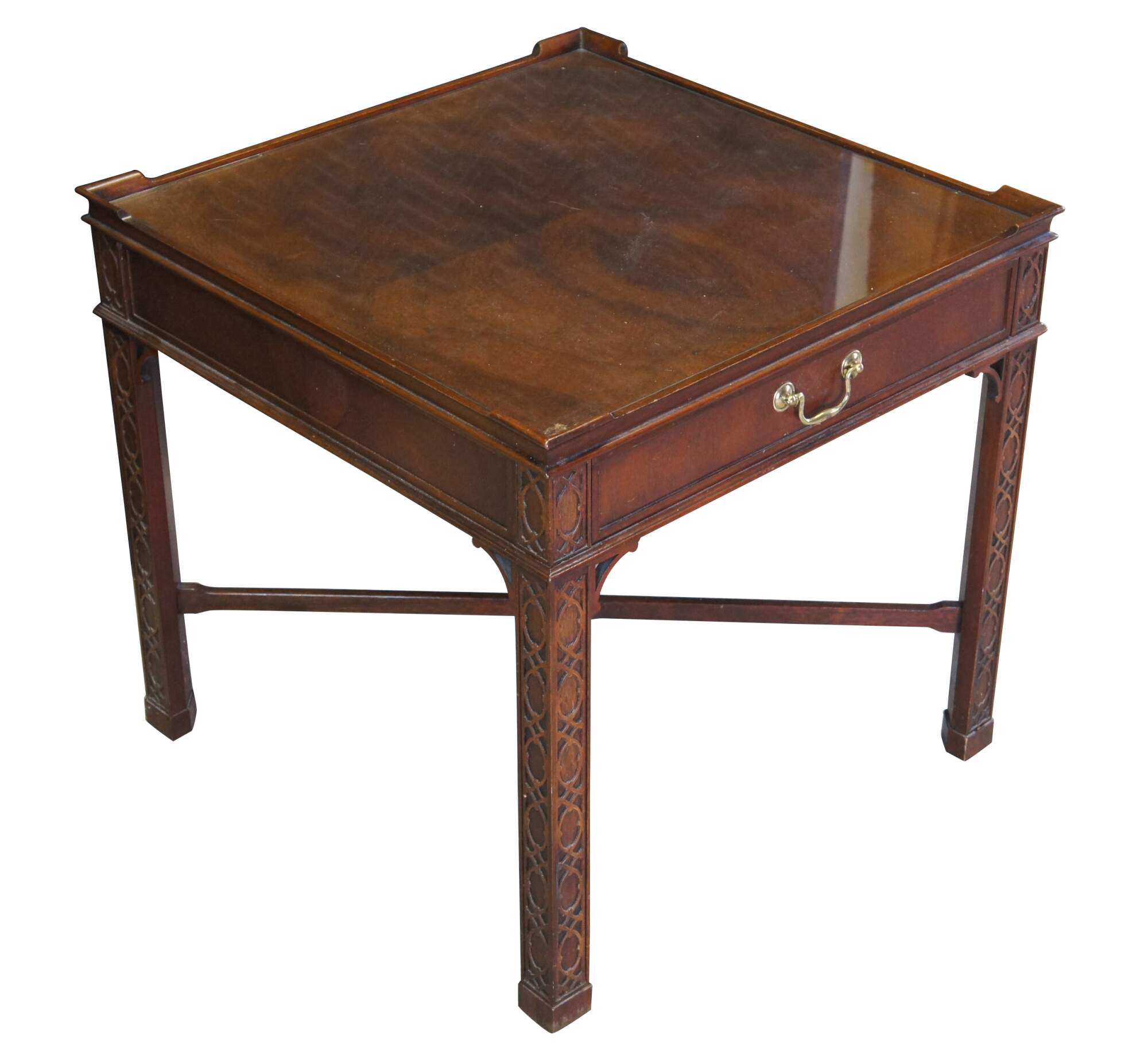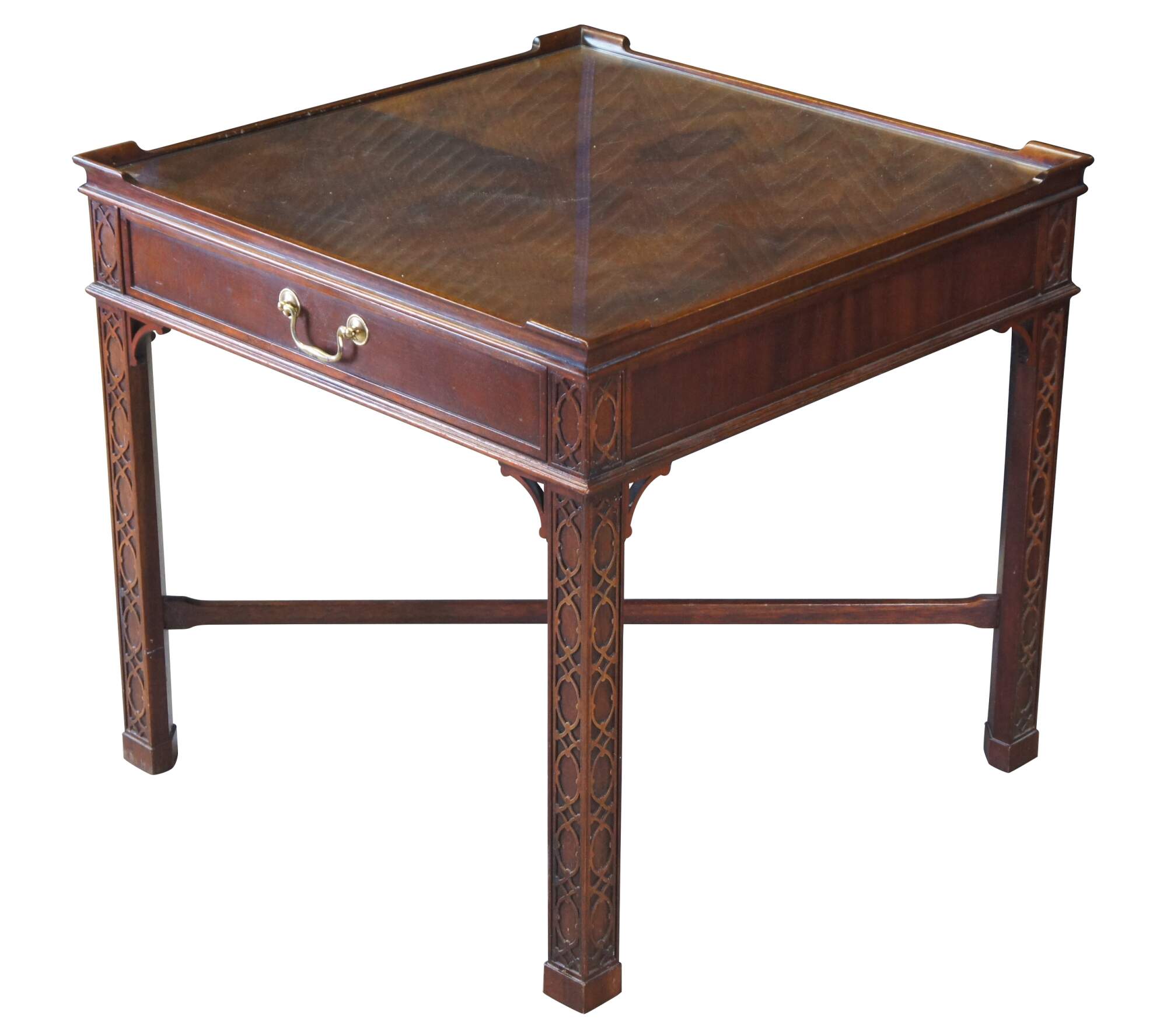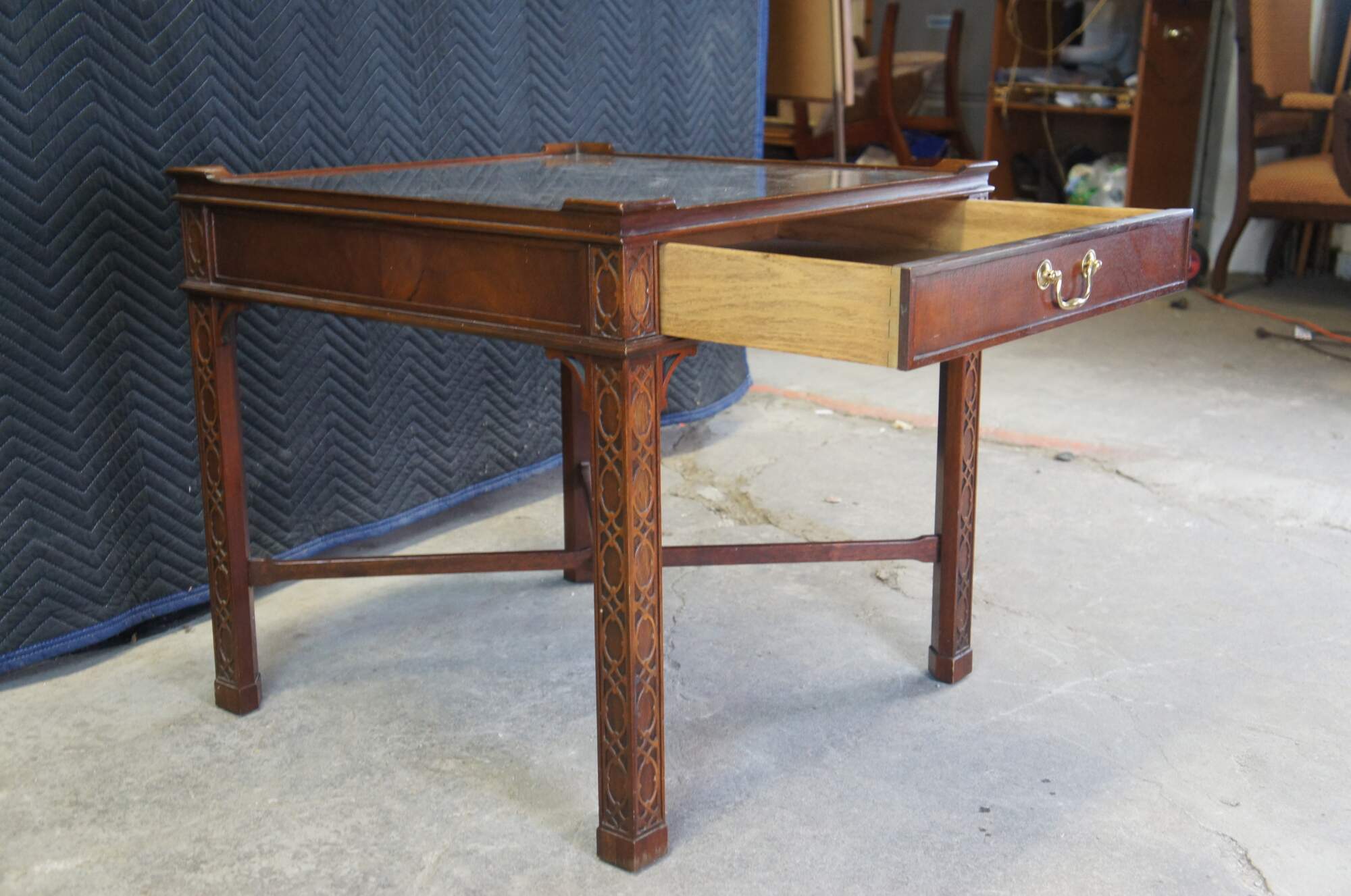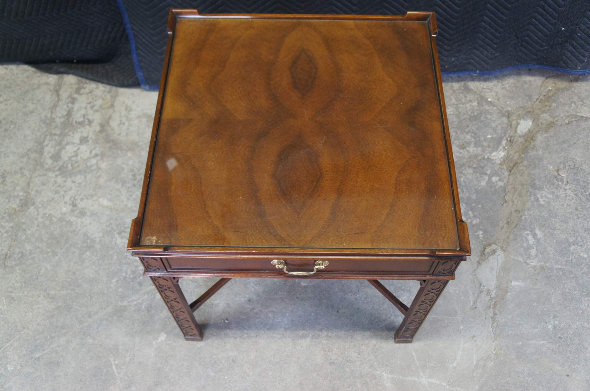 A regal occasional table by Baker Furniture, Circa last quarter 20th century. Inspired by English Georgian & Chinese Chippendale styling. Features a mahogany frame with inset matchbook veneered top and protective glass covering. The table is centered by one dovetailed oak drawer with brass bale hardware. Drawer is marked along the left side with Baker's signature silver metal tag. The square rear chamfered Marlborough legs feature carved fretwork and are accented along the top by triangular spandrels. The legs are connected by an X stretcher. A truly remarkable example of craftsmanship that will add grandeur to any space.