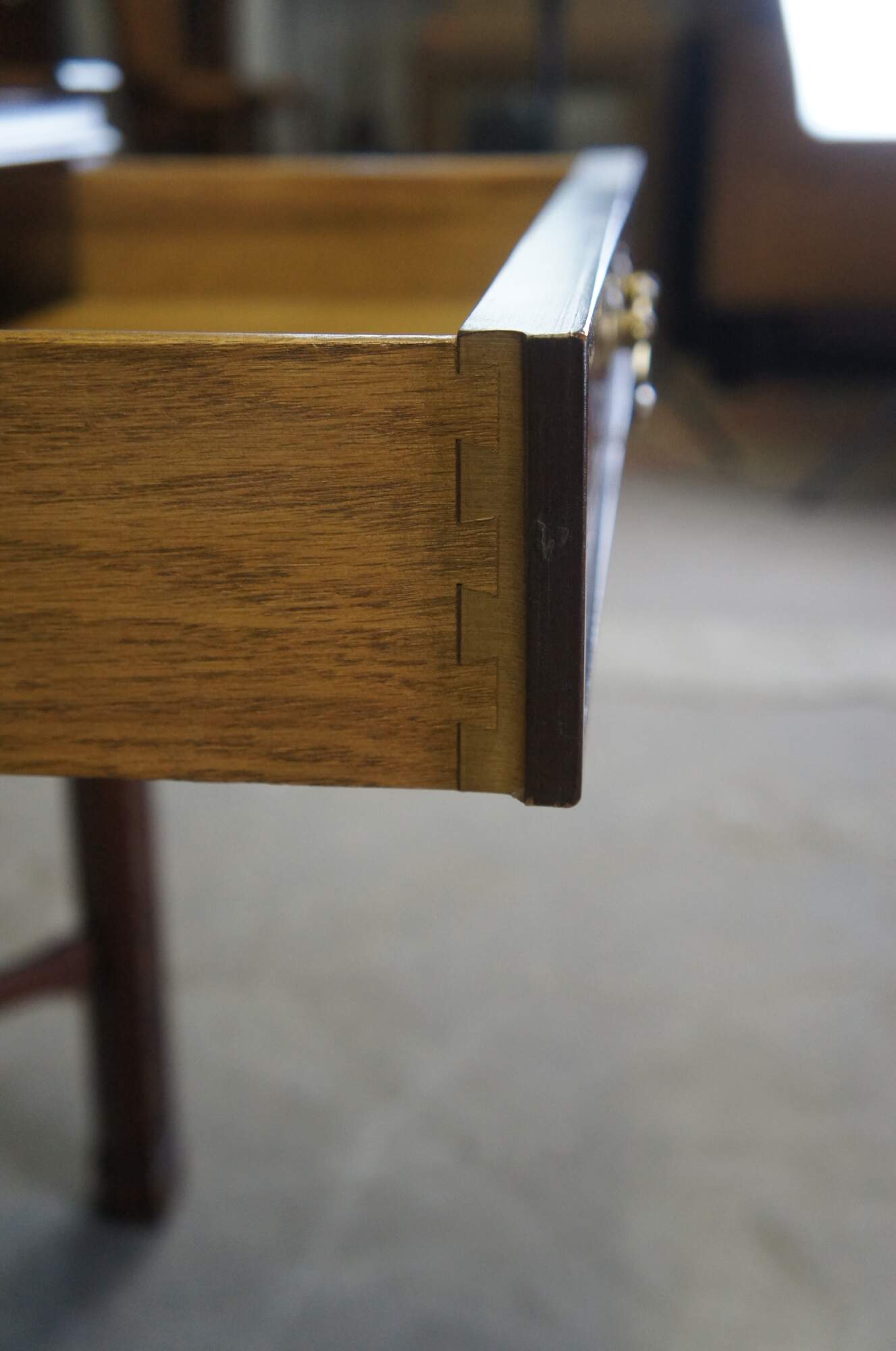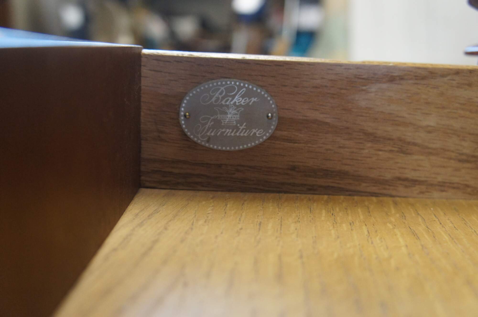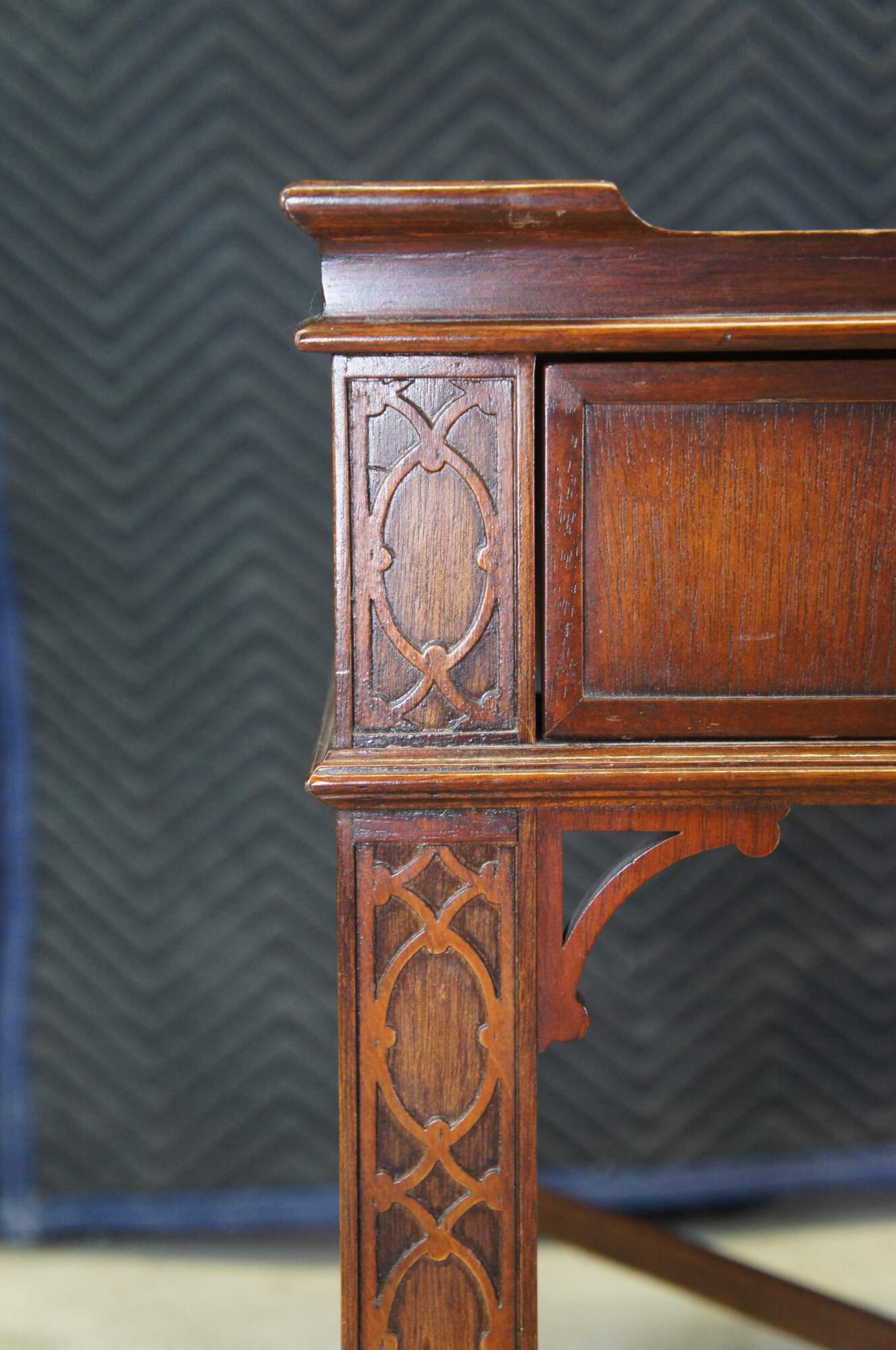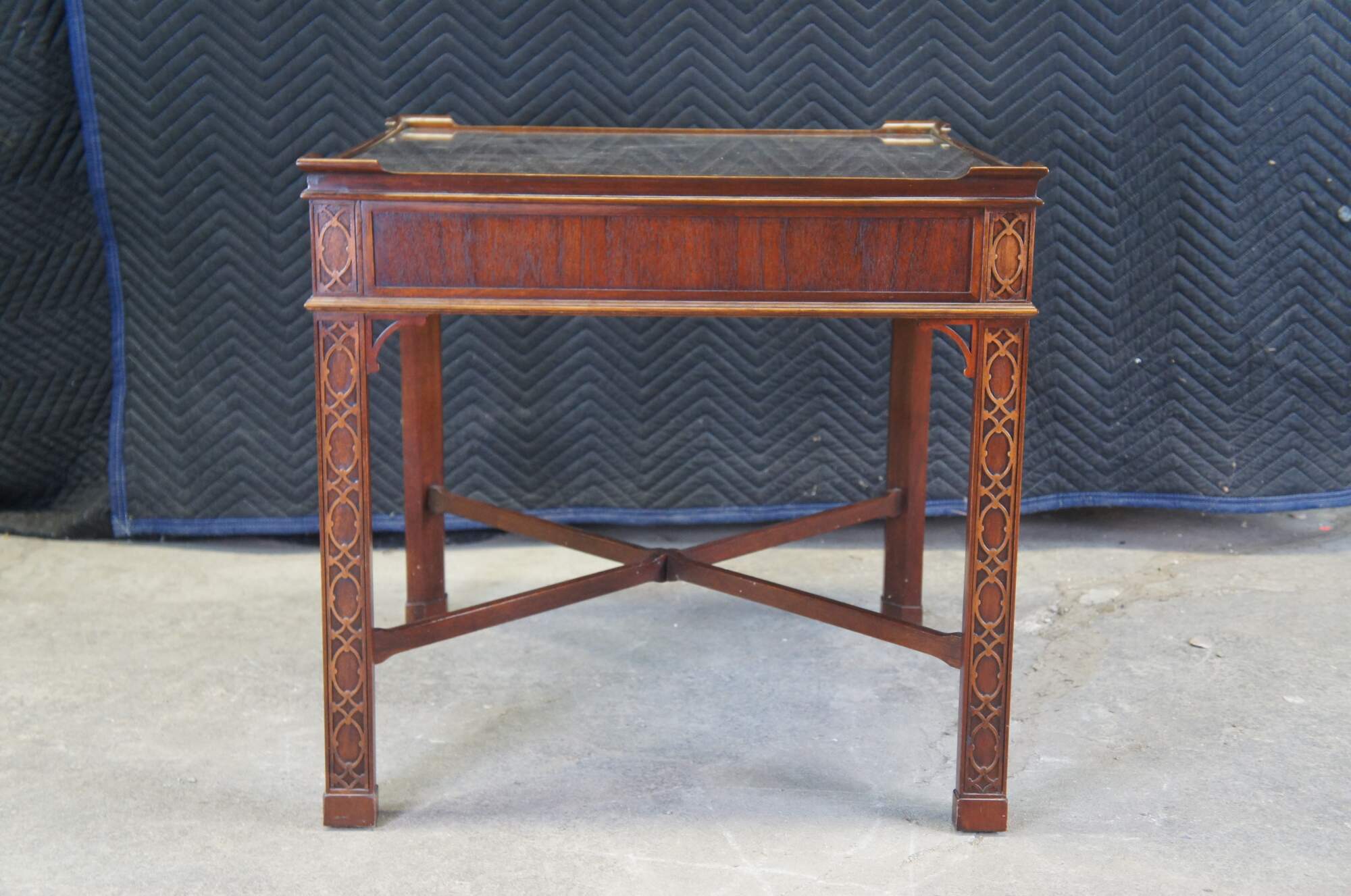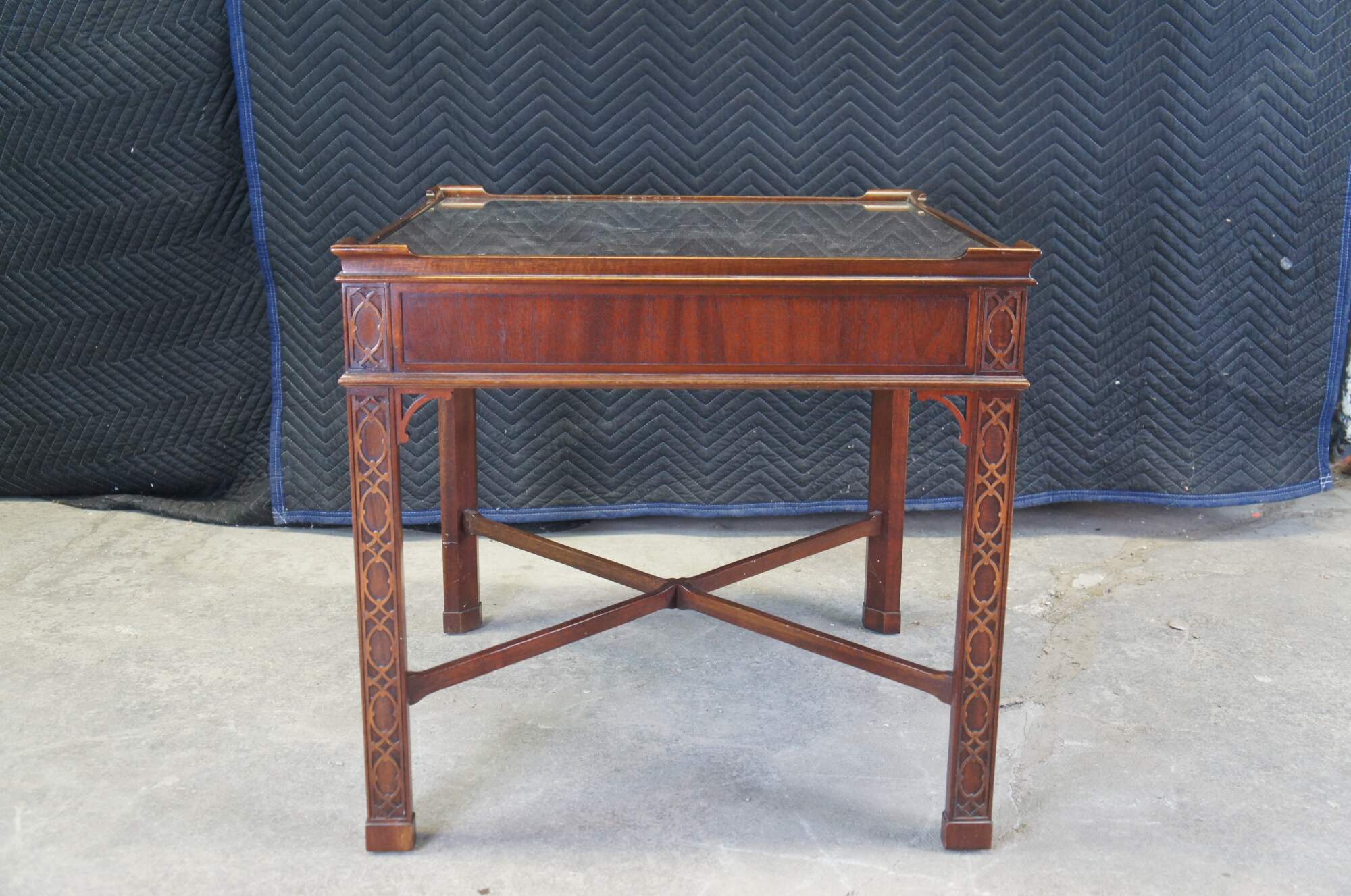 A regal occasional table by Baker Furniture, Circa last quarter 20th century. Inspired by English Georgian & Chinese Chippendale styling. Features a mahogany frame with inset matchbook veneered top and protective glass covering. The table is centered by one dovetailed oak drawer with brass bale hardware. Drawer is marked along the left side with Baker's signature silver metal tag. The square rear chamfered Marlborough legs feature carved fretwork and are accented along the top by triangular spandrels. The legs are connected by an X stretcher. A truly remarkable example of craftsmanship that will add grandeur to any space.