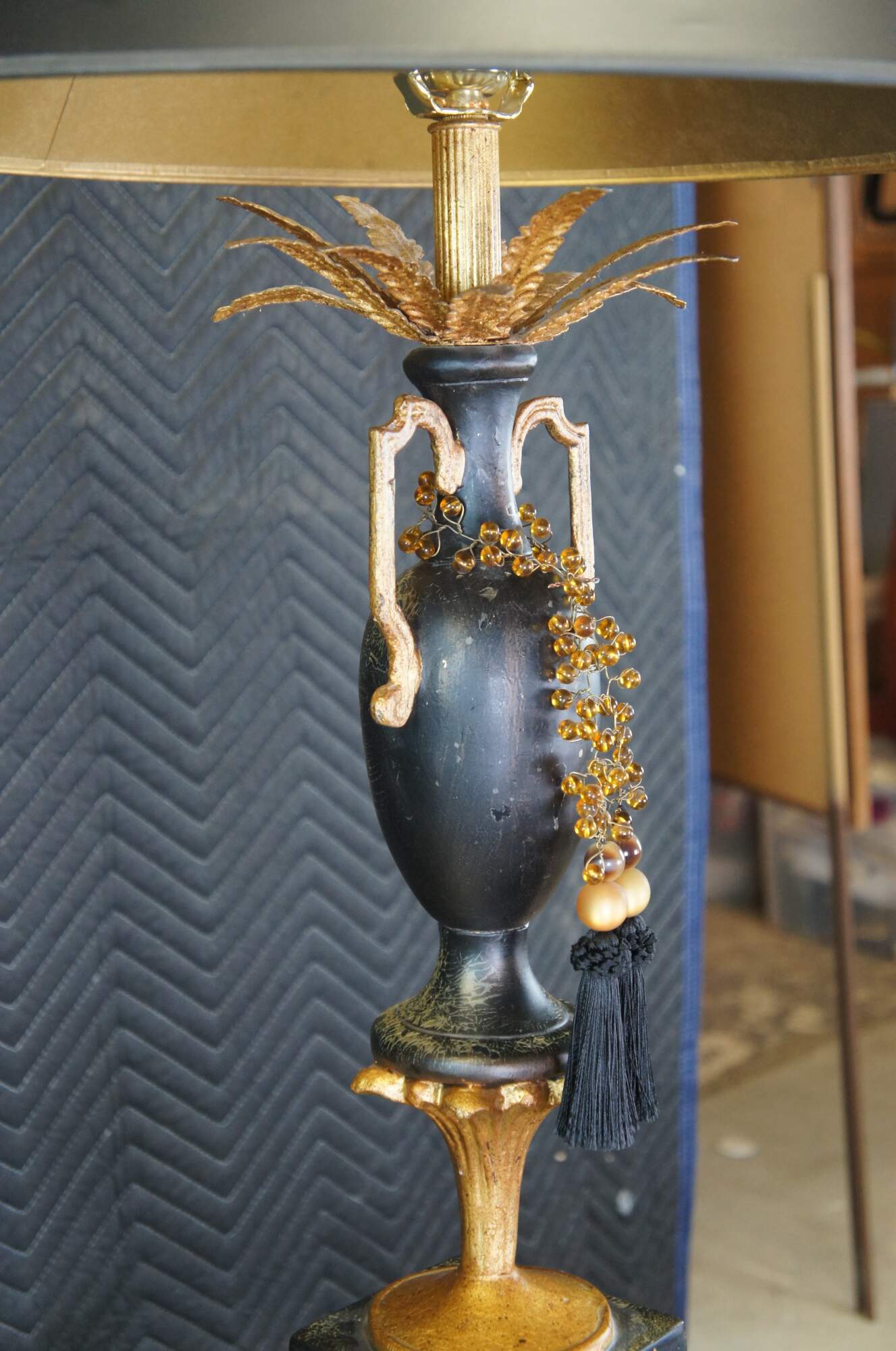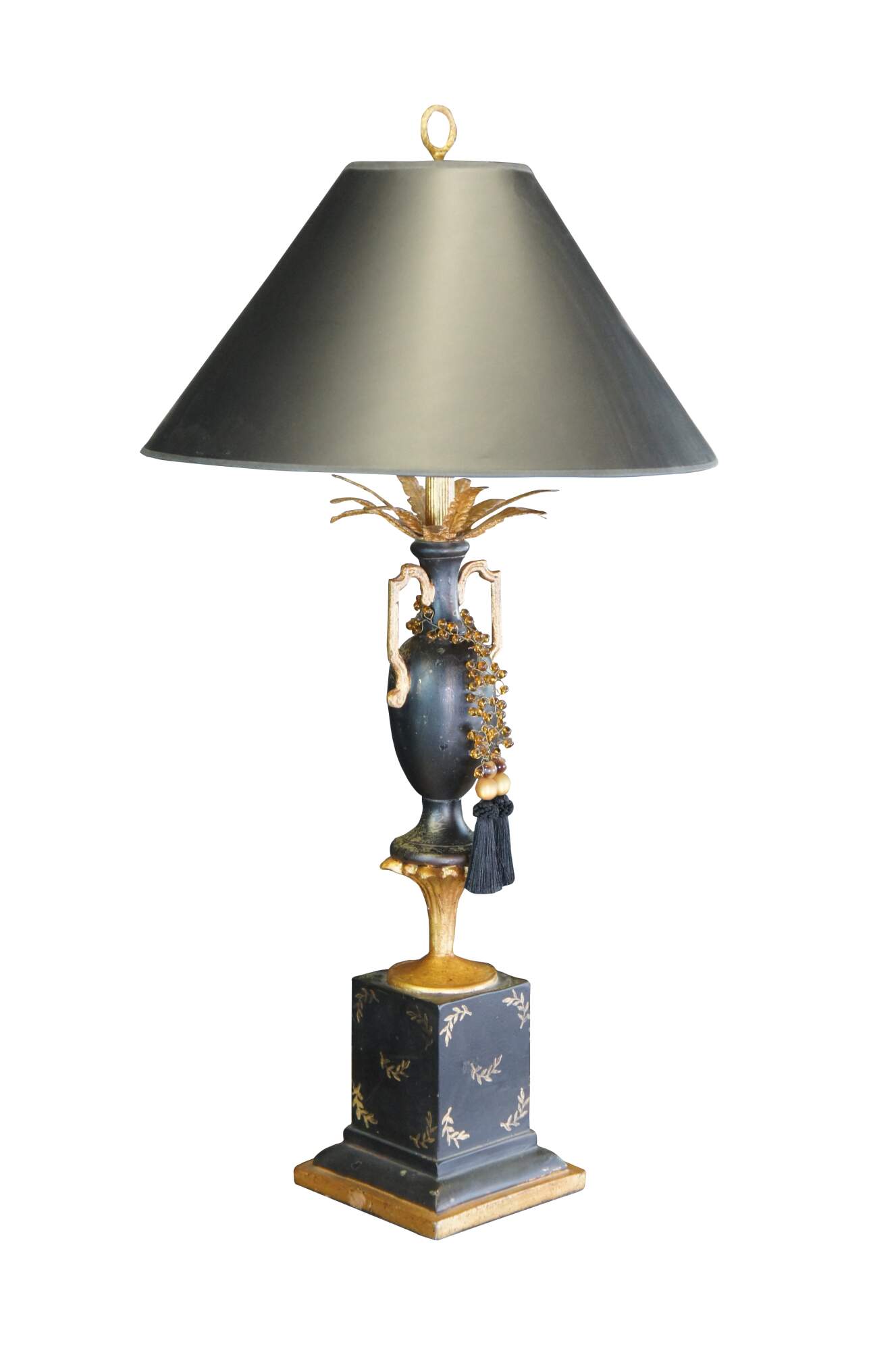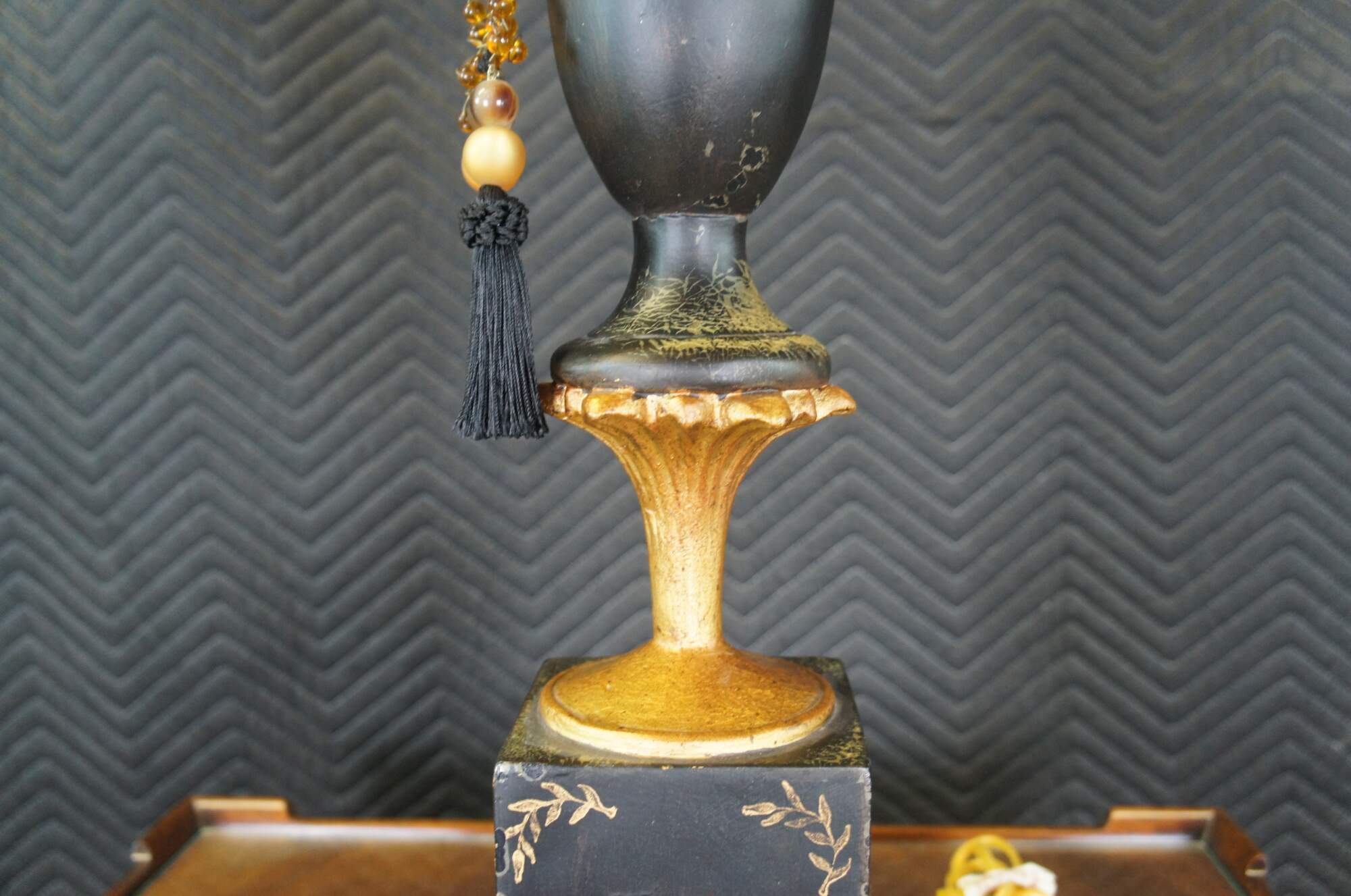 Vintage Neoclassical black and gold painted lamp featuring a handled vase with gold feathers and amber bead tassels atop a golden pedestal.