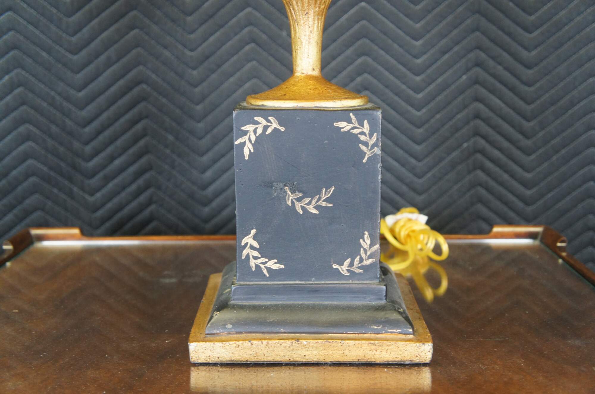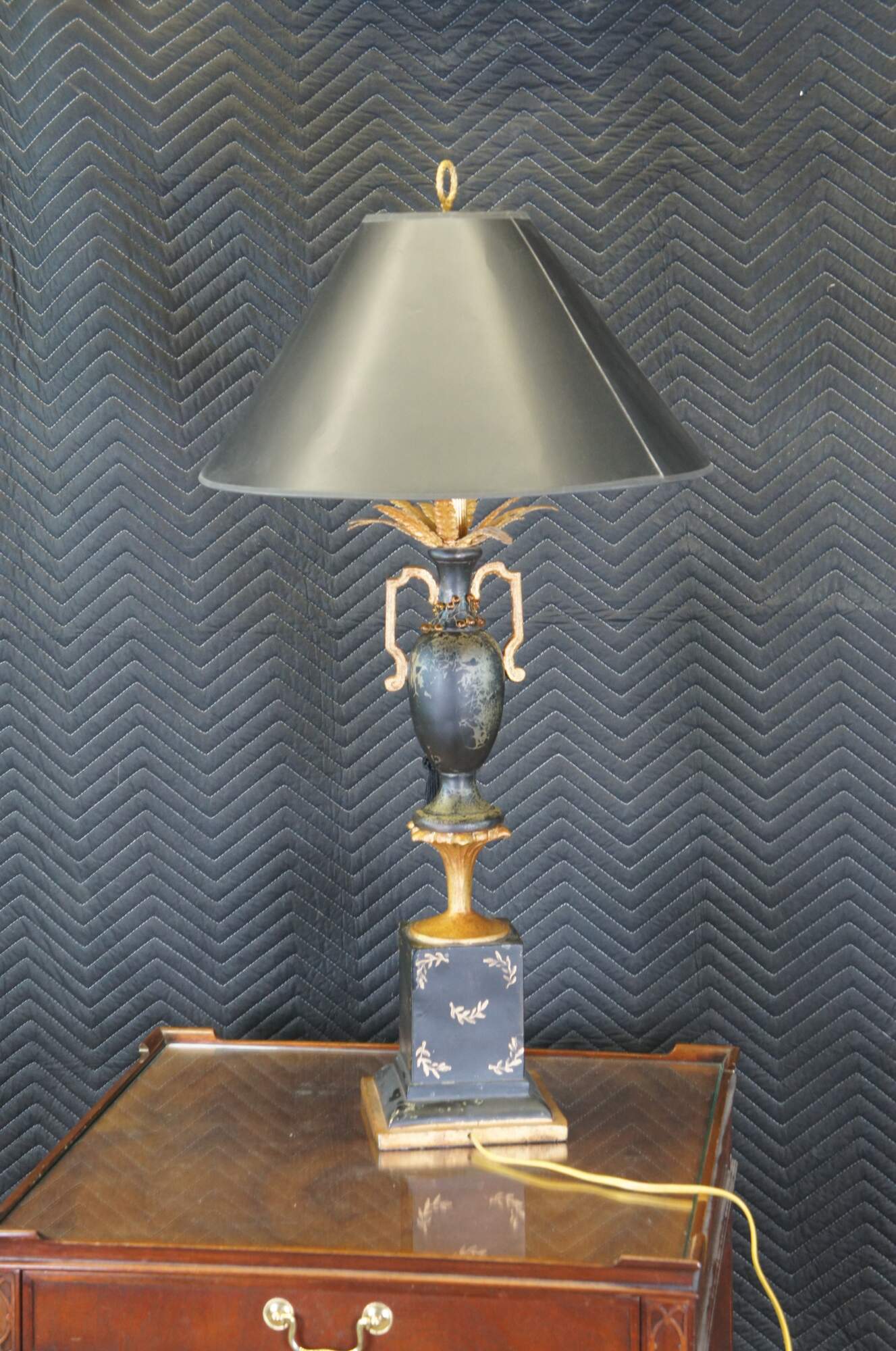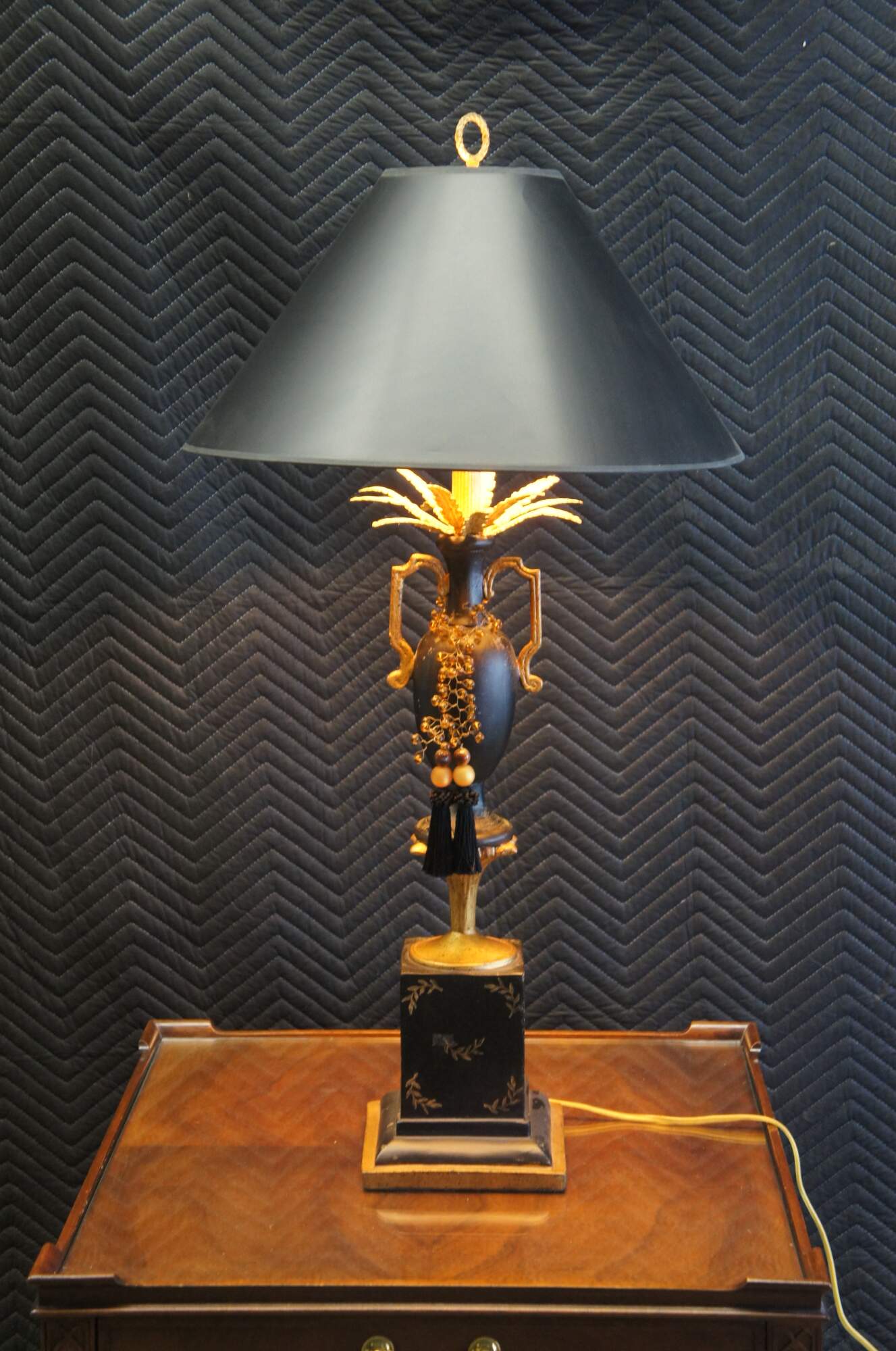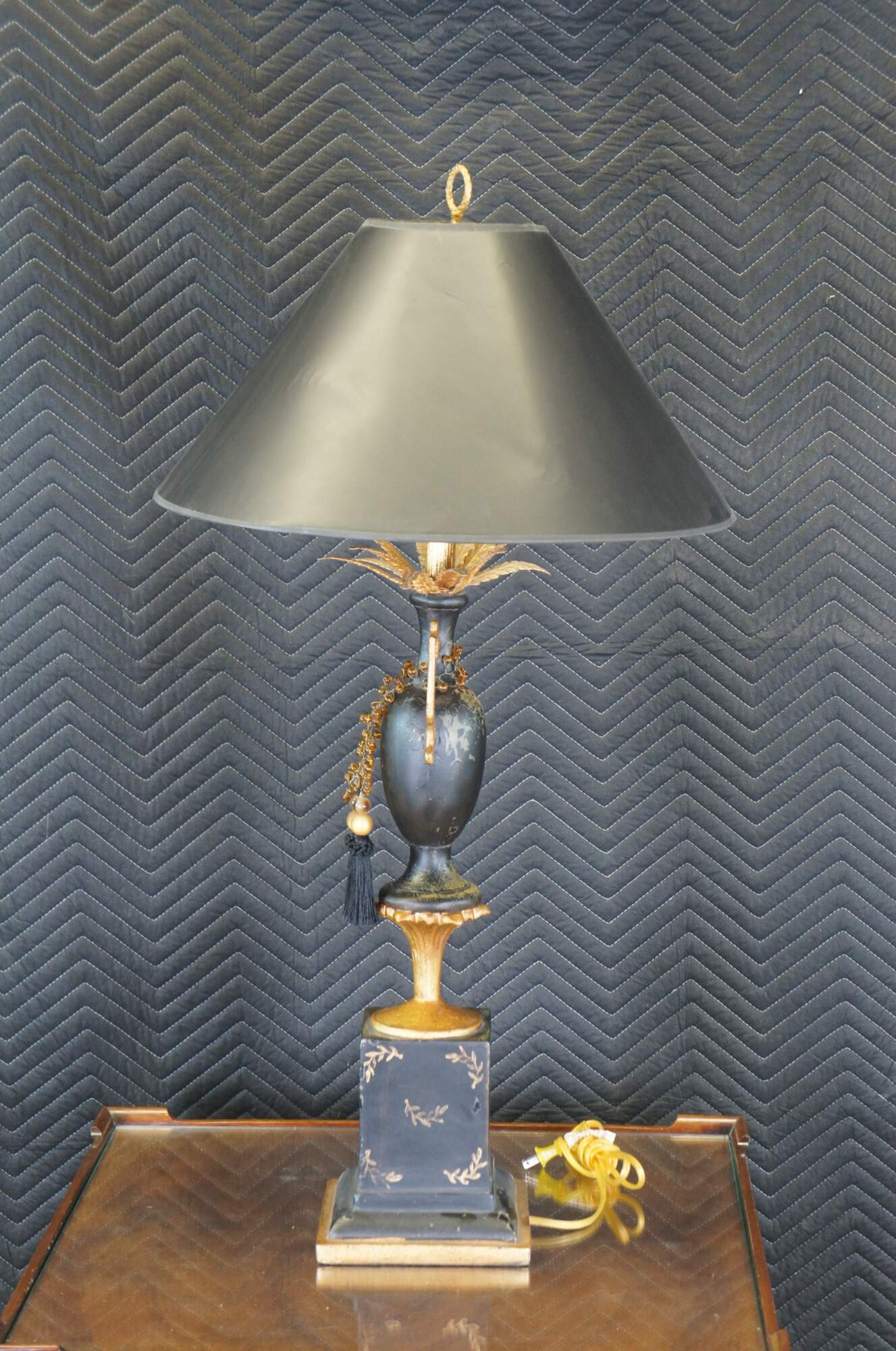 Vintage Neoclassical black and gold painted lamp featuring a handled vase with gold feathers and amber bead tassels atop a golden pedestal.