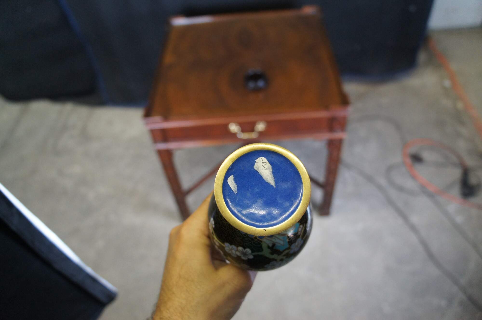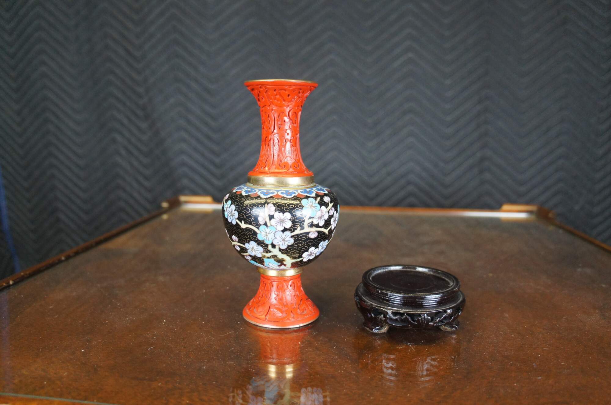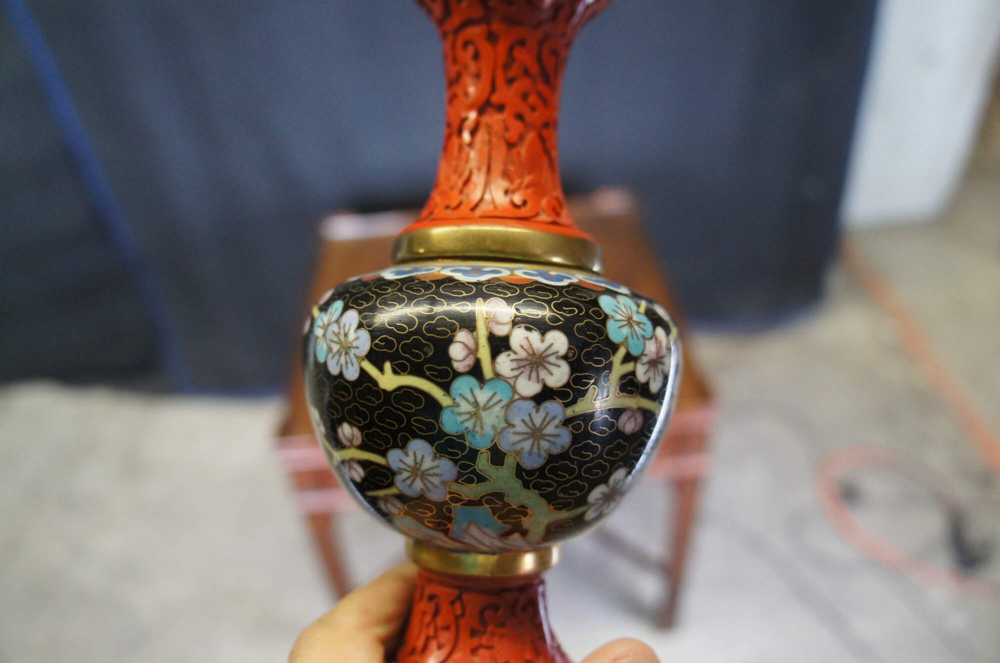 Antique Chinese Chinoiserie vase featuring carved Cinnabar with brass accents and enameled Cherry Blossoms on a field of black clouds. Includes footed base stand.