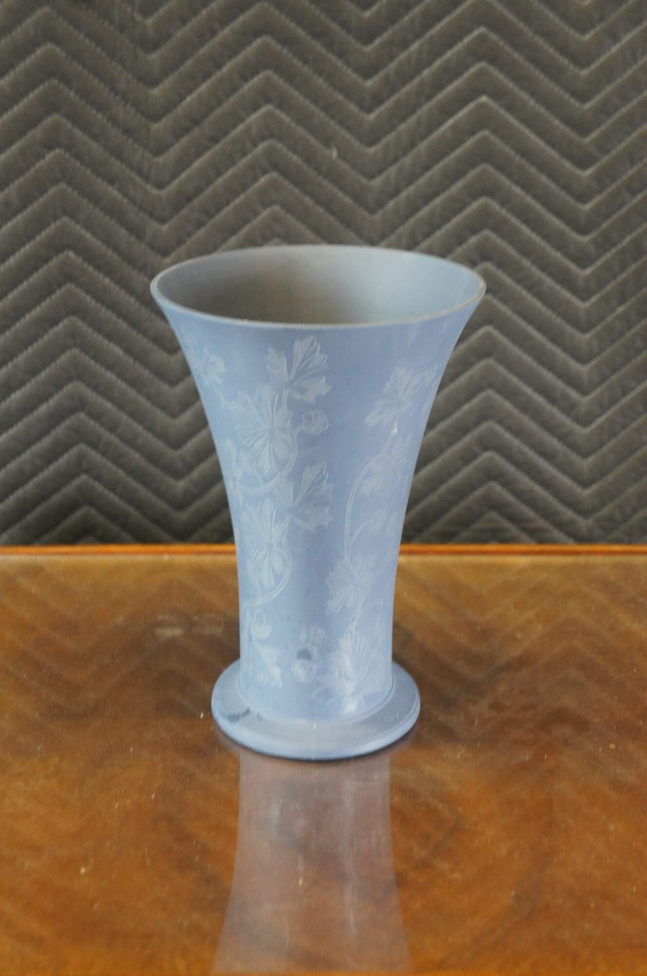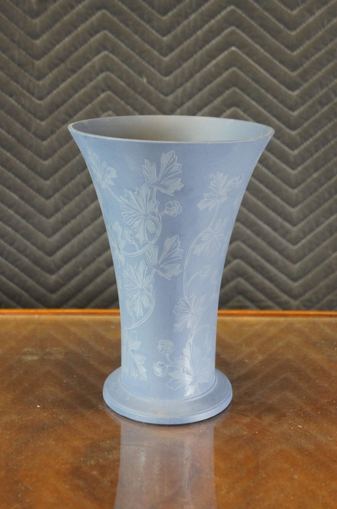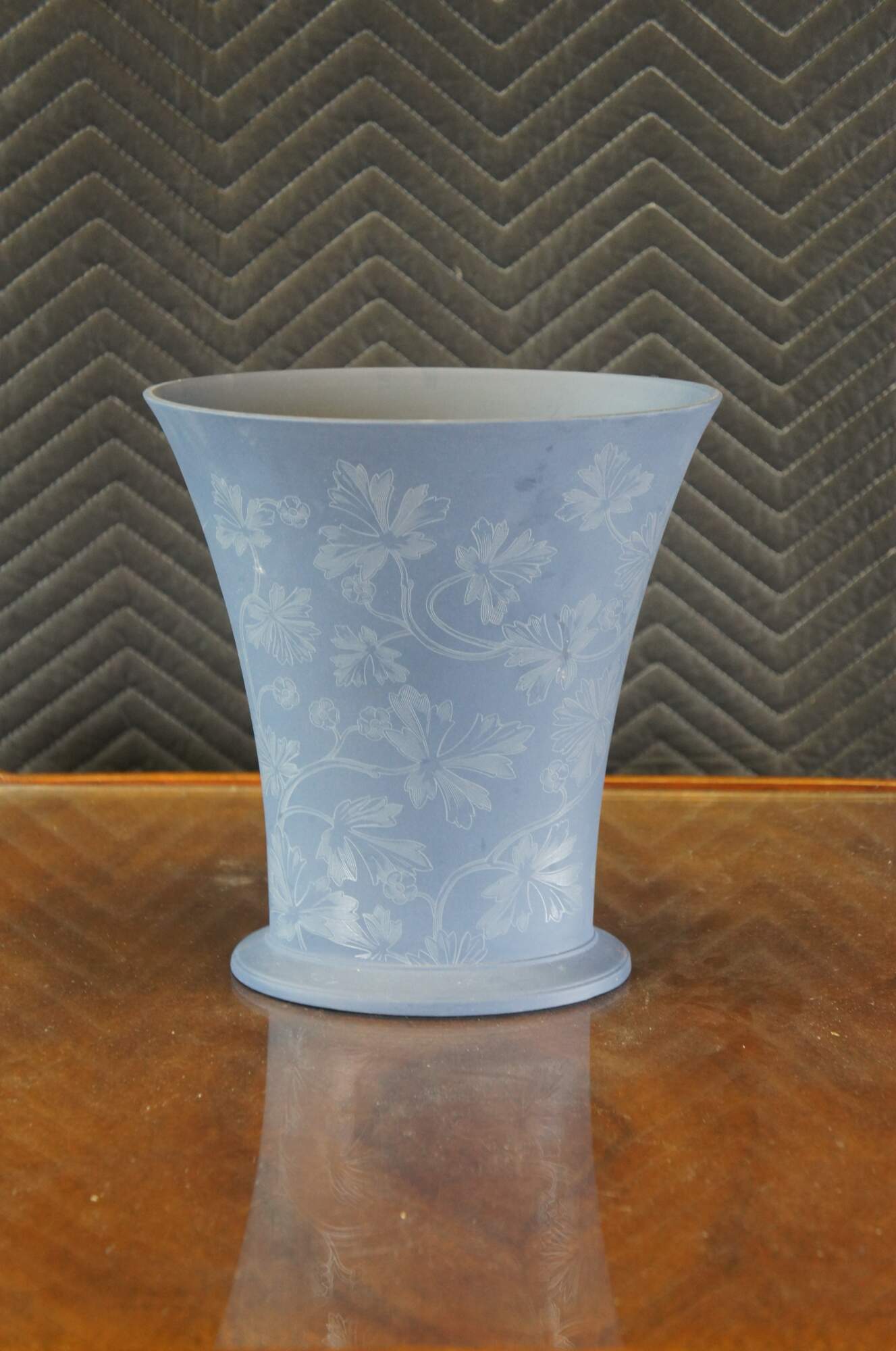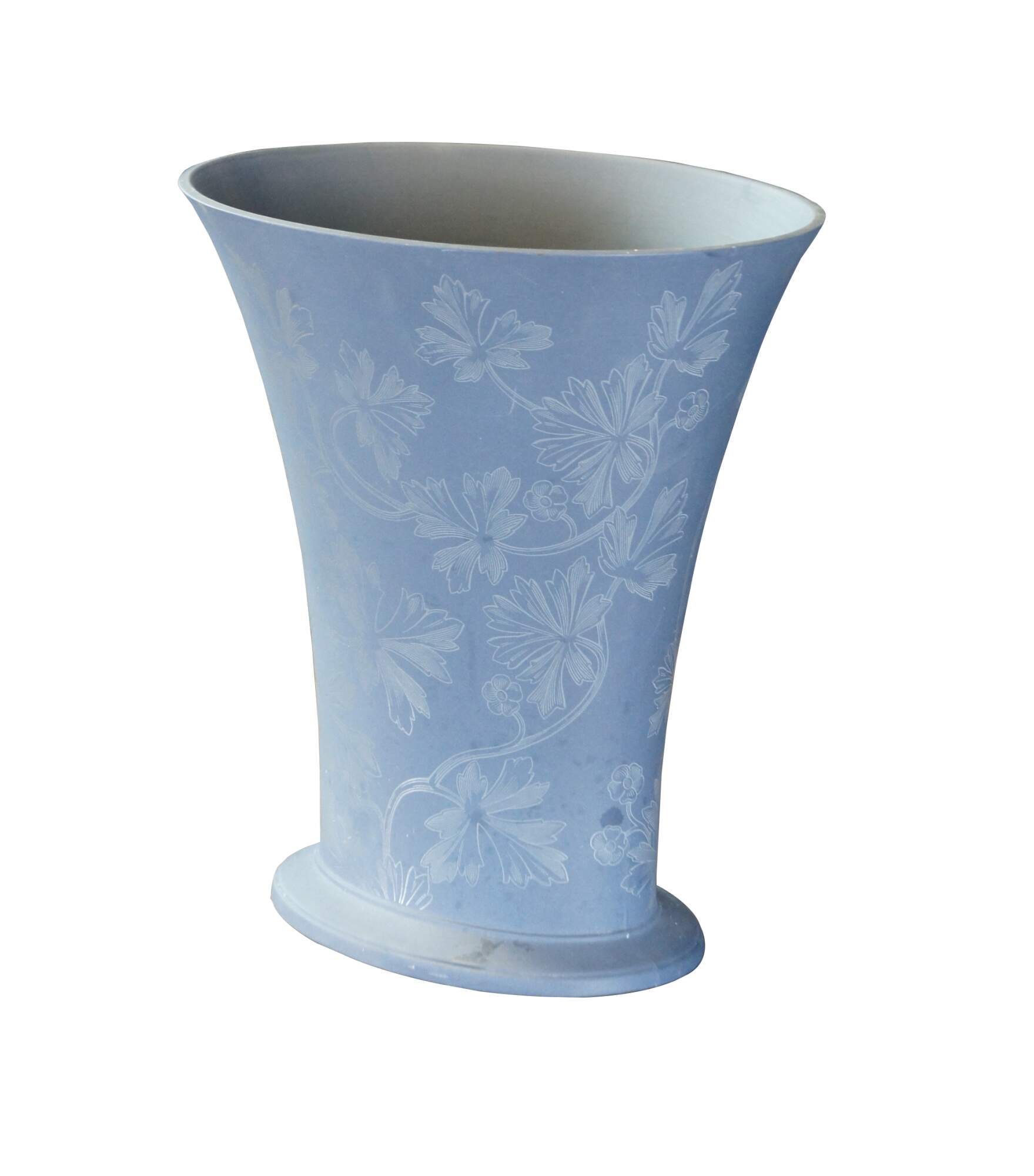Vintage Wedgwood Interiors flared vase featuring oval form with an etched floral leaf design and footed base.