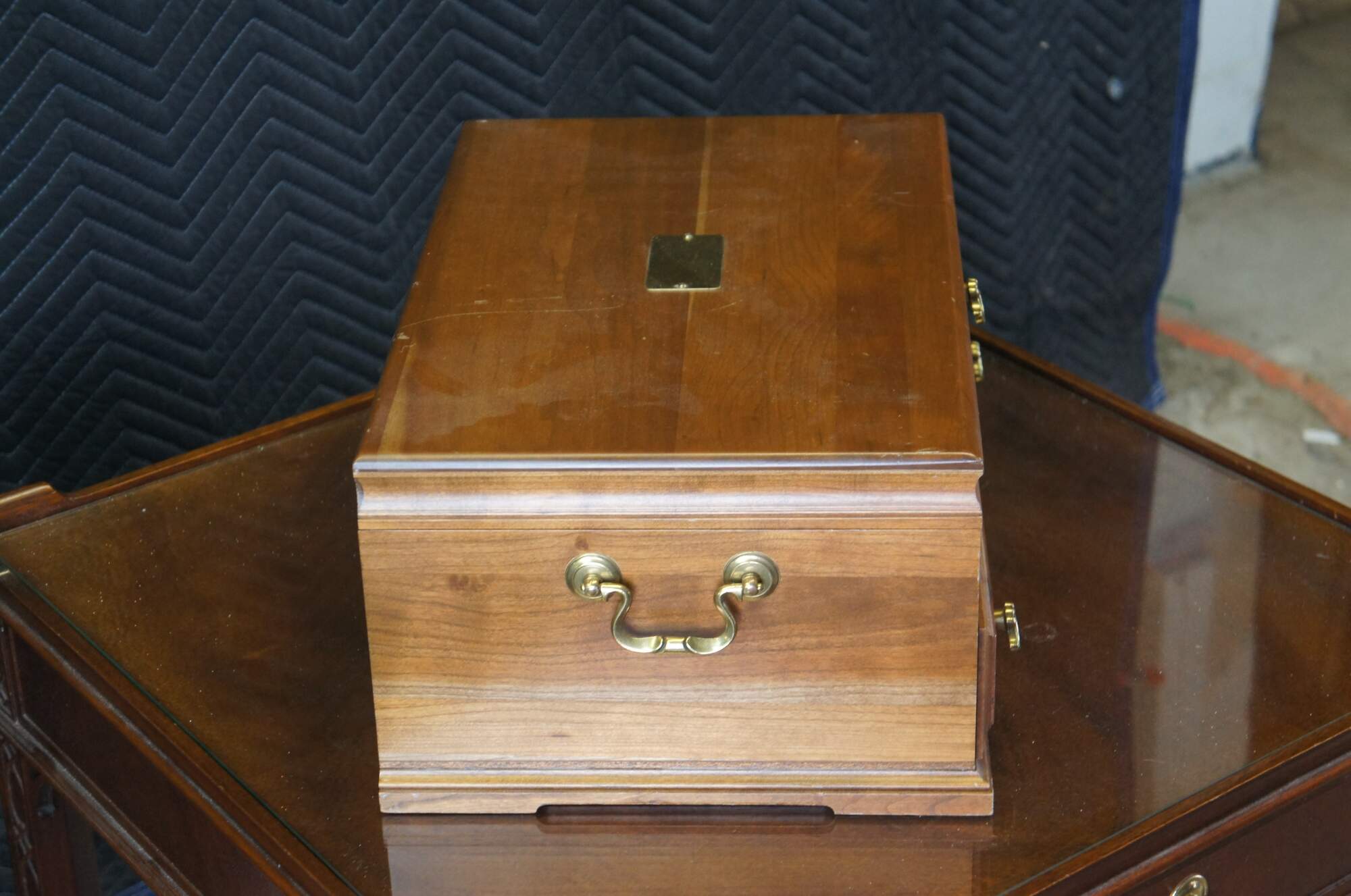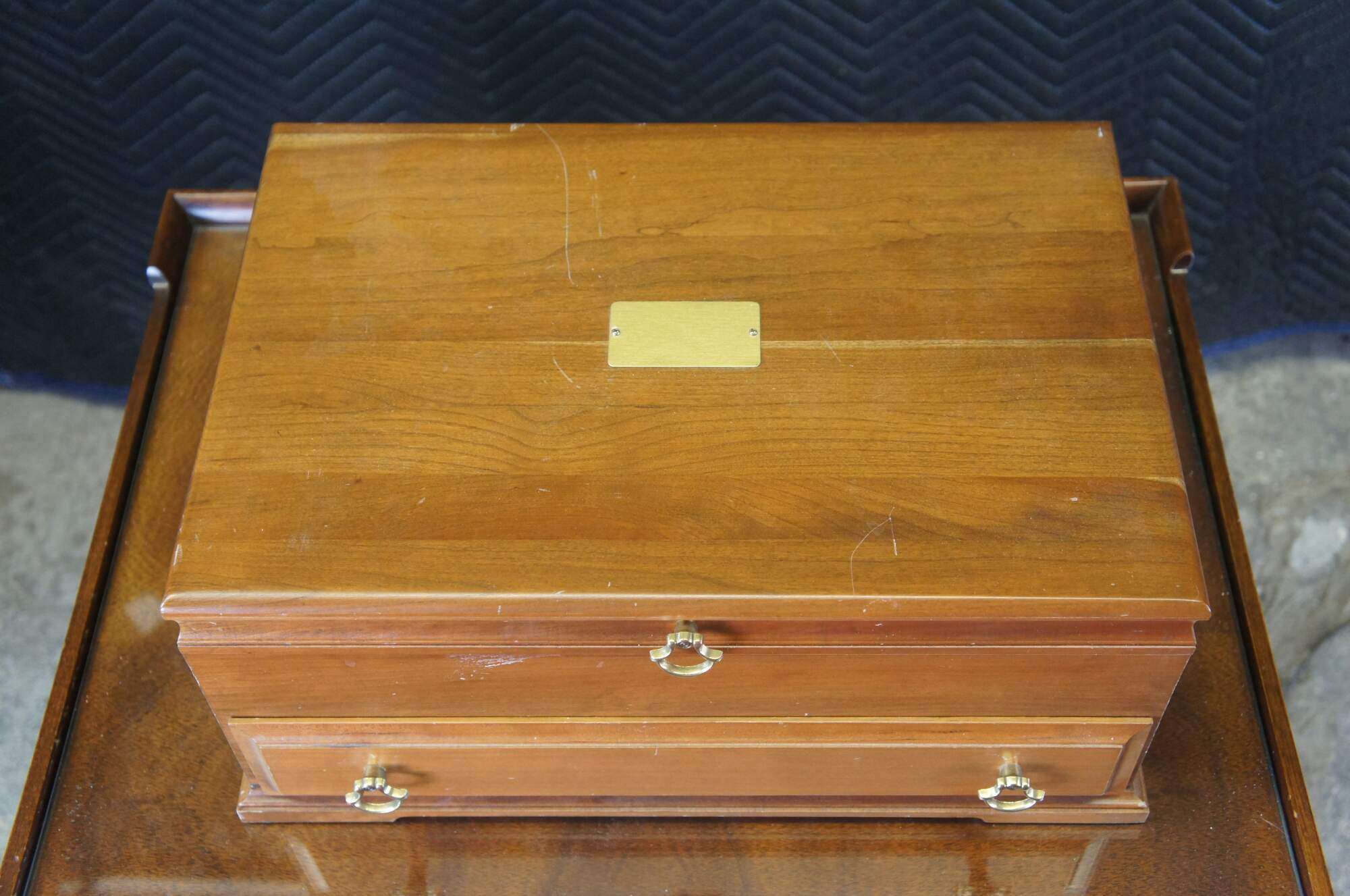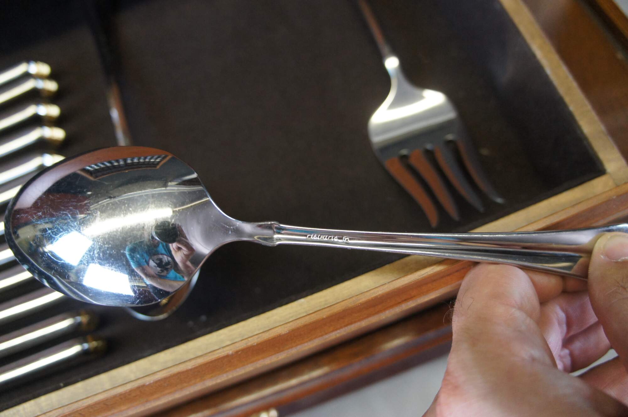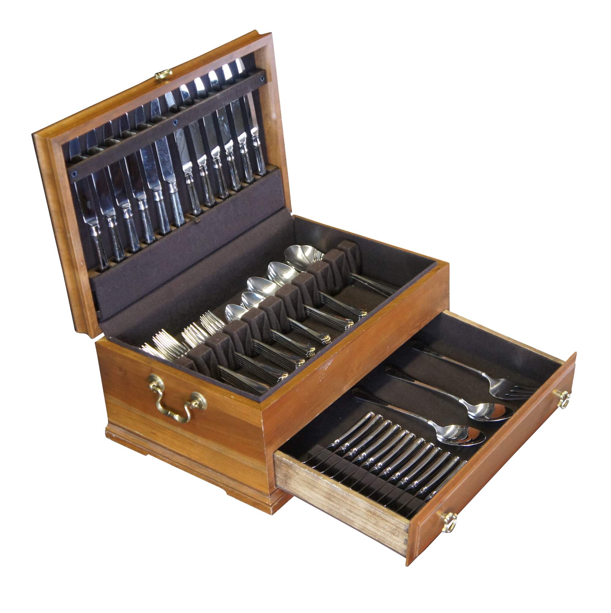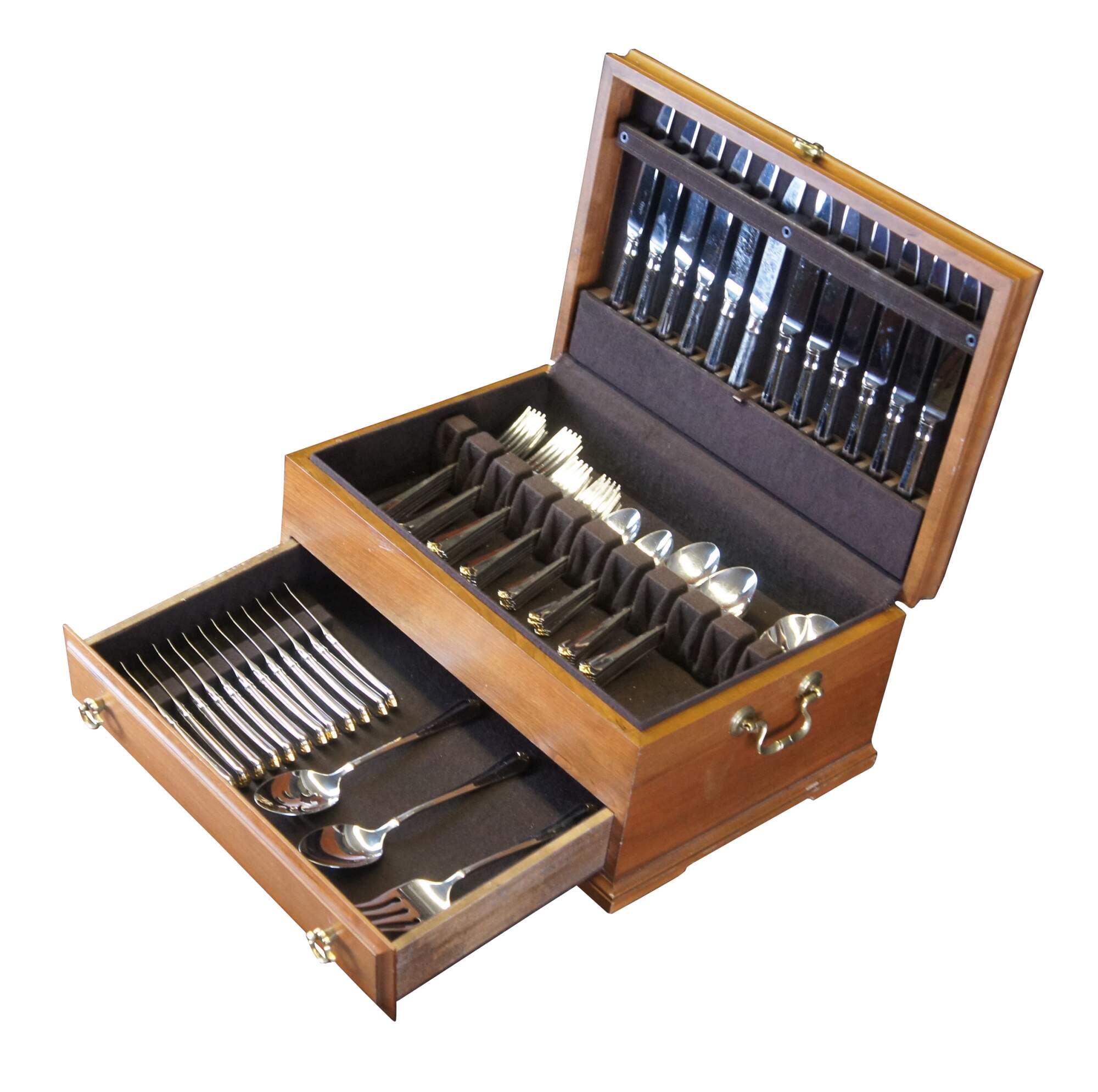Oneida Golden Julliard, (stainless and gold accent), circa 1990s. Includes a Mahogany case with dividers and drawer