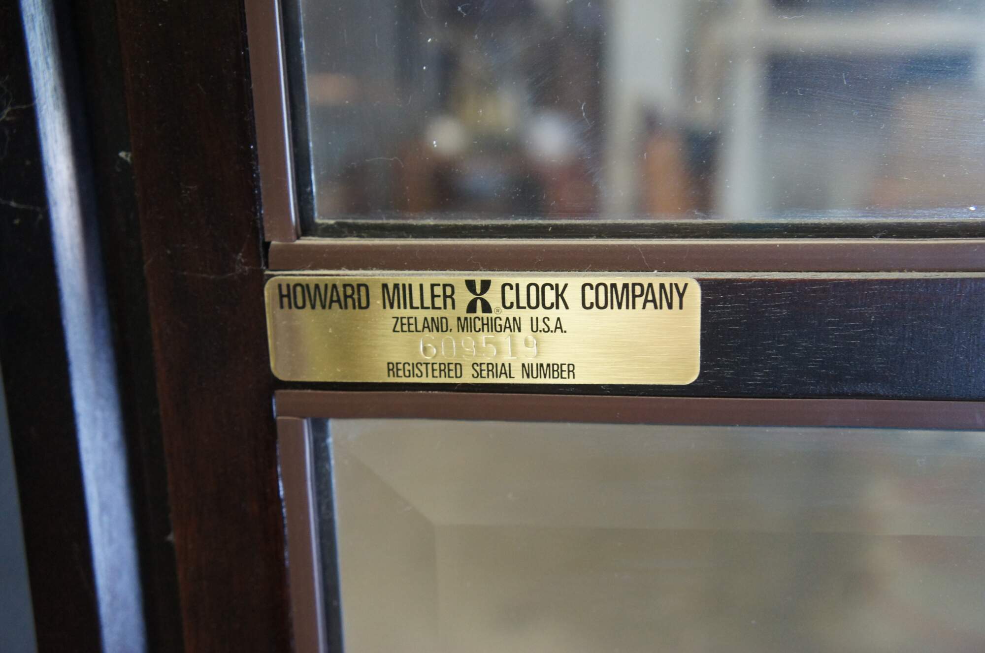 Late 20th century Howard Miller Grandfather Clock, serial number 609519. Features a tall case made from mahogany with quarter cut reeded columns and an open pediment with central finial. Includes 3 chime settings. Face is metal with filigree design and moon dial. Side panels are fabric with fretwork. The clock has glass siding allowing the large pendulum and robust weights to be seen from most angles.