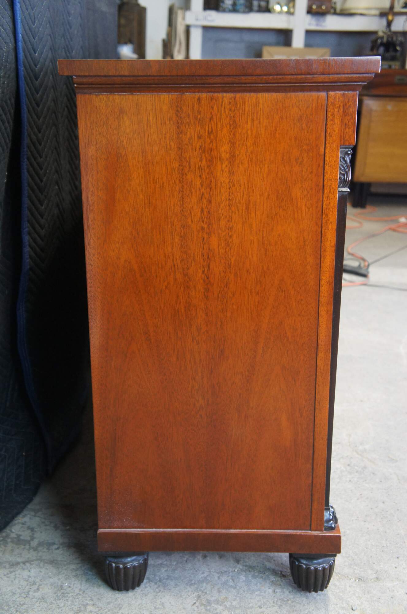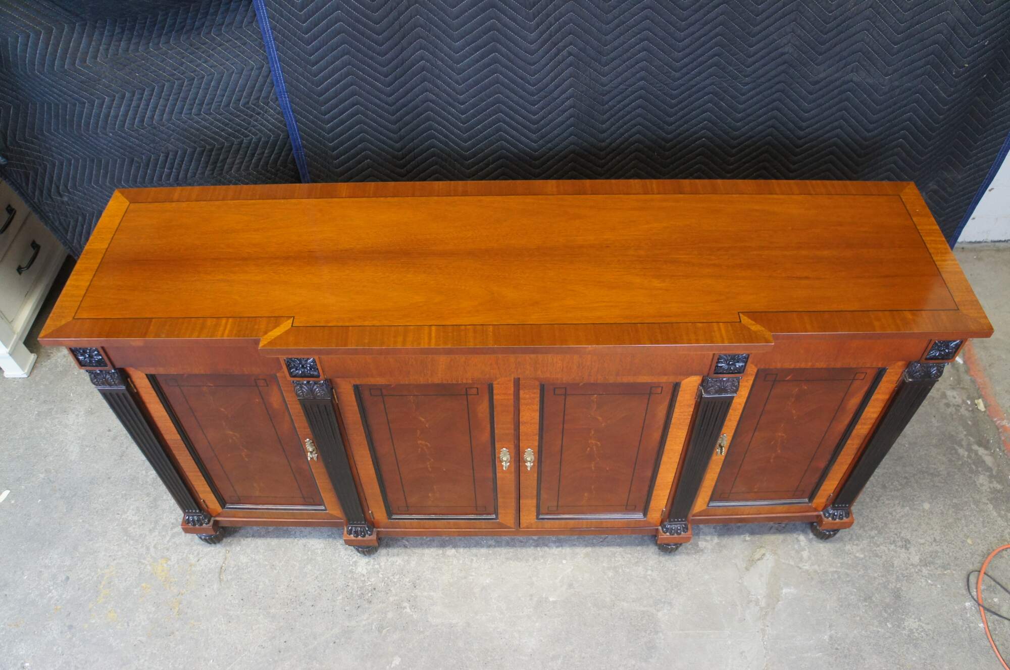 Exceptional Baker Furniture Company sideboard, circa early 2000s. Inspired by English Regency, Neoclassical and French Empire styling. A rectangular form with breakfront design made from mahogany with flame (crotch) mahogany door fronts and magnificent inlay. Features ebonized French carved medallions over tapered and fluted columns leading to paw feet. The case is supported by six turned and reeded bun feet. The cabinet opens to ample storage with felt center drawer for silverware. An eye catcher for any dining room or library. Baker tag along back as well as metal plate to the left side of center drawer.