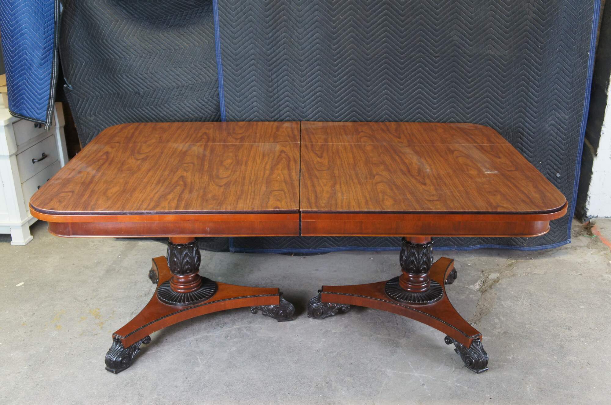 Exceptional Baker Furniture Company Dining or conference Table, circa early 2000s. Inspired by English Regency, Neoclassical and French Empire styling. A rectangular form with flame (crotch) mahogany top with satinwood banding and ebonized inlay. The table is supported by triangular pedestals with acanthus carved baluster design leading to reeded embellishment. The triangular base has a beaded edge and is supported by acanthus scrolled feet. A closer look along the top reveals an exquisite banding pattern. Alternating between mahogany, ebonized inlay, satinwood and another band of mahogany with ebonized inlay centered between the natural warm brown mahogany finish. An eye catcher for any dining room, office or conference setting. Includes wood grained table pads.