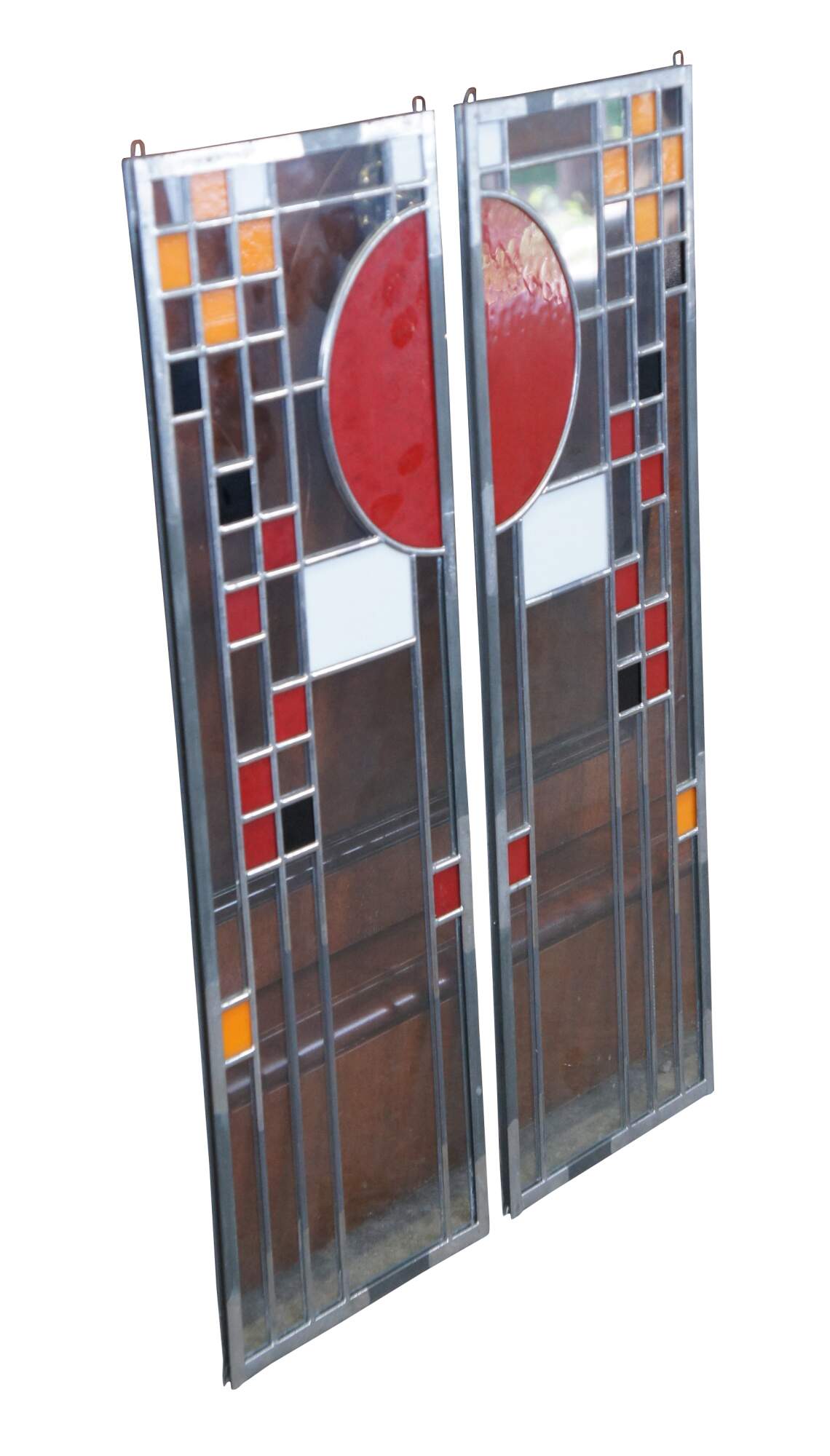 Pair of two vintage Frank Lloyd Wright Coonley Playhouse stained glass window panels.