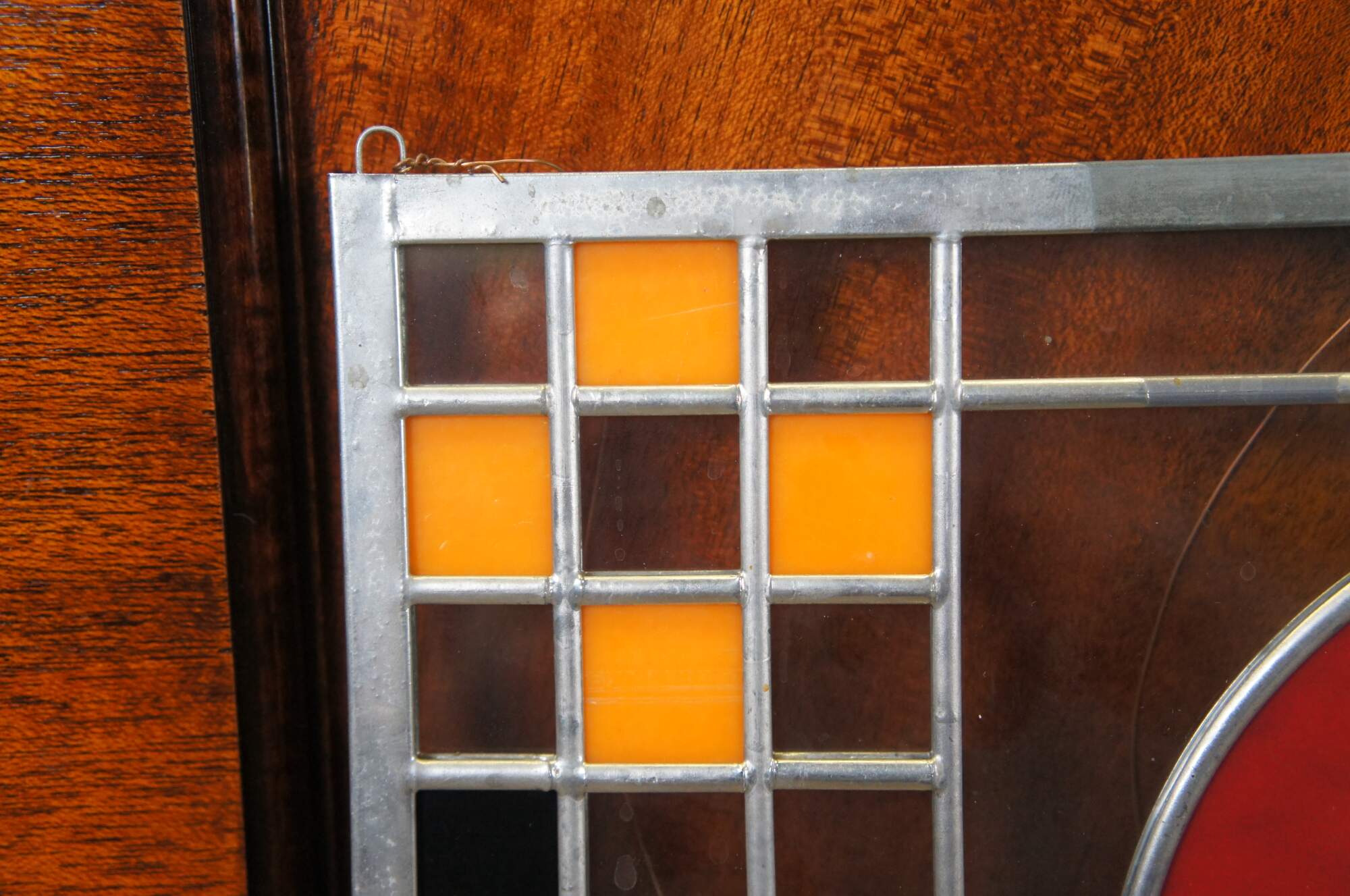 Ornamental glass elements in windows and doors played a major role in Frank Lloyd Wright’s architectural decoration, enhancing the appearance of a room’s size and affecting its mood and focal points. These glass windows, stained in bright, primary colors, are part of a larger set made for the Avery Coonley Playhouse. The bright circles and squares most likely stemmed from Wright’s childhood excitement of playing with colorful maple blocks and cardboard cutouts of circles and squares, and evoked memories of lively parades with flags, balloons, and confetti.