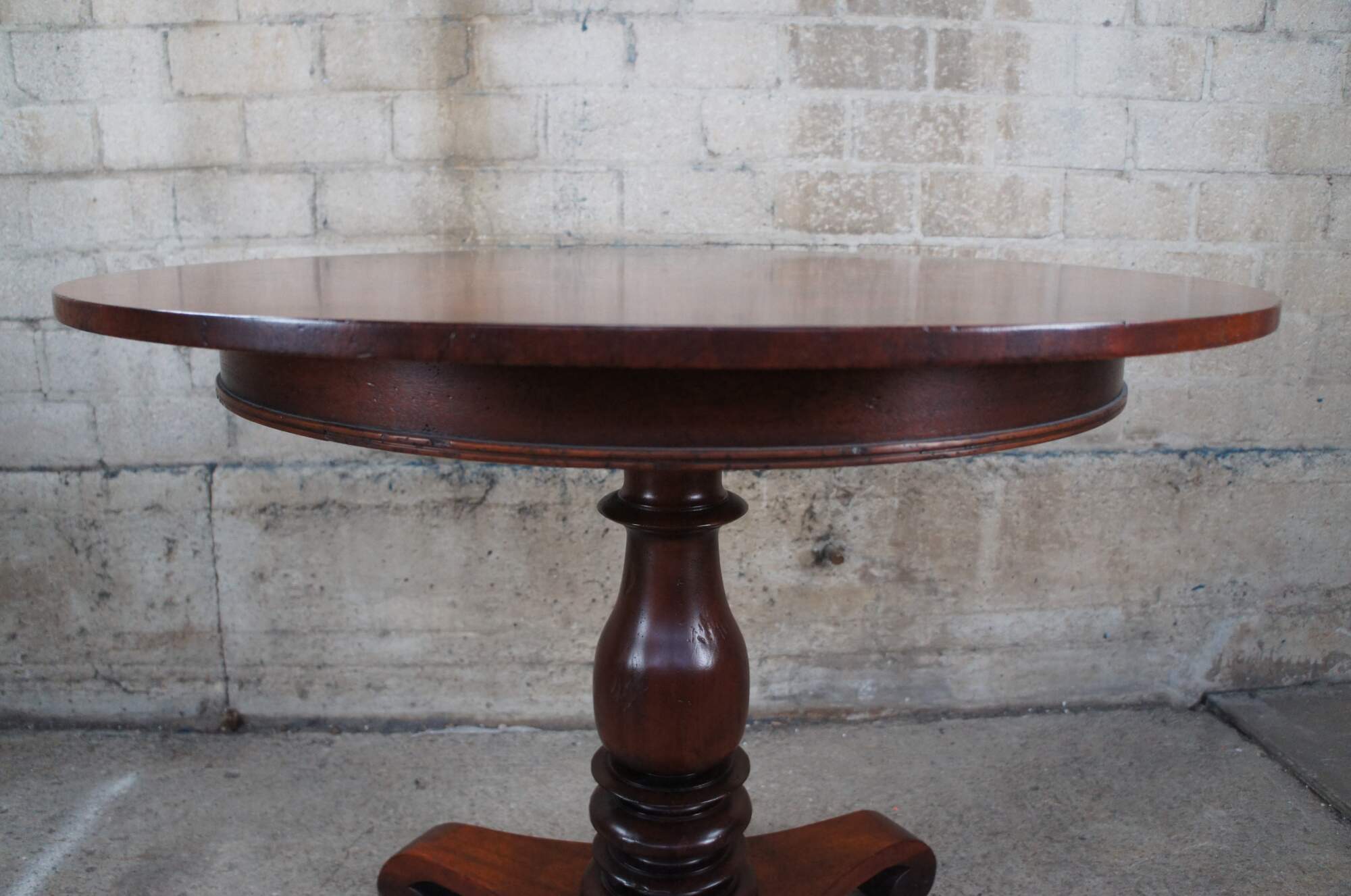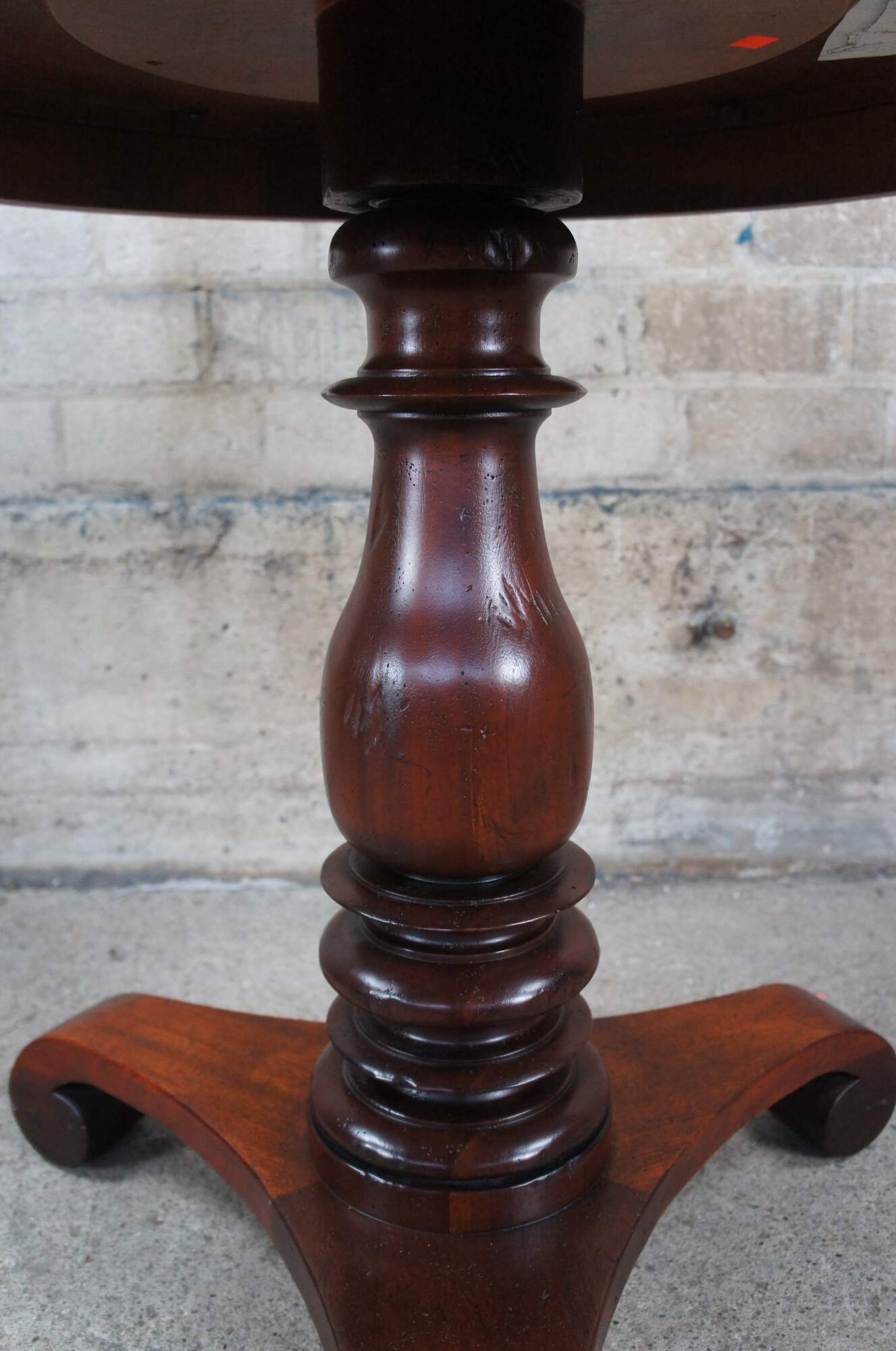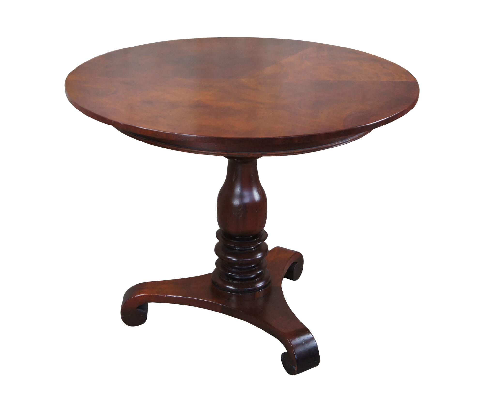 Vintage Baker Furniture Milling Road Collection American Empire style center table, circa 1980s. Made of mahogany featuring round form with pie matchbook top, turned baluster column and scrolled tri foot base.