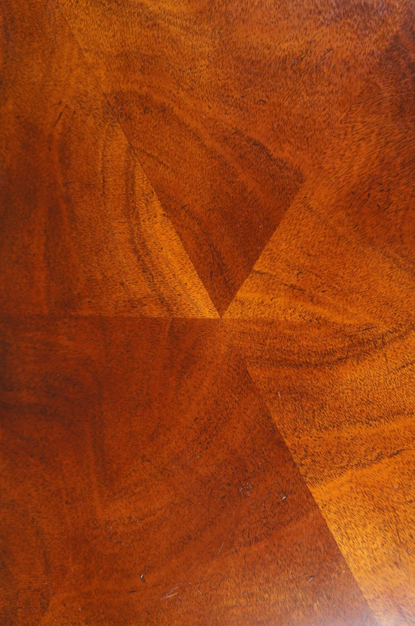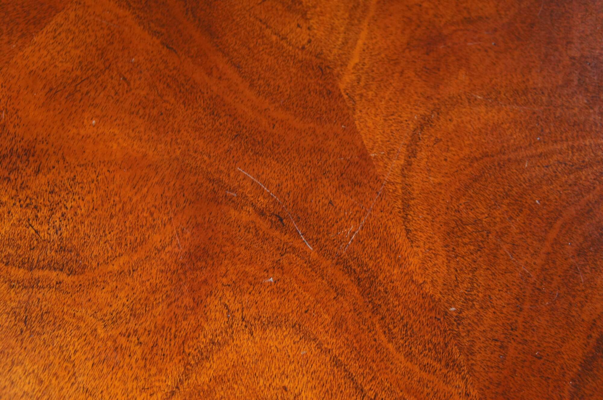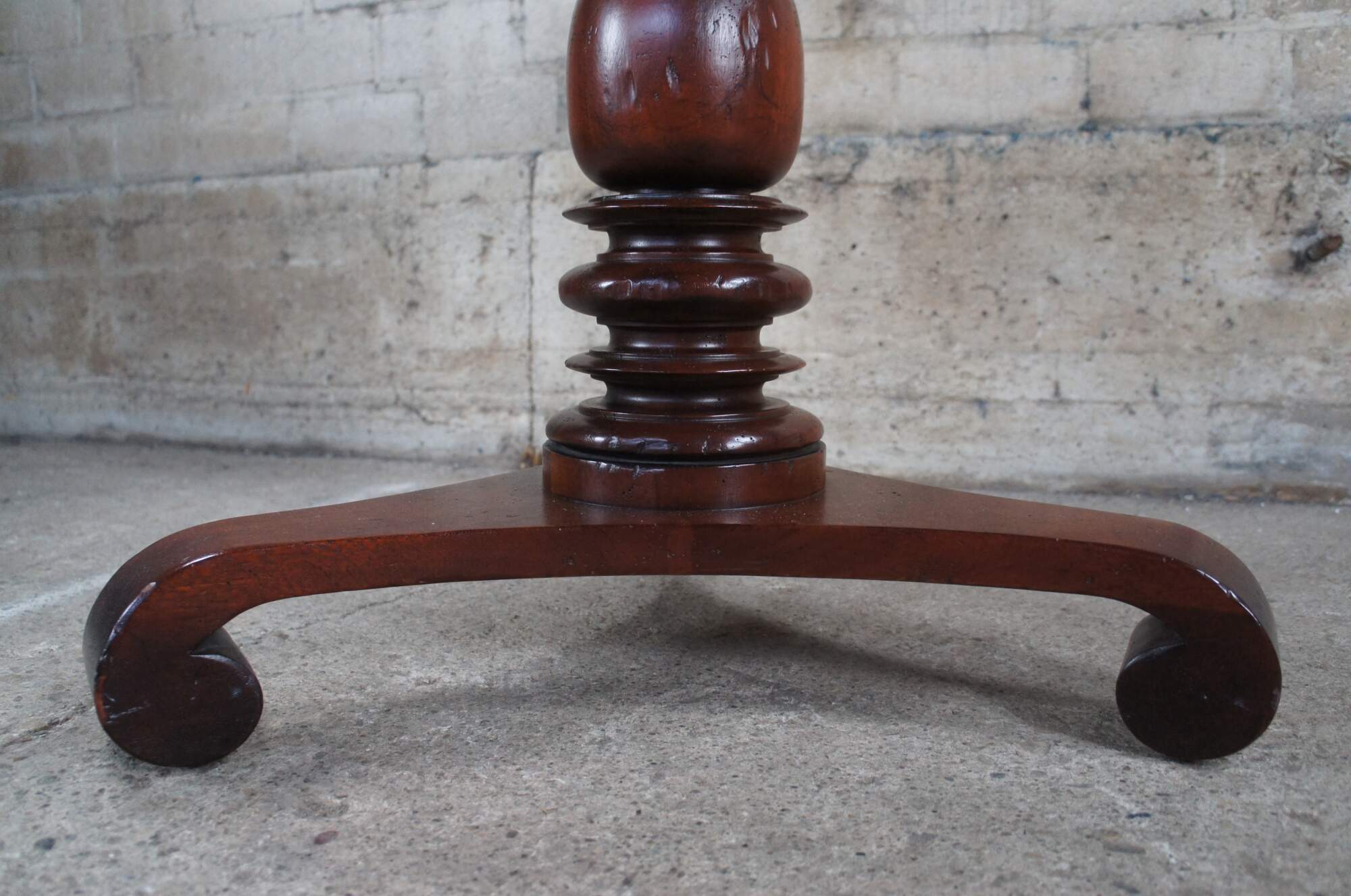 Vintage Baker Furniture Milling Road Collection American Empire style center table, circa 1980s. Made of mahogany featuring round form with pie matchbook top, turned baluster column and scrolled tri foot base.