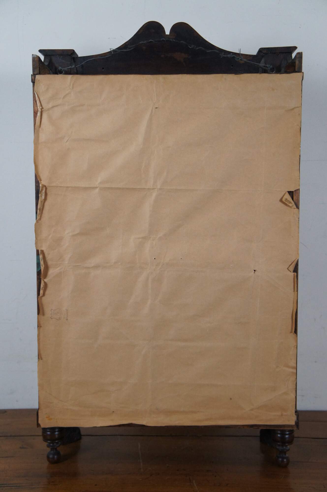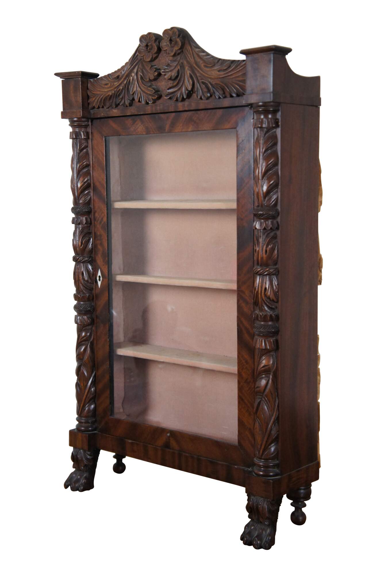 Antique American Empire carved mahogany glass front display cabinet / vitrine, heavily carved with spindle and paw / claw feet supporting foliate pillars that lead to a scrolled floral pediment. The glass door features a white diamond shaped inlaid keyhole and opens to four shelves in the pink velvet lined interior. Can stand on it feet on a table top or suspended from the wall with attached wire.