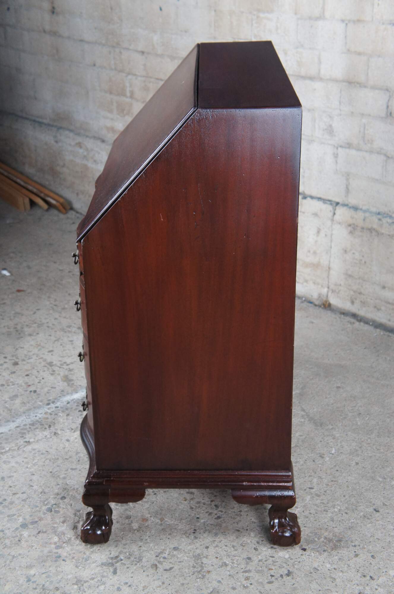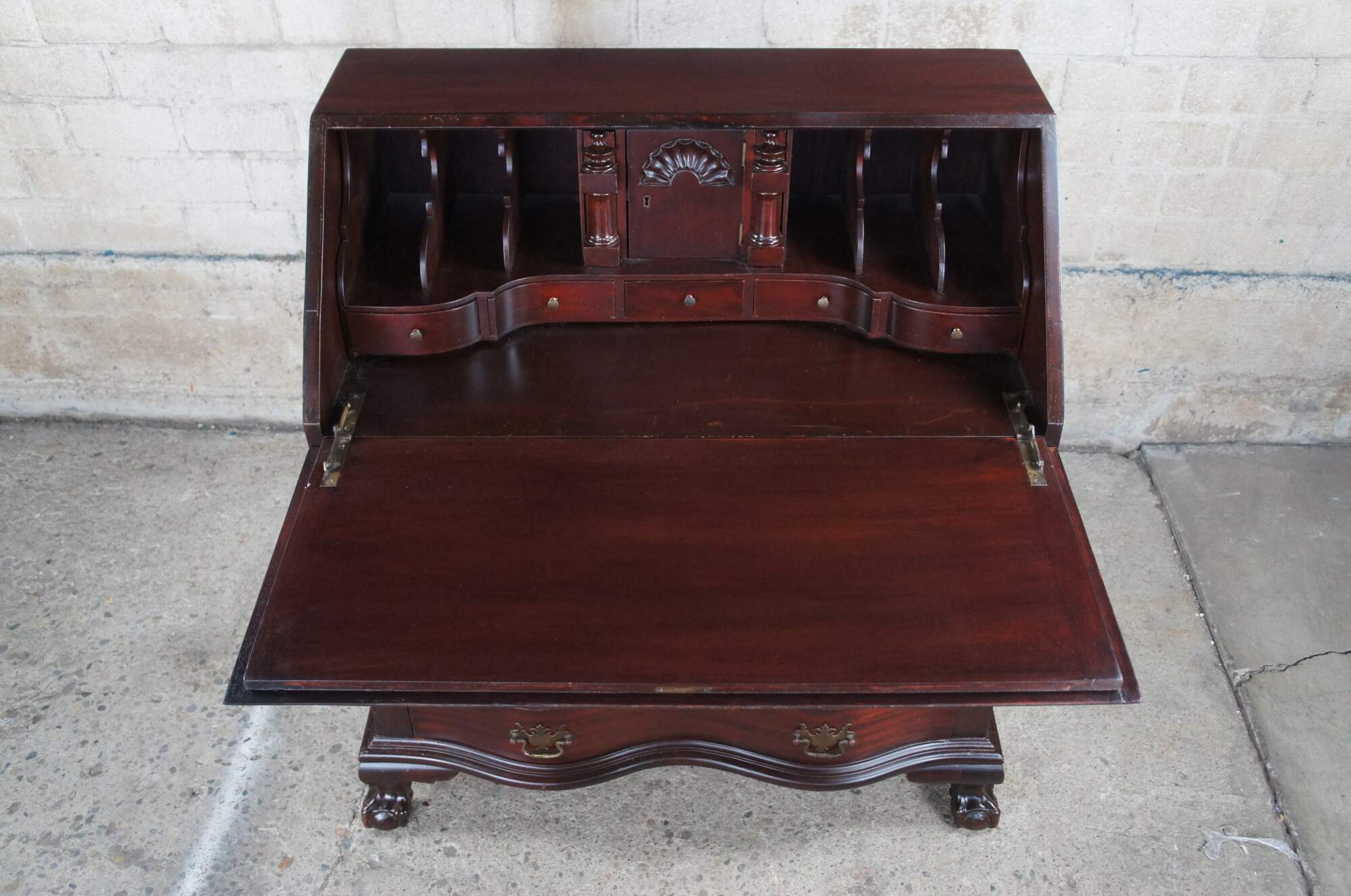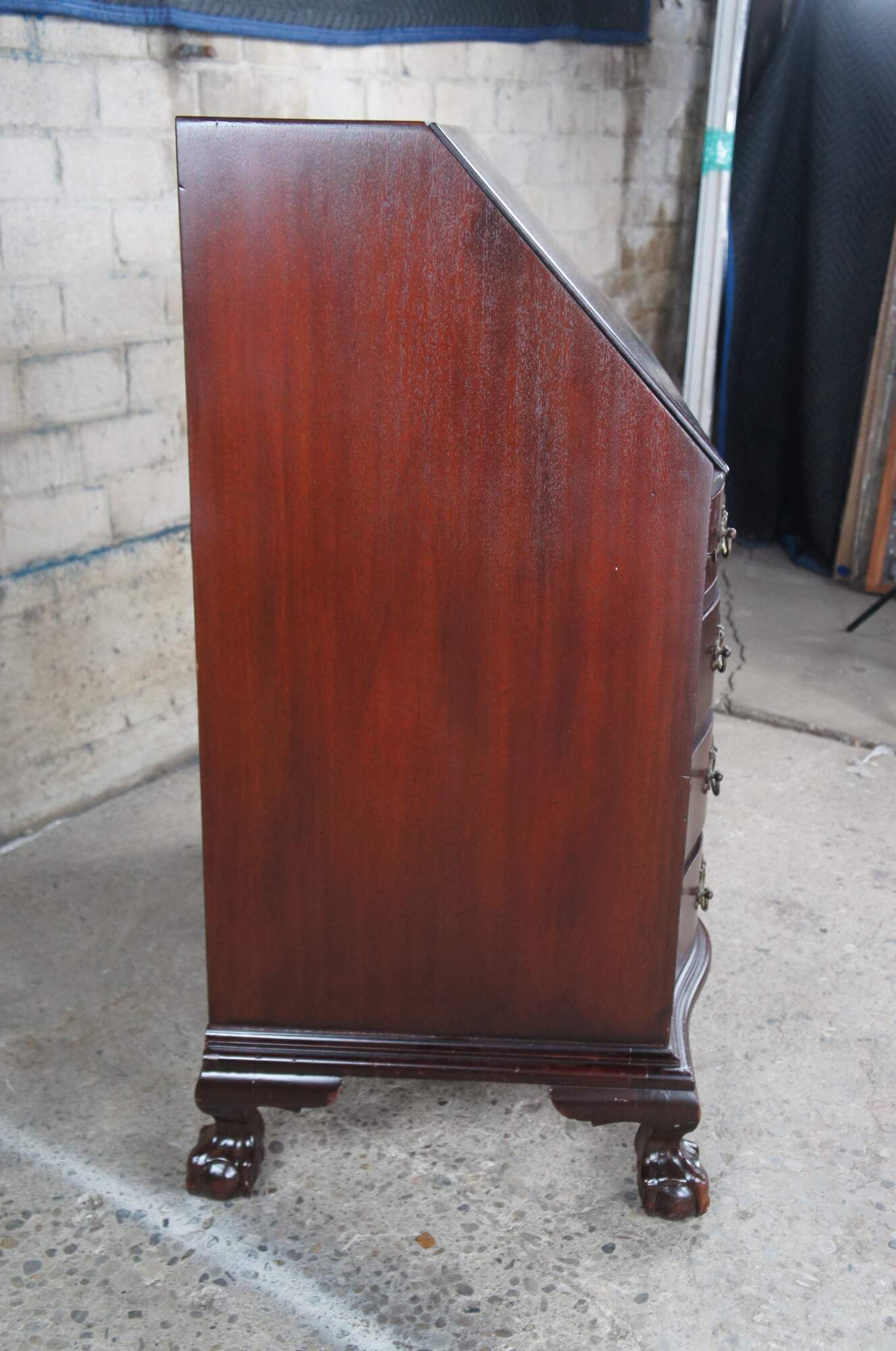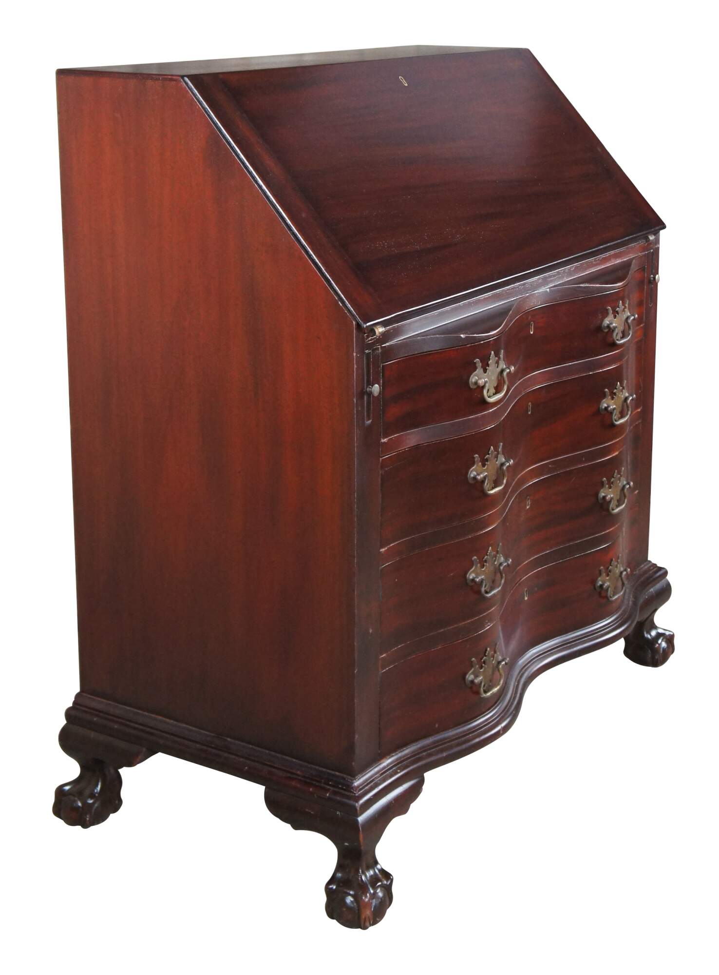 Antique early 20th century Chippendale style secretary or writing desk. Made of mahogany featuring serpentine form with drop front writing surface that opens to multiple drawers and cubbies, over four oxbow drawers that are mounted with classic brass batwing pulls. The case is supported by ball and claw feet. The sides, top and slant front were recently refinished restoring the cabinets lustrious finish. An exquisite addition to any space.