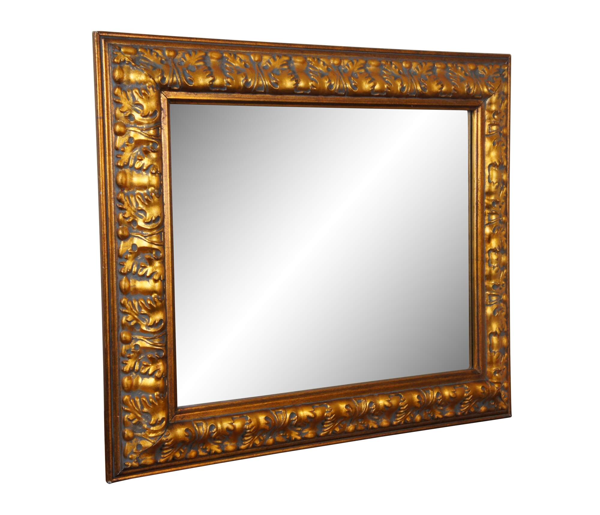 Late 20th century beveled rectangular wall mirror featuring a bold design of oak leaves and acorns. Molded plaster / composite frame finished in a deep, metallic gold. Can be hung vertically or horizontally. Manufactured by JJ International, Inc.
