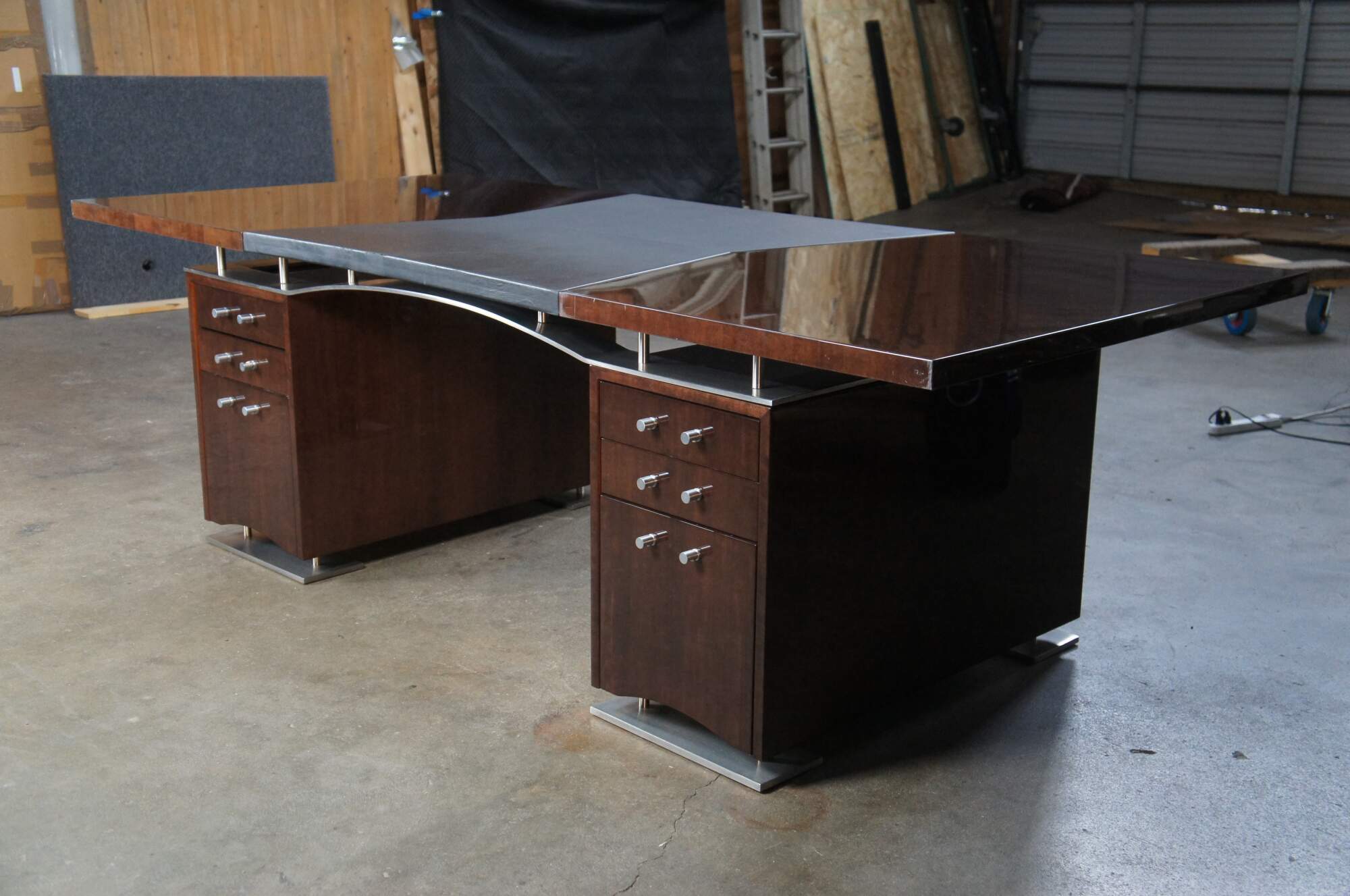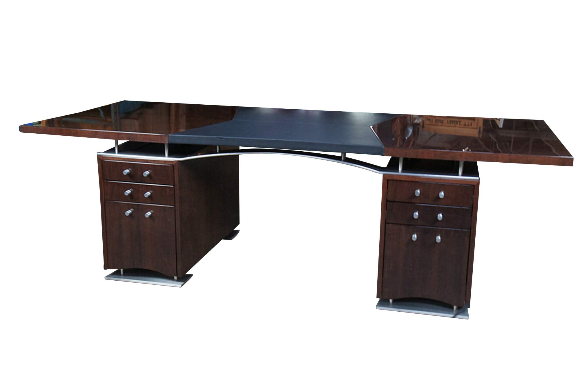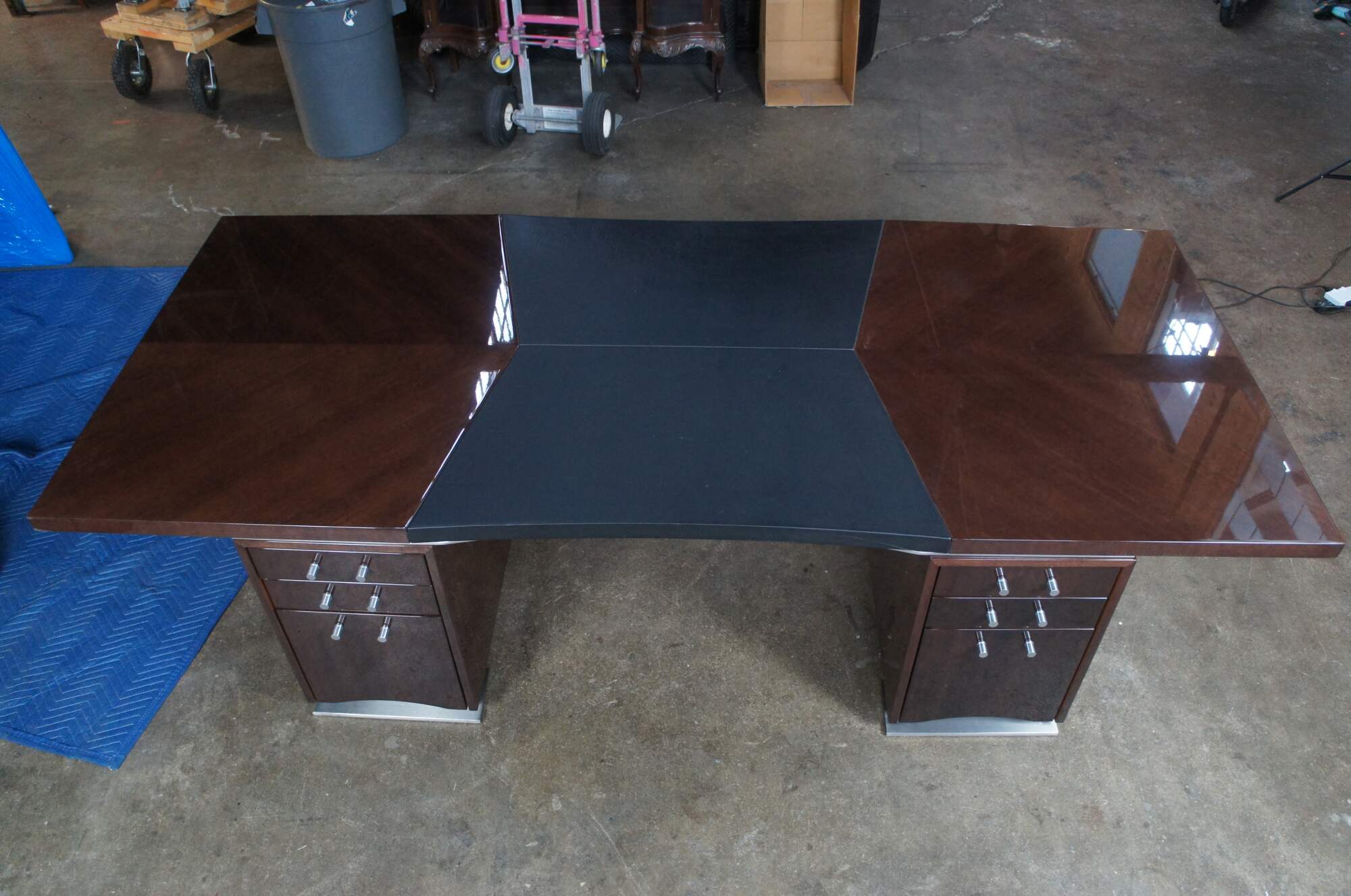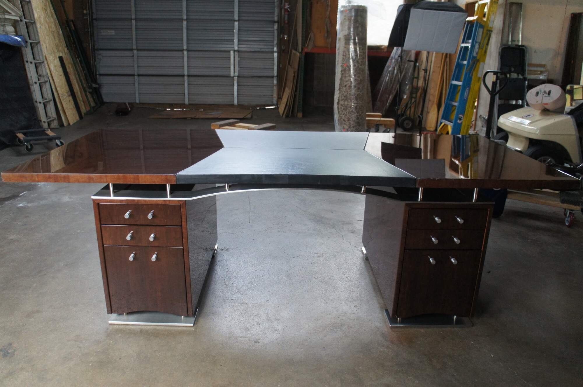 Vintage Dakota Jackson post modern Art Deco style executive partners desk featuring mahogany with leather insert and stainless steel frame. A V-Shape pattern veneer top with Black Leather inset. 2 pedestal cabinets below: each with 2 standard drawers and 1 file drawer, front and back. Polished Stainless Steel drawer pulls, post, floor plates, and arced trestle supporting desktop. DJ Chelsea Black Leather, Polished Polyresin finish.
