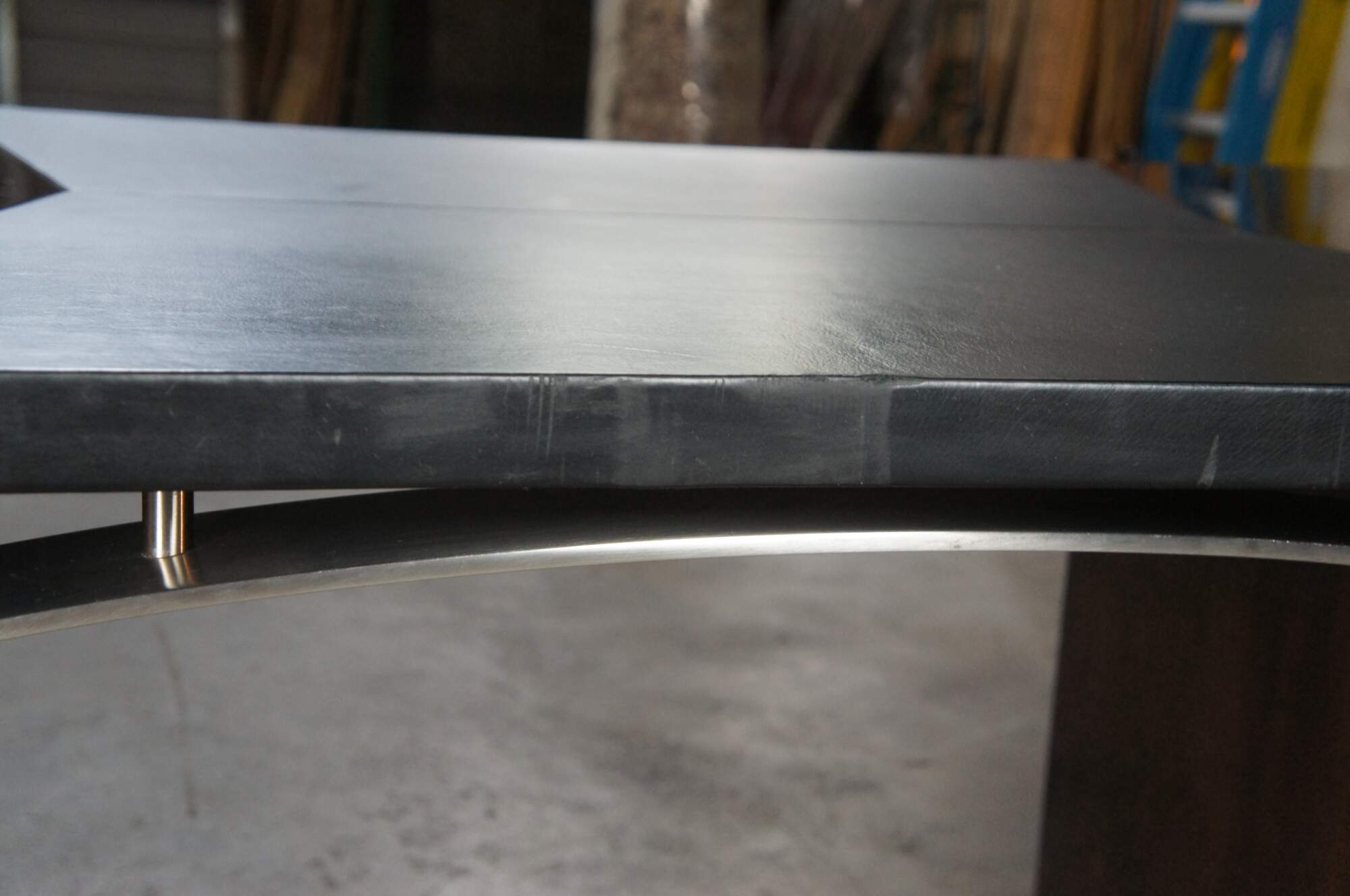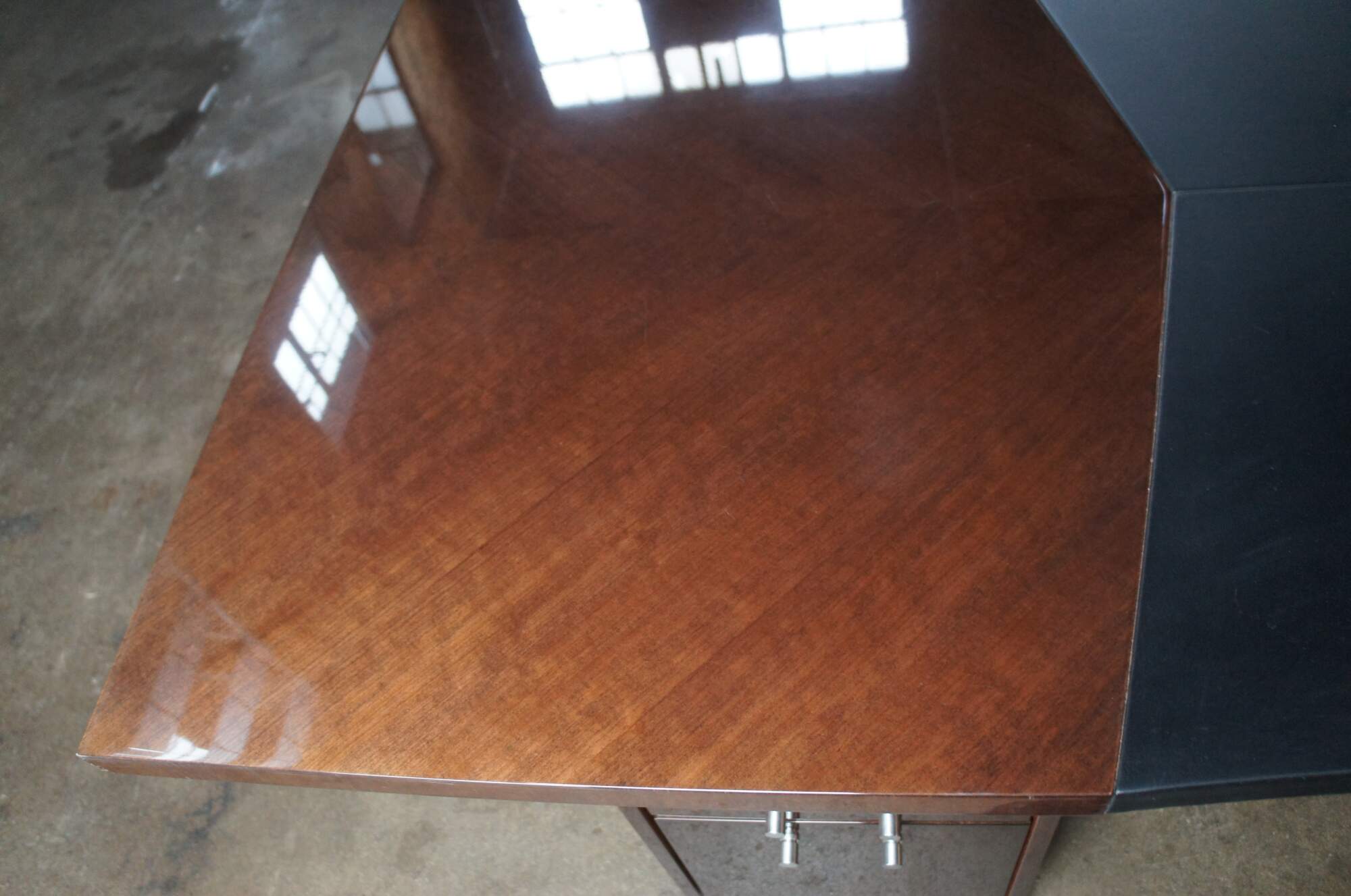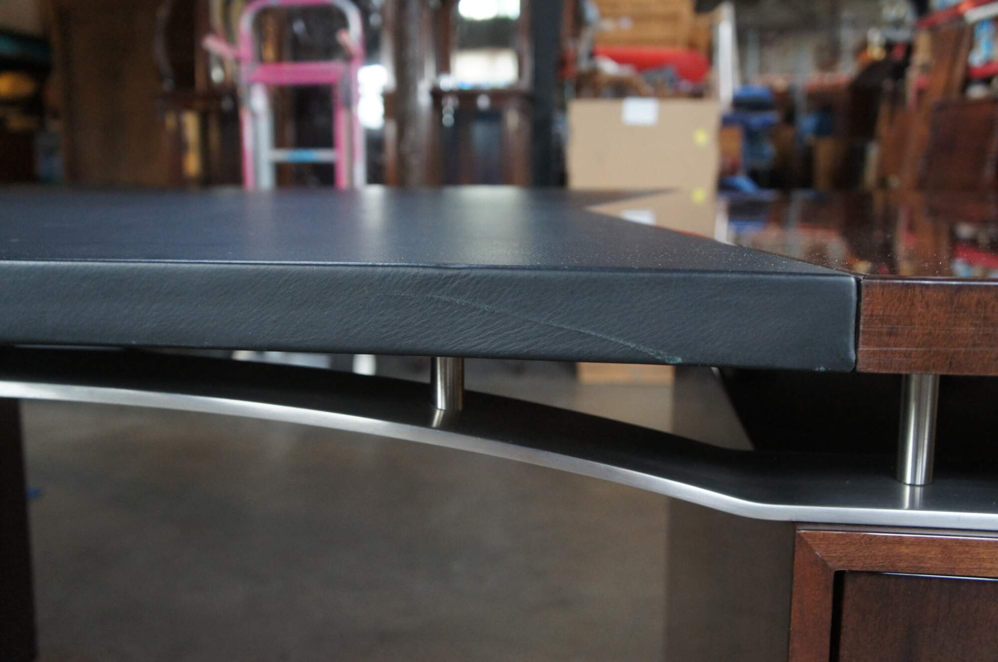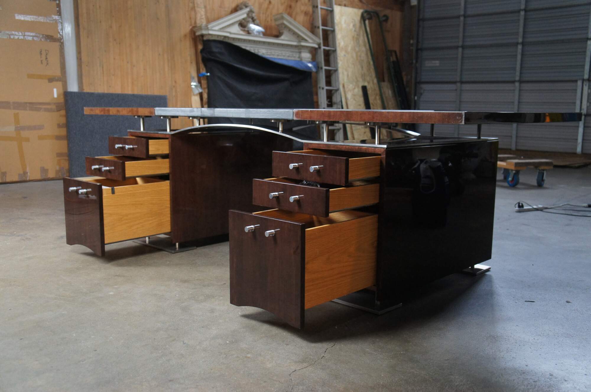 Vintage Dakota Jackson post modern Art Deco style executive partners desk featuring mahogany with leather insert and stainless steel frame. A V-Shape pattern veneer top with Black Leather inset. 2 pedestal cabinets below: each with 2 standard drawers and 1 file drawer, front and back. Polished Stainless Steel drawer pulls, post, floor plates, and arced trestle supporting desktop. DJ Chelsea Black Leather, Polished Polyresin finish.