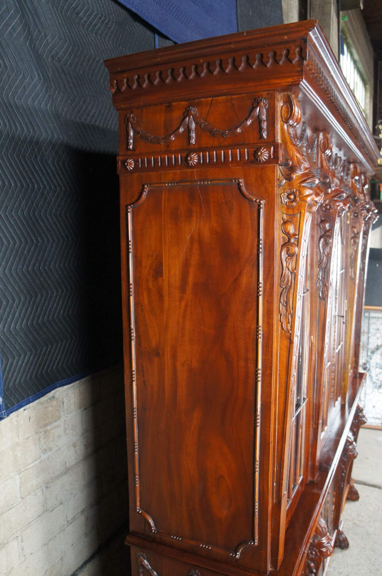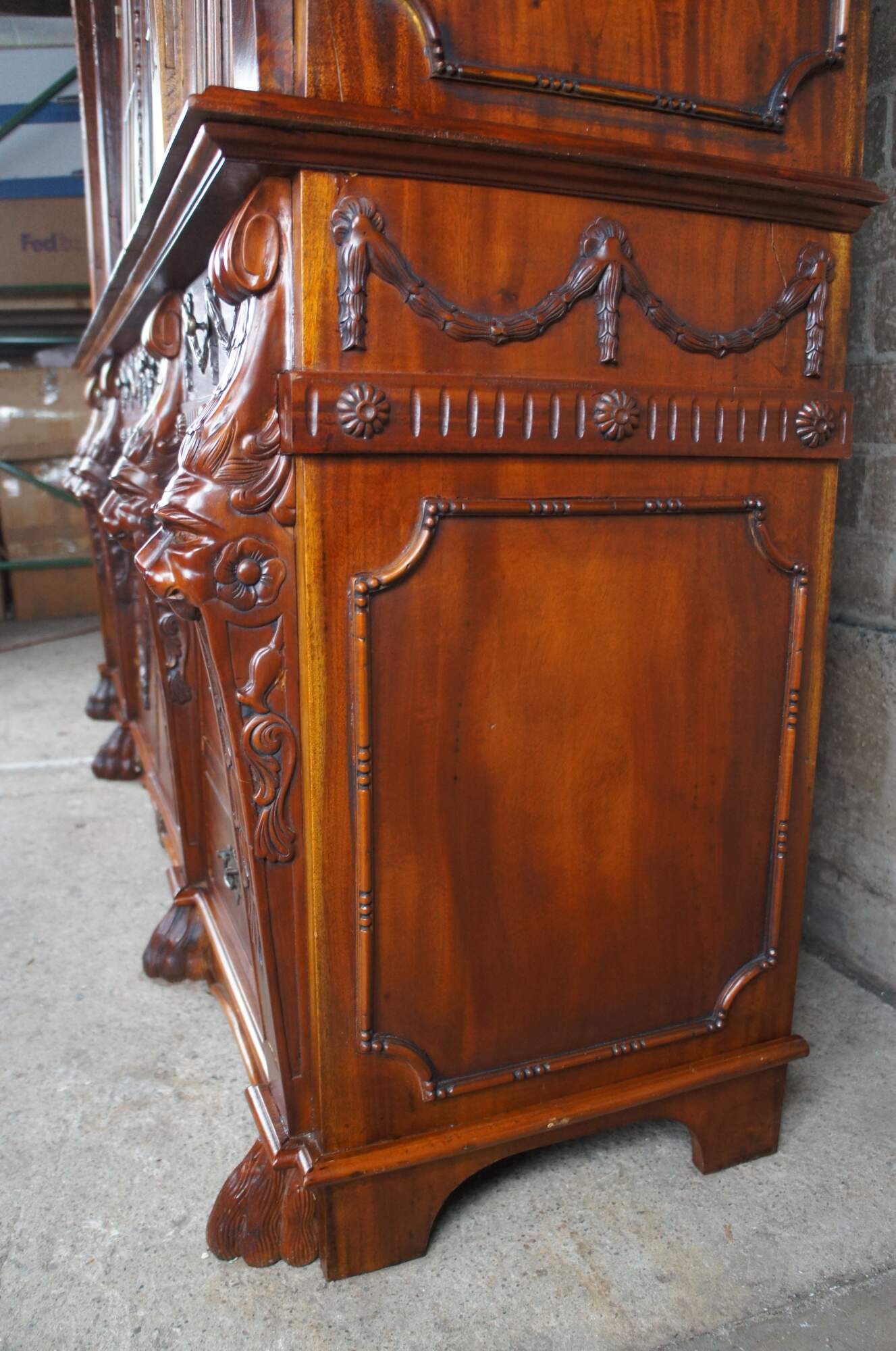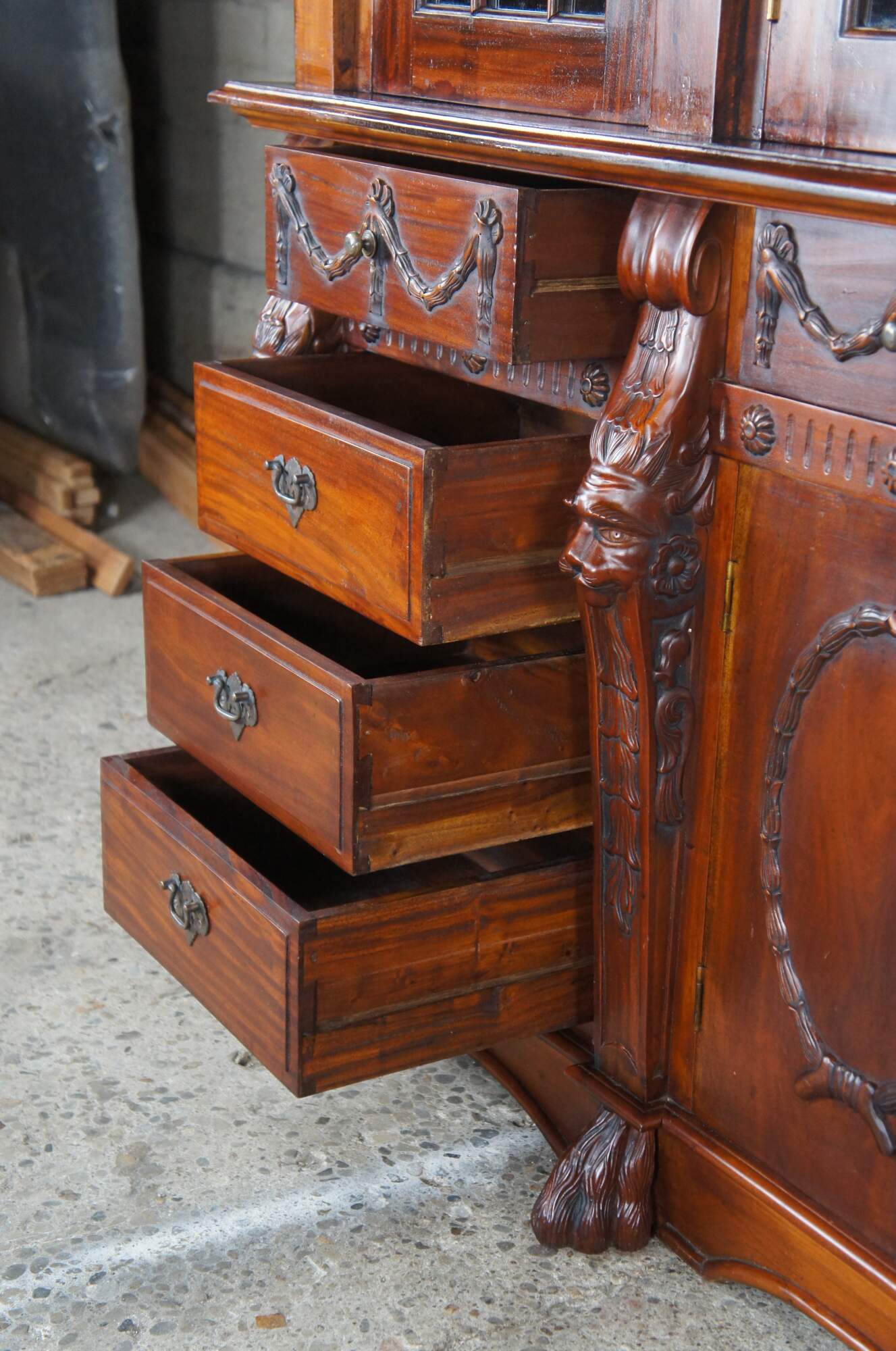 Vintage English Chippendale style solid mahogany carved china cabinet or cupboard. Drawing inspiration from Neoclassicism and Empire design. Made of mahogany featuring carved accents with sawtooth crown over Gothic fretwork doors divided by high relief lion head columns, neoclassical ribbons, alternating fluting and floral medallions. The base features hairy paw feet, 8 dovetailed drawers and a central cabinet accented by oval wreaths for accessory storage. Includes round brass pulls for upper drawers and lower batwing style bail hardware.