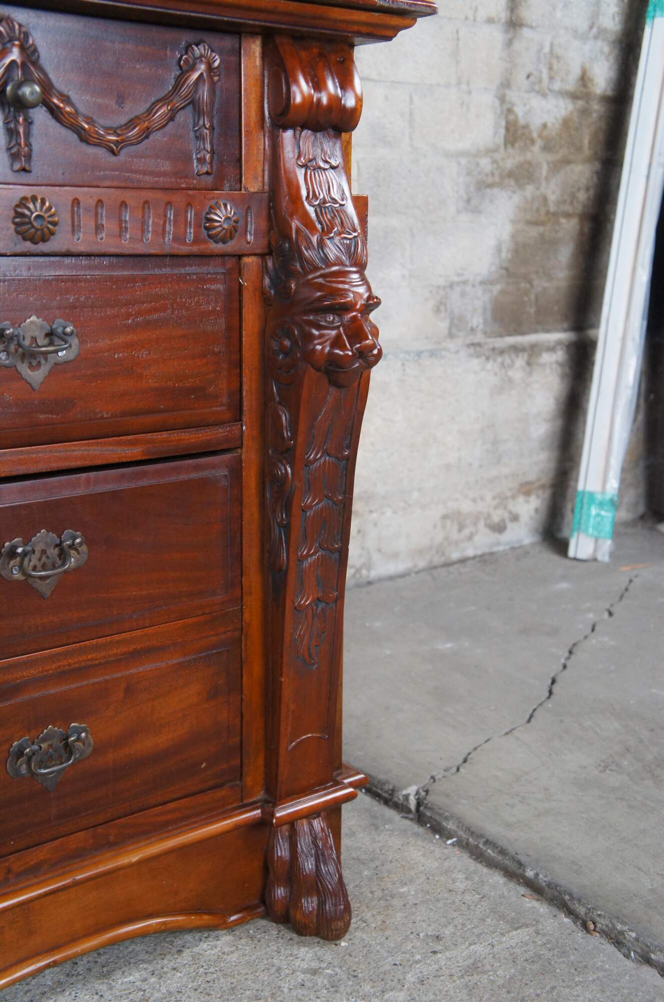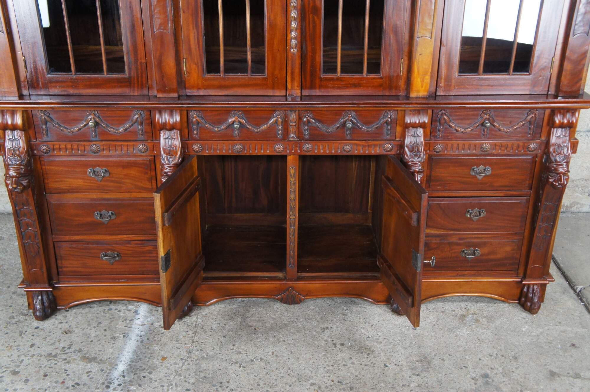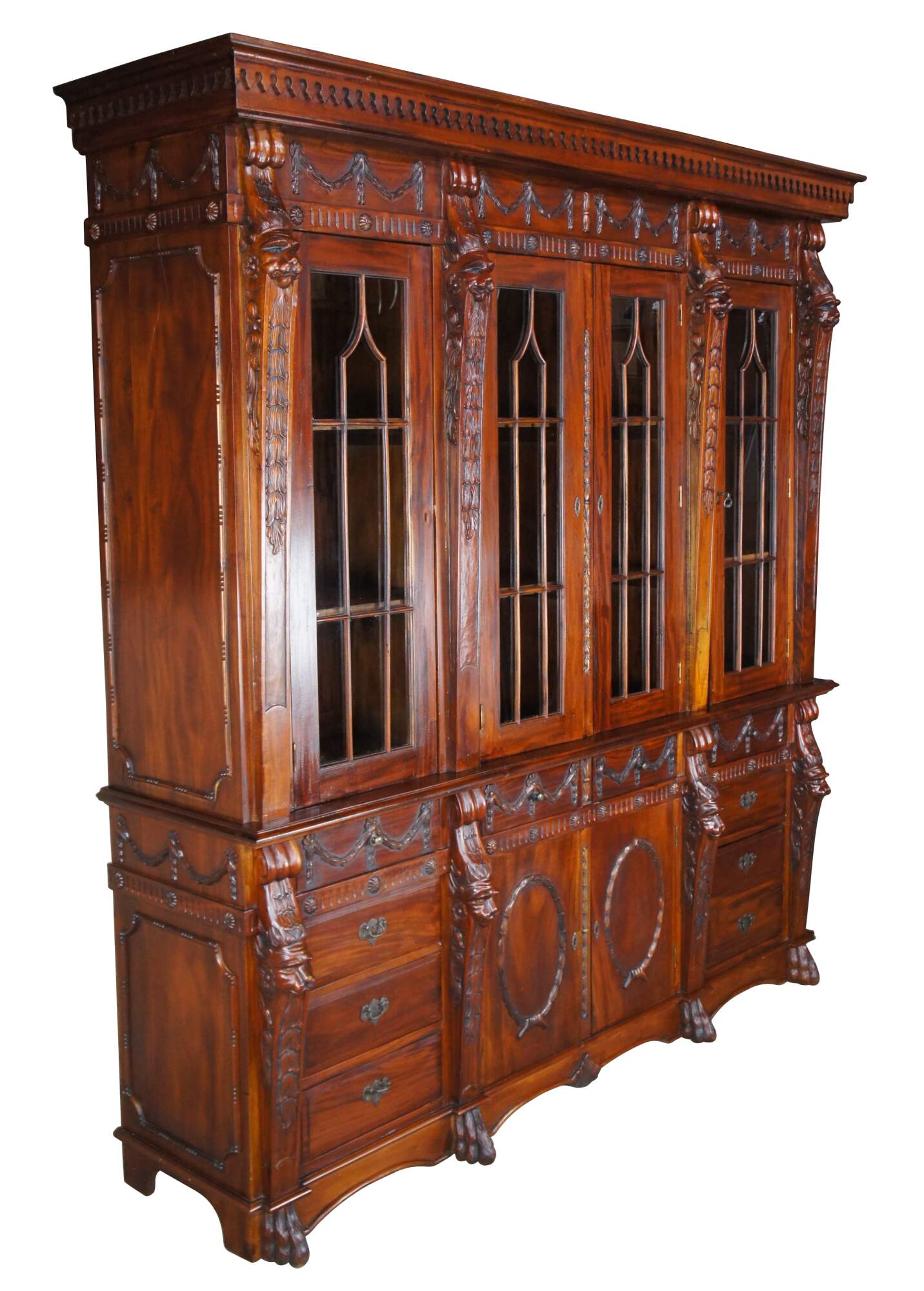 Vintage English Chippendale style solid mahogany carved china cabinet or cupboard. Drawing inspiration from Neoclassicism and Empire design. Made of mahogany featuring carved accents with sawtooth crown over Gothic fretwork doors divided by high relief lion head columns, neoclassical ribbons, alternating fluting and floral medallions. The base features hairy paw feet, 8 dovetailed drawers and a central cabinet accented by oval wreaths for accessory storage. Includes round brass pulls for upper drawers and lower batwing style bail hardware.