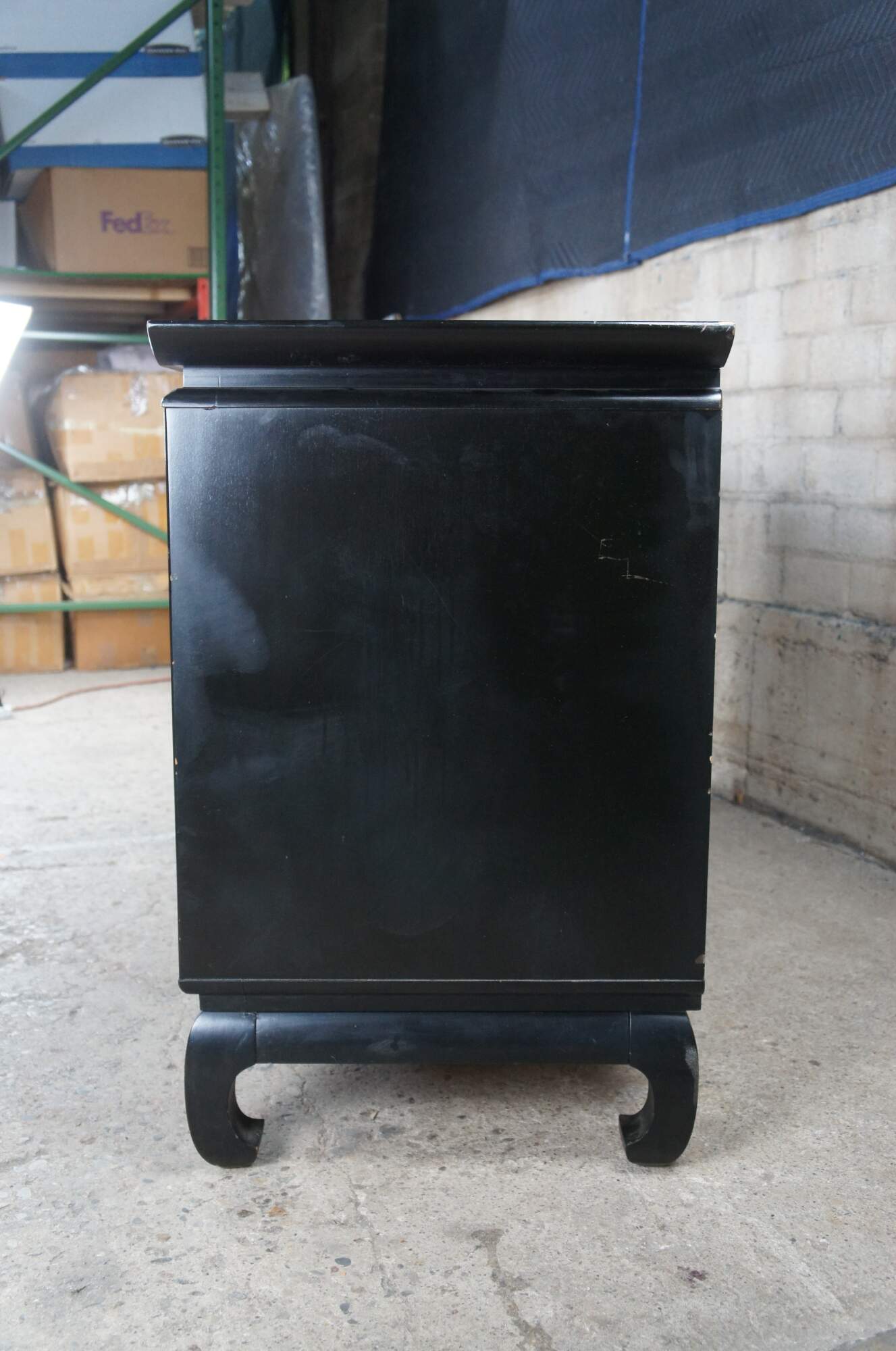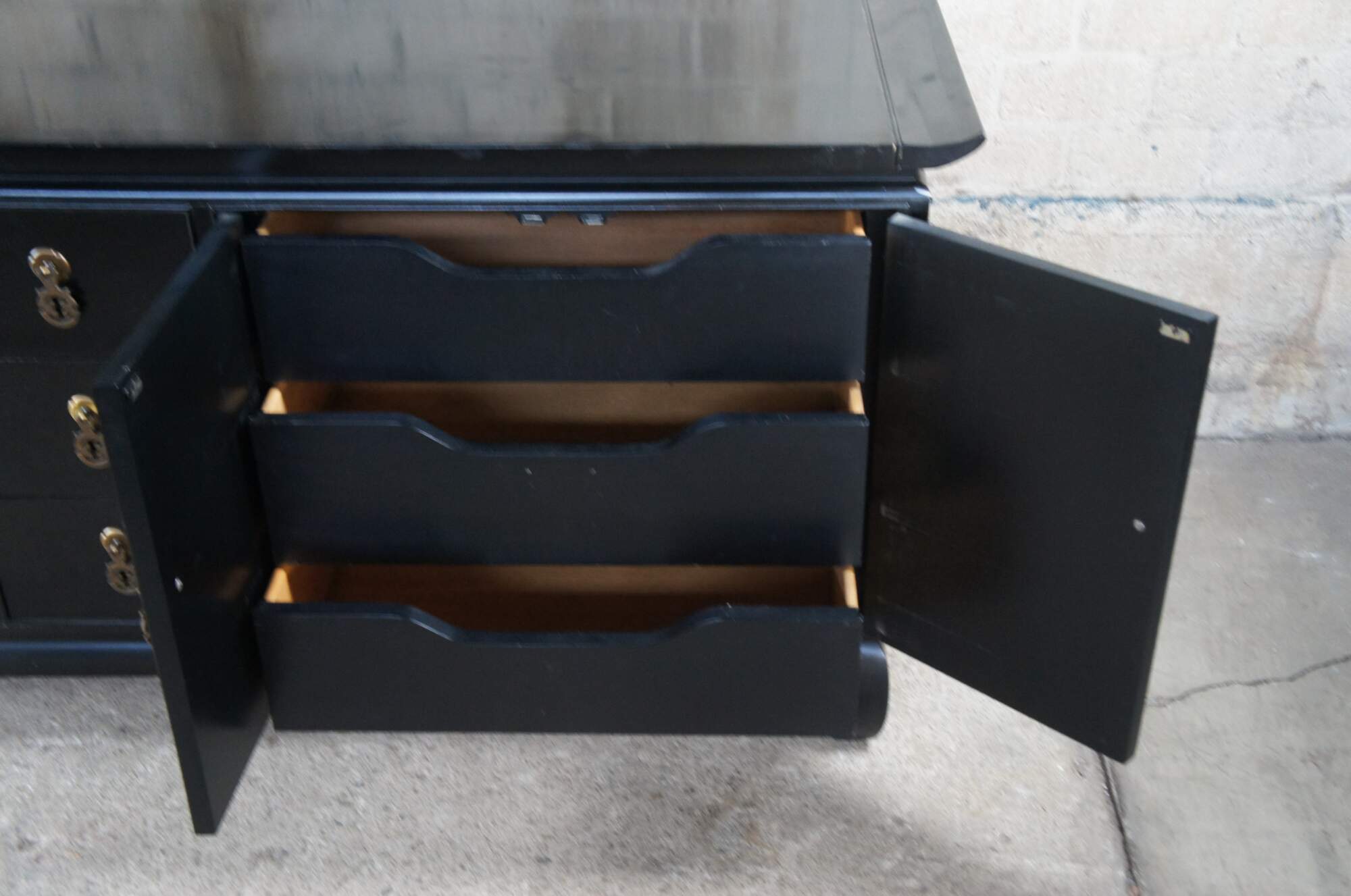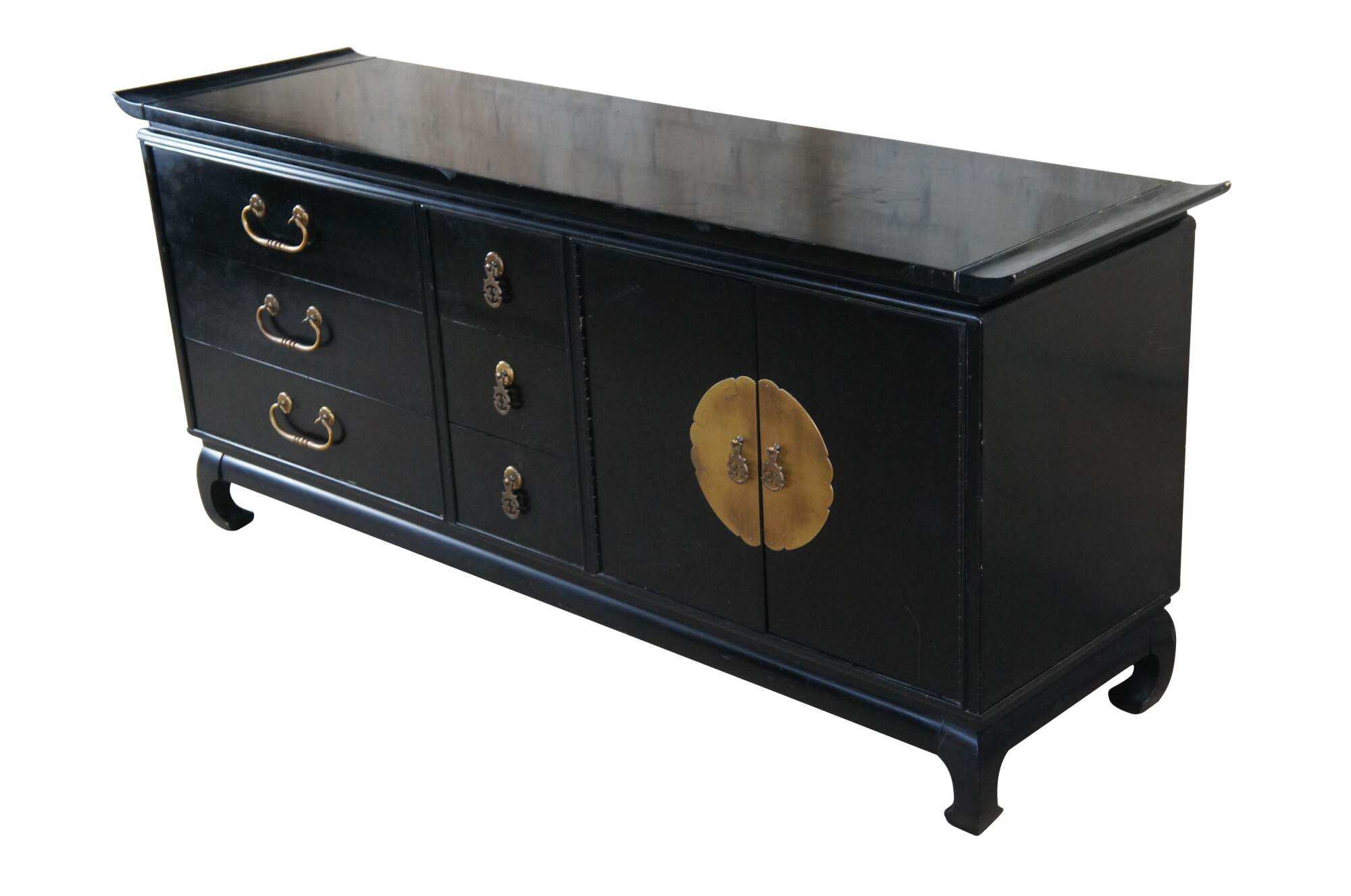 Mid century modern Kent Coffey Amerasia collection black lacquered sideboard / buffet / credenza / console or dresser featuring chinoiserie styling with nine drawers, flared top, brass hardware and ming style feet.