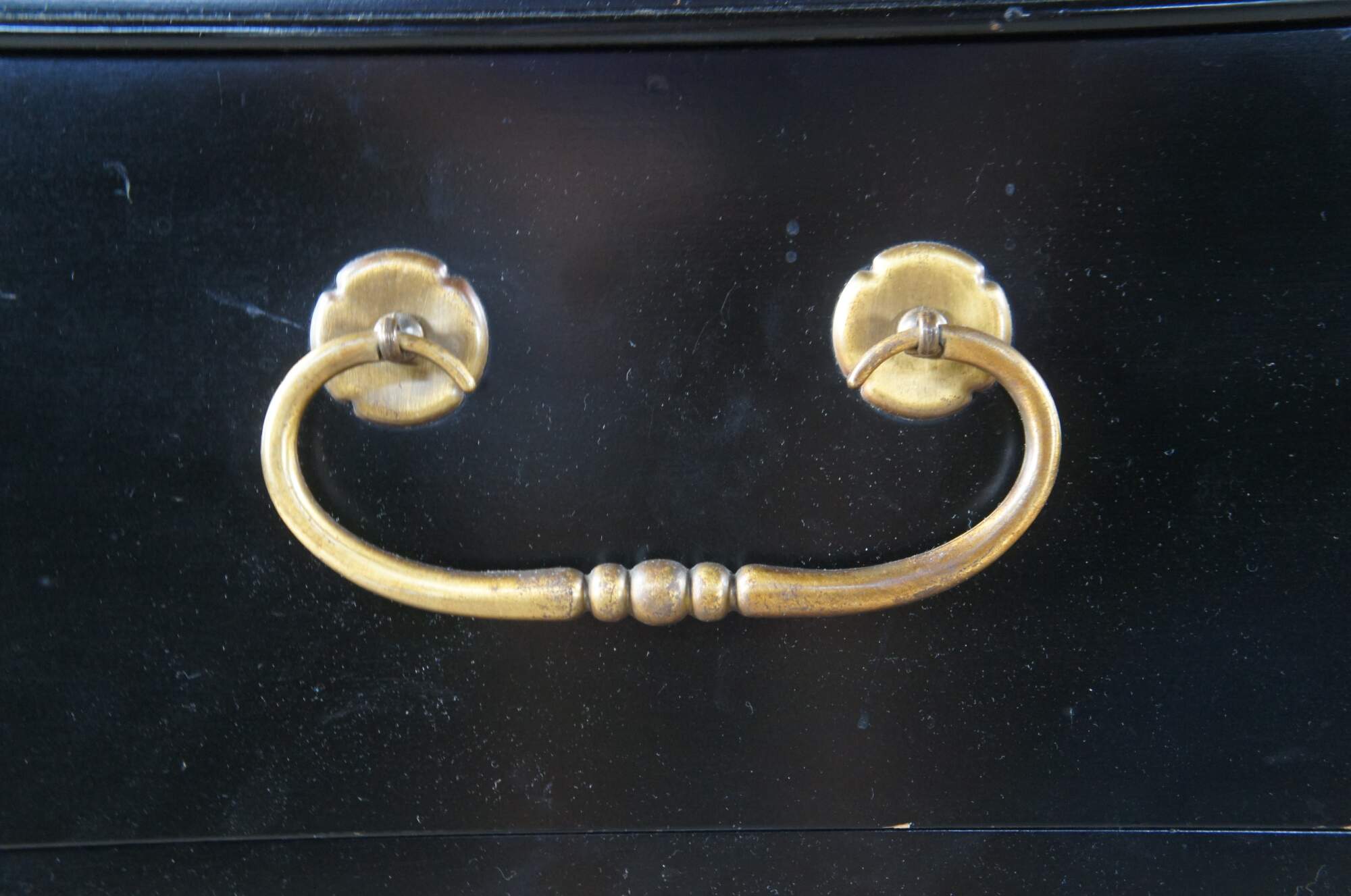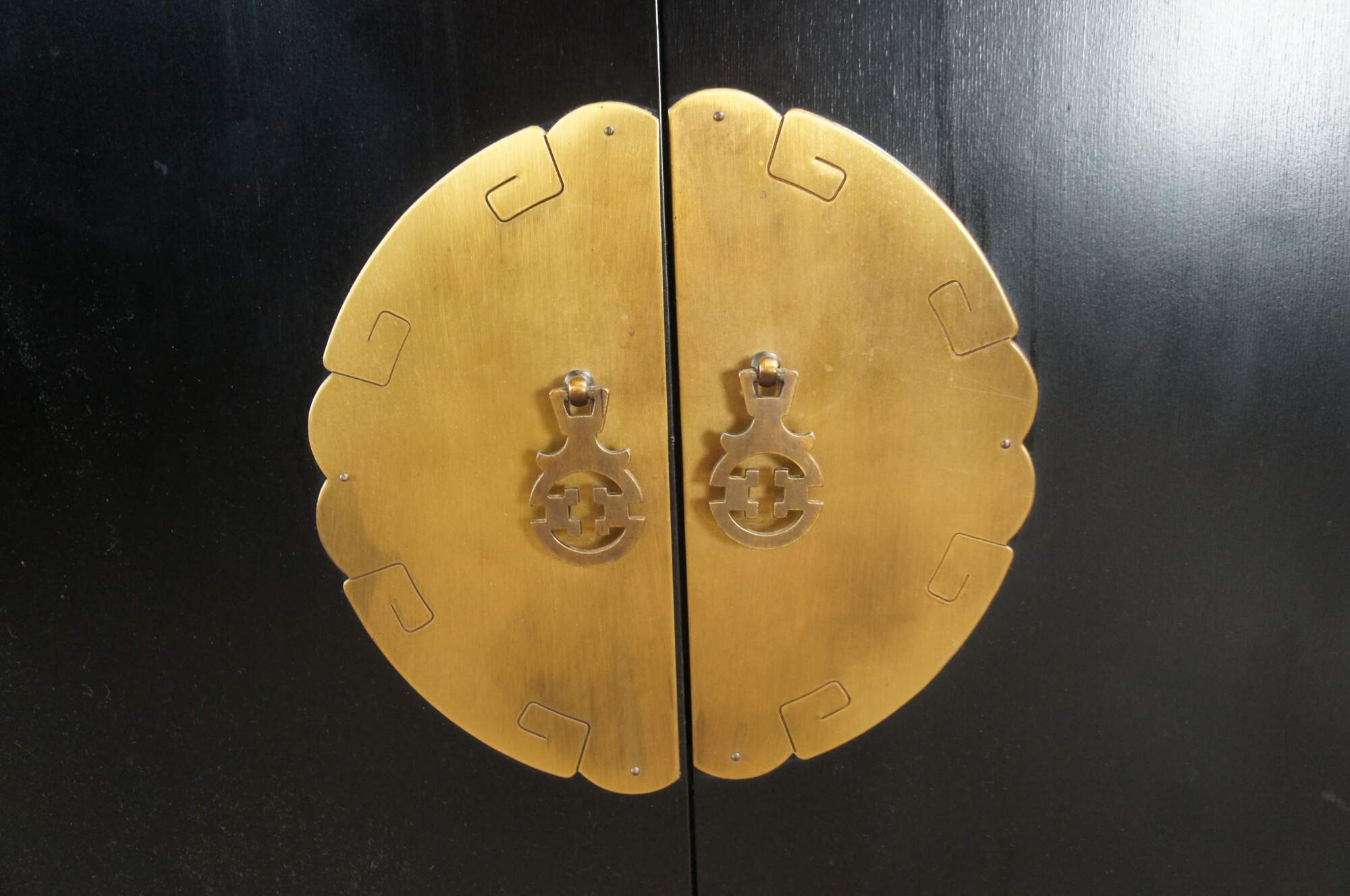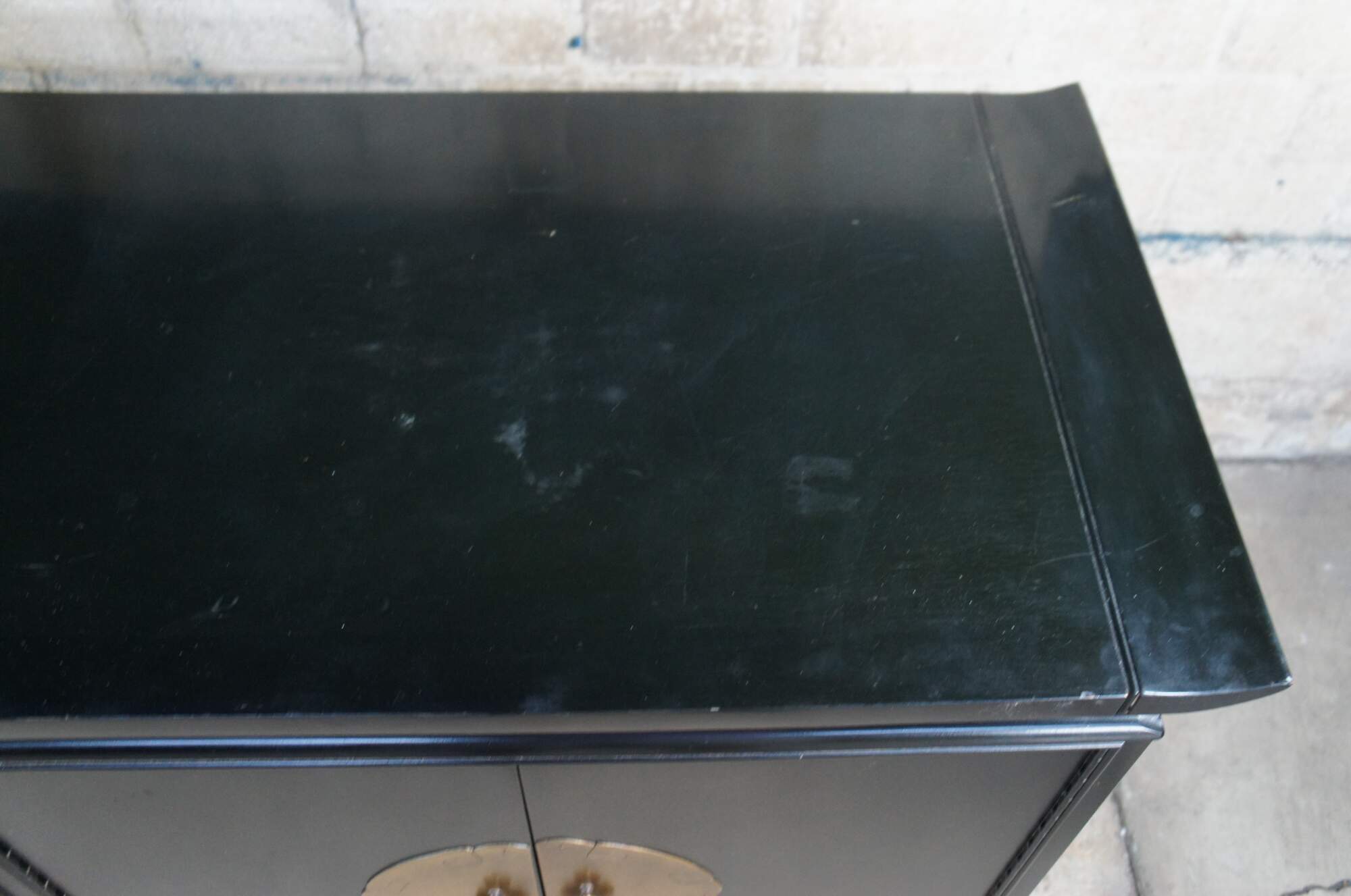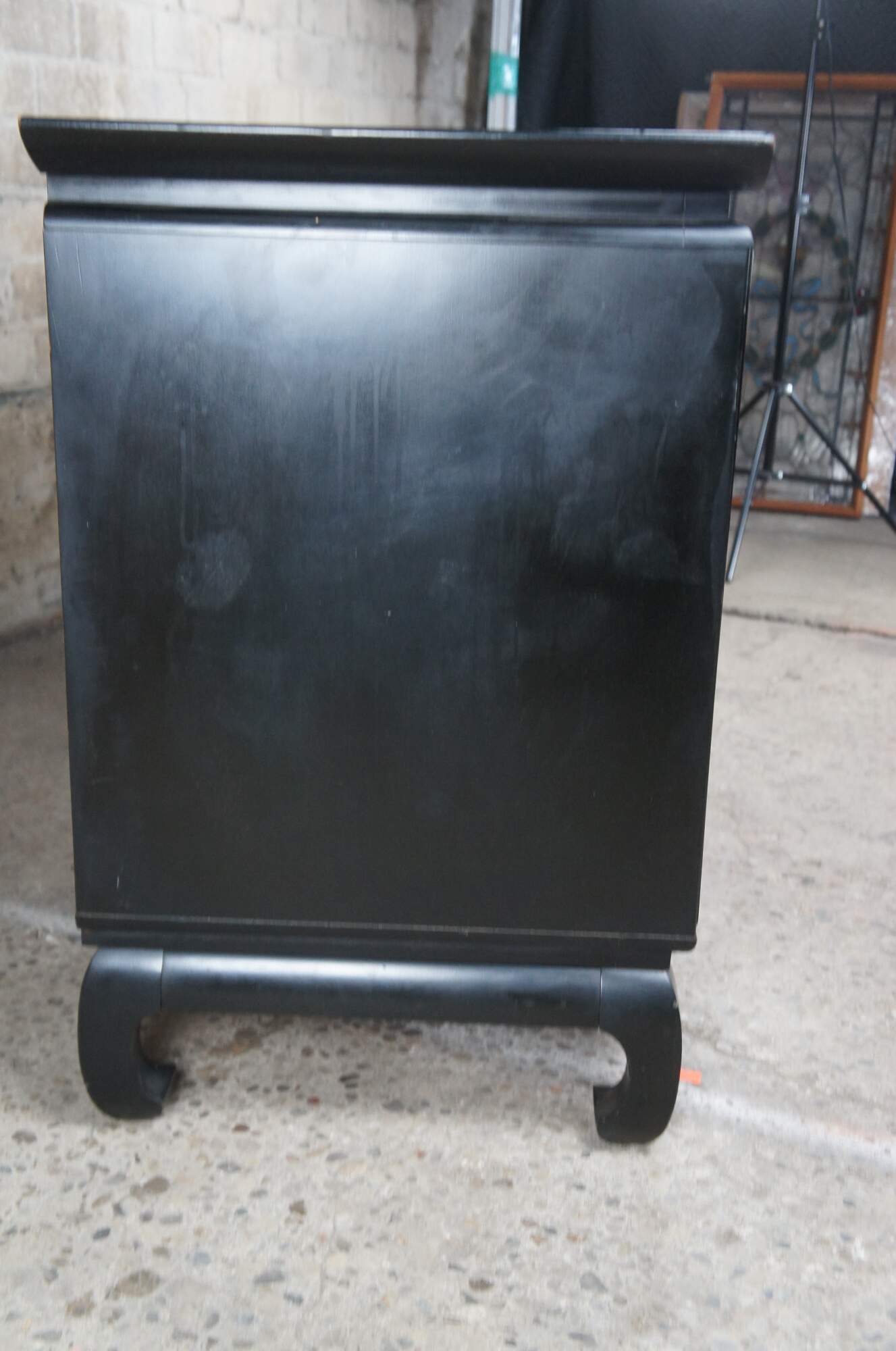 Mid century modern Kent Coffey Amerasia collection black lacquered sideboard / buffet / credenza / console or dresser featuring chinoiserie styling with nine drawers, flared top, brass hardware and ming style feet.