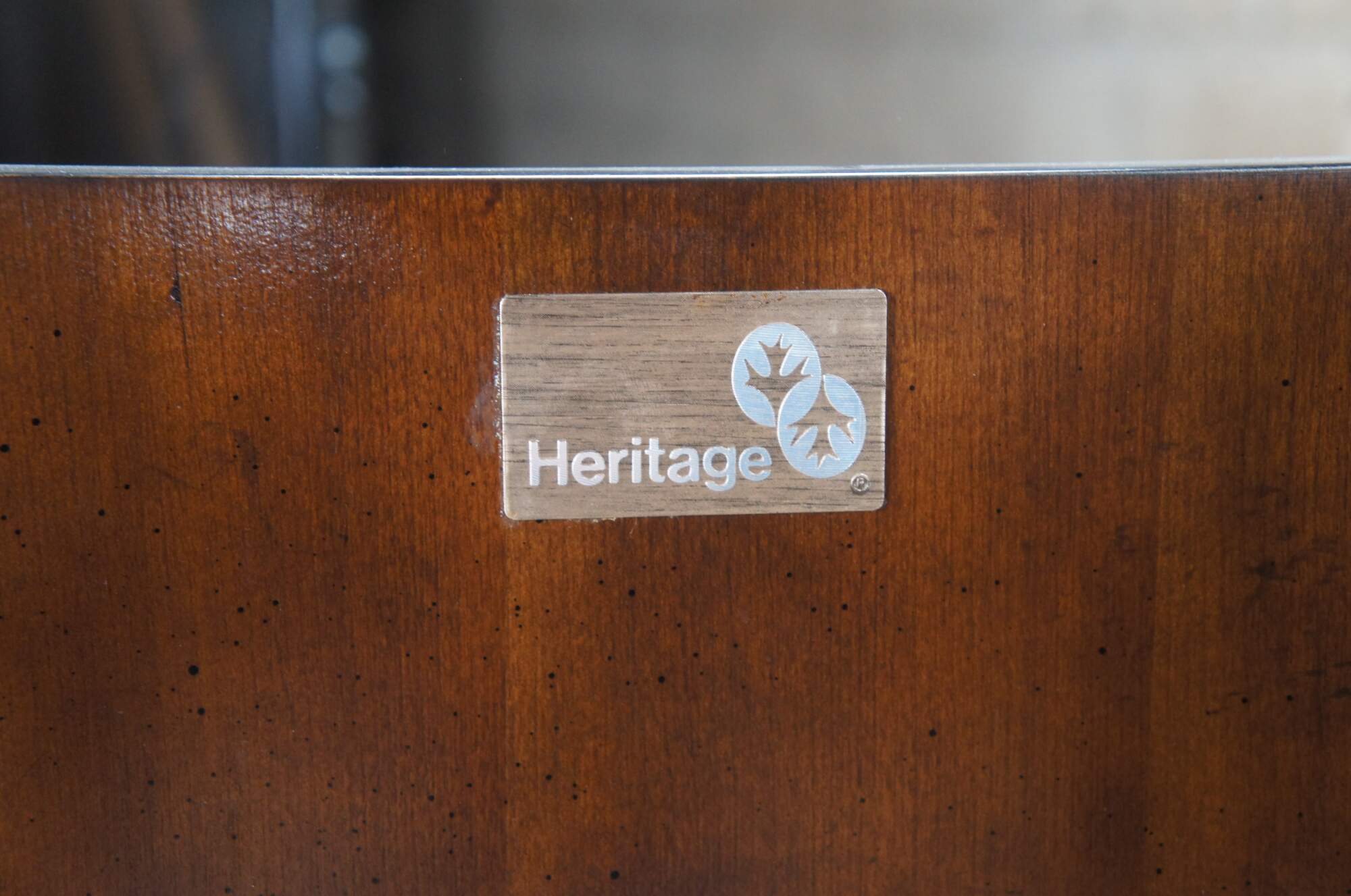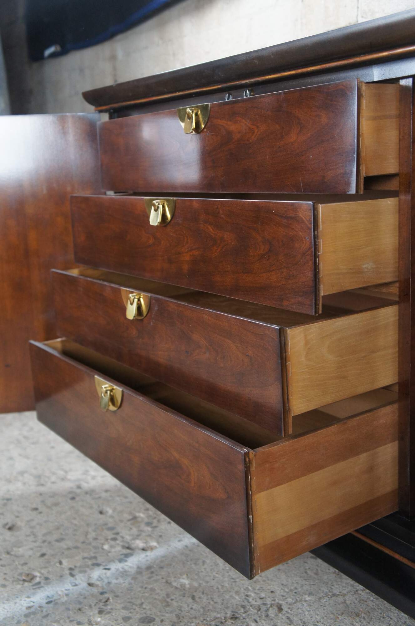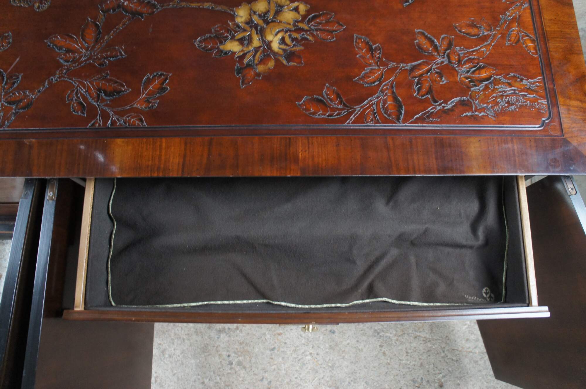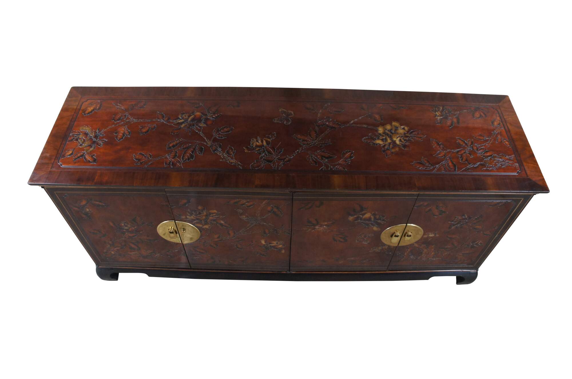 Vintage Drexel Heritage Connoisseur sideboard / buffet / credenza / console. Made of mahogany featuring Hollywood Regency / Chinoiserie styling with embossed floral, bird and butterfly motif and brass hardware. 166-138