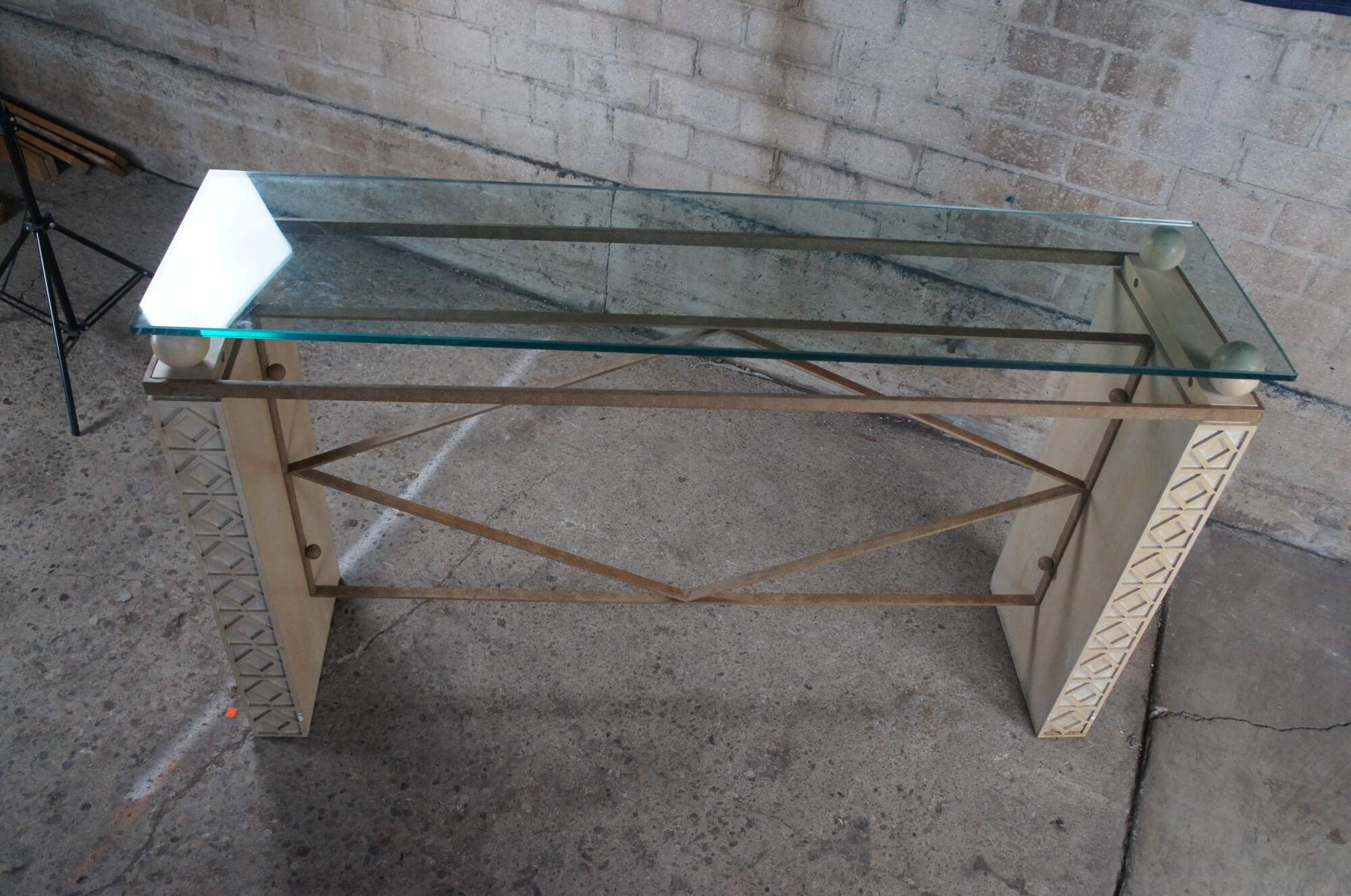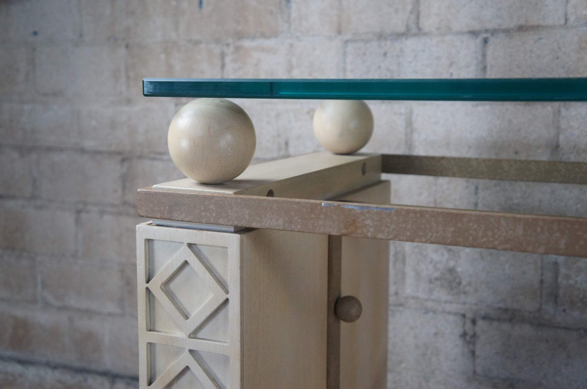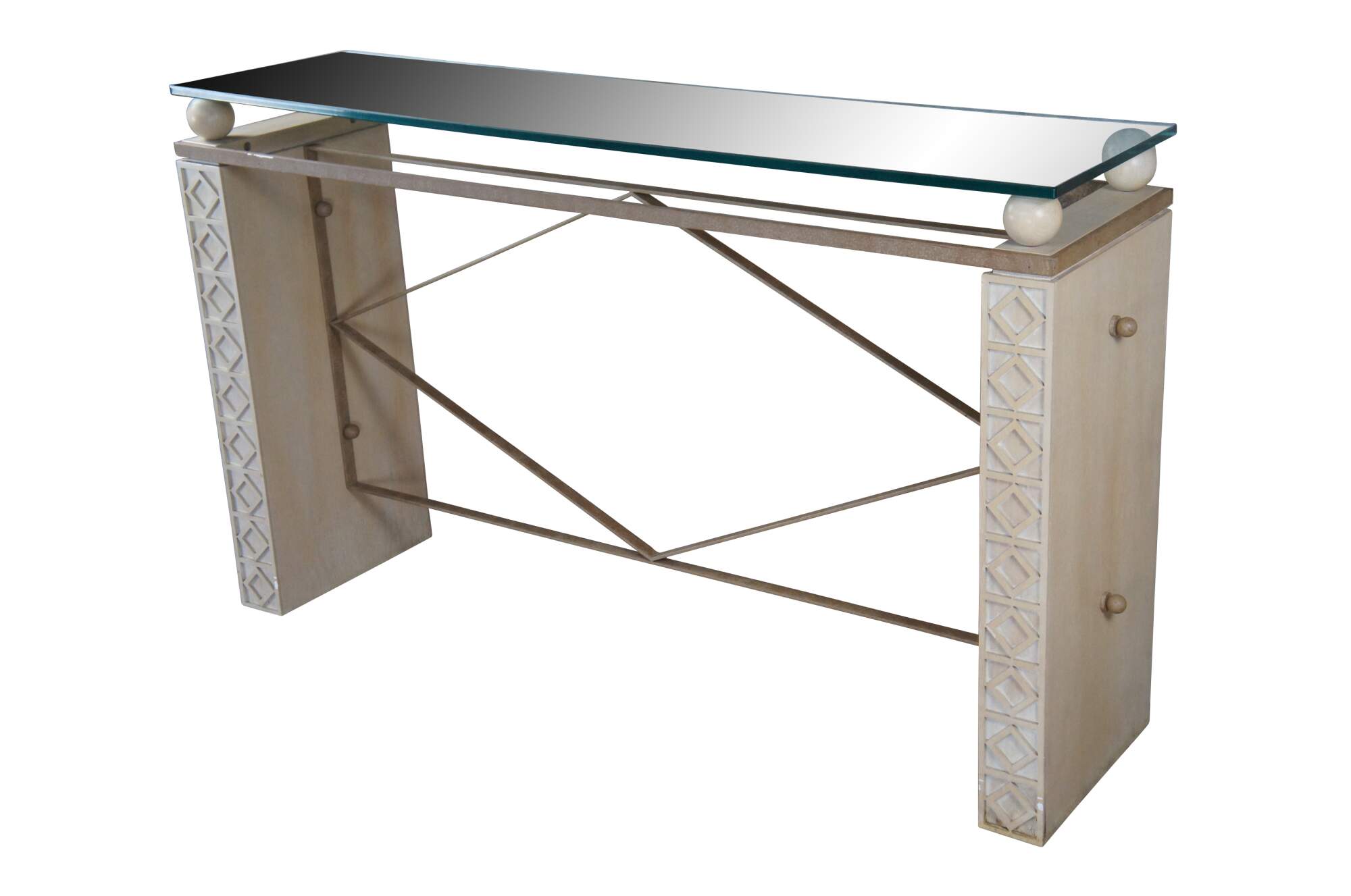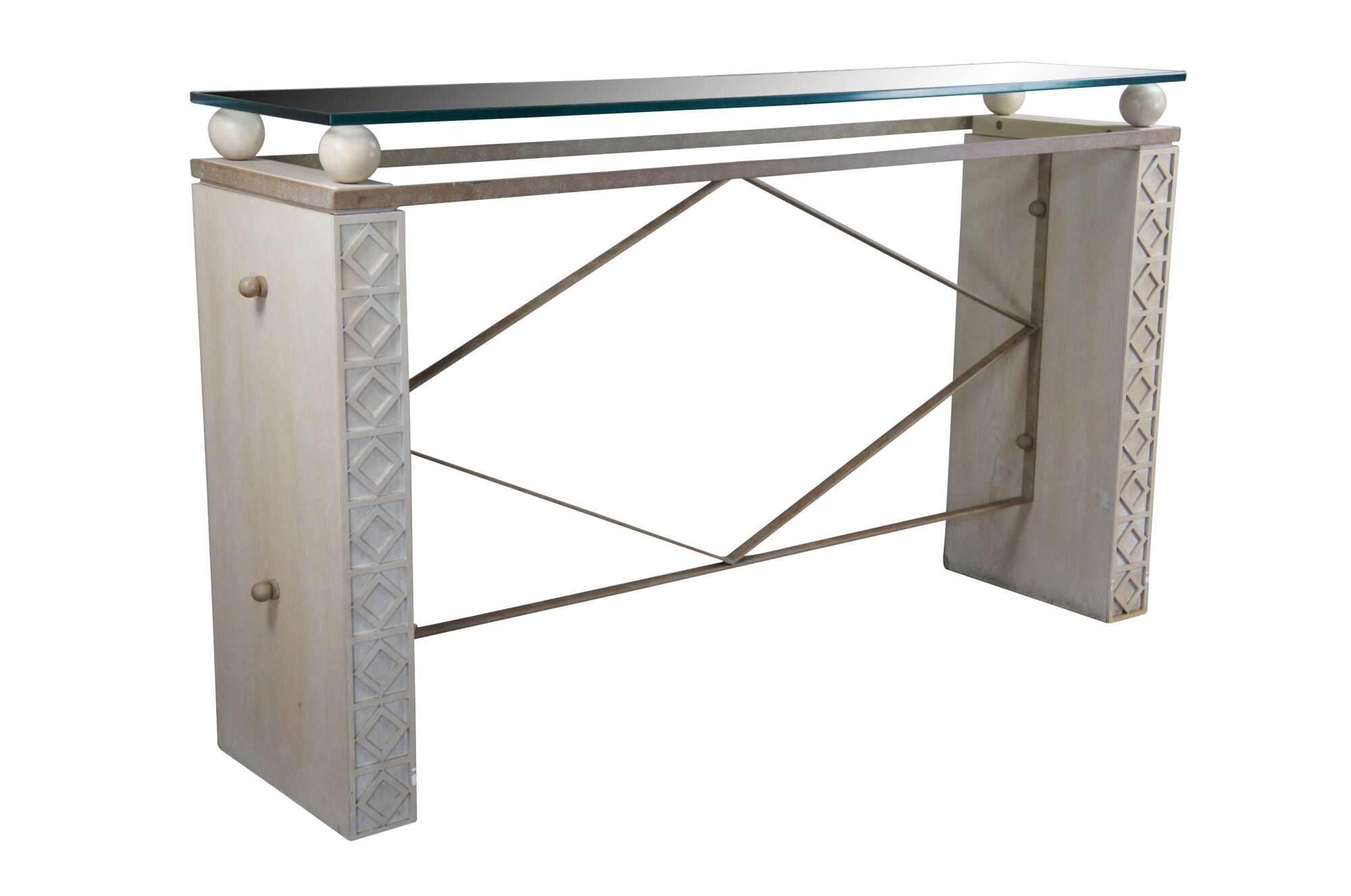 American Mid-Century console table with two solid limed oak side pedestals / panels with a carved diamond pattern fretwork, connected by an iron frame, with a thick glass top set on four round ball / sphere supports.
