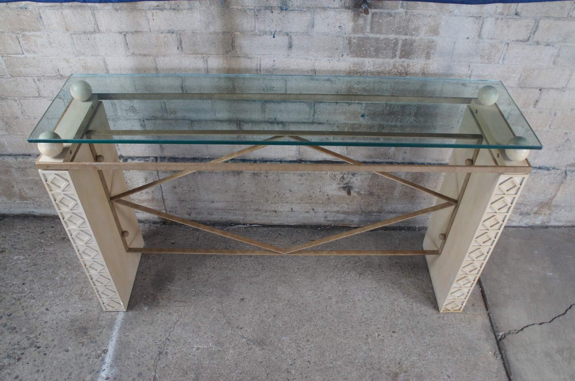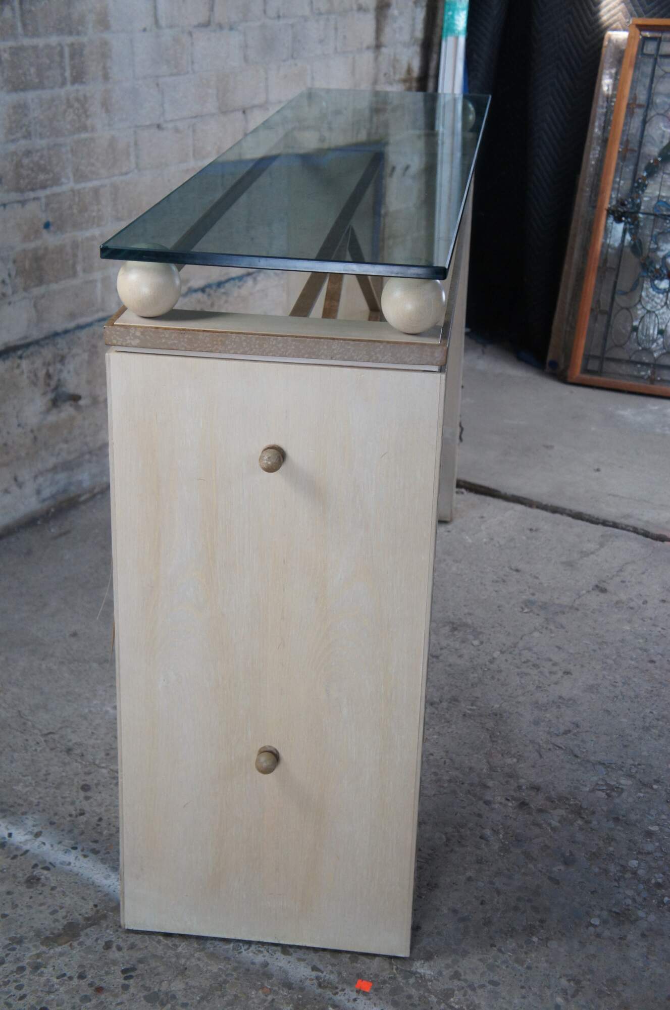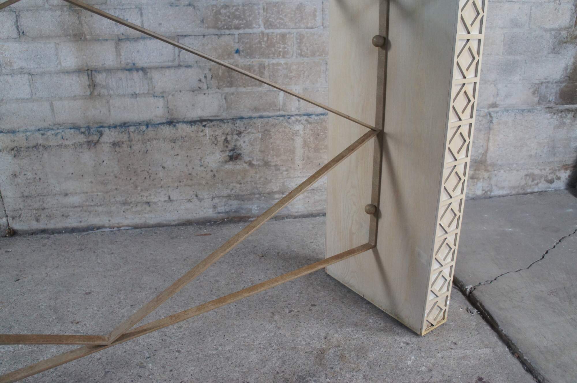American Mid-Century console table with two solid limed oak side pedestals / panels with a carved diamond pattern fretwork, connected by an iron frame, with a thick glass top set on four round ball / sphere supports.