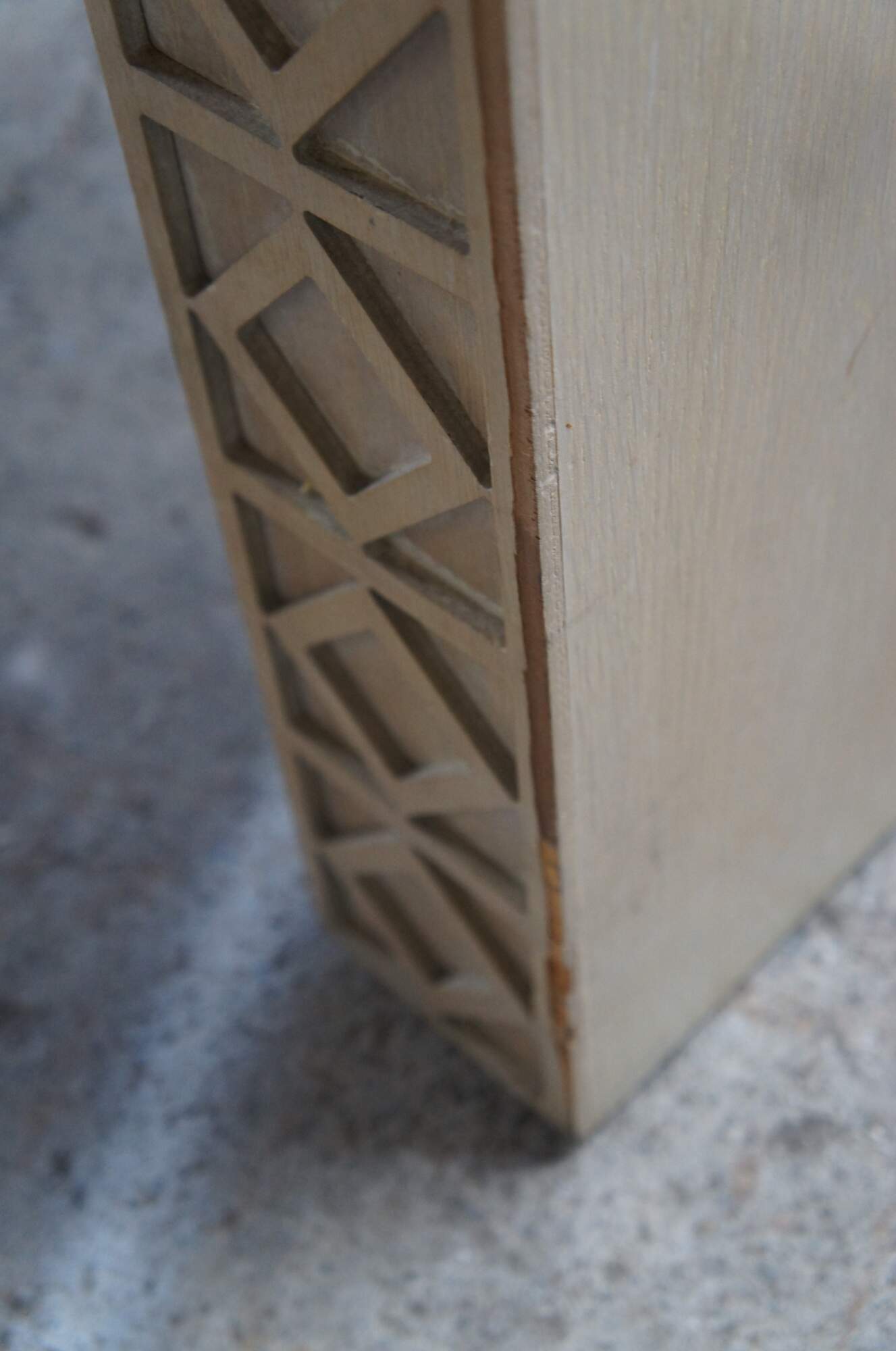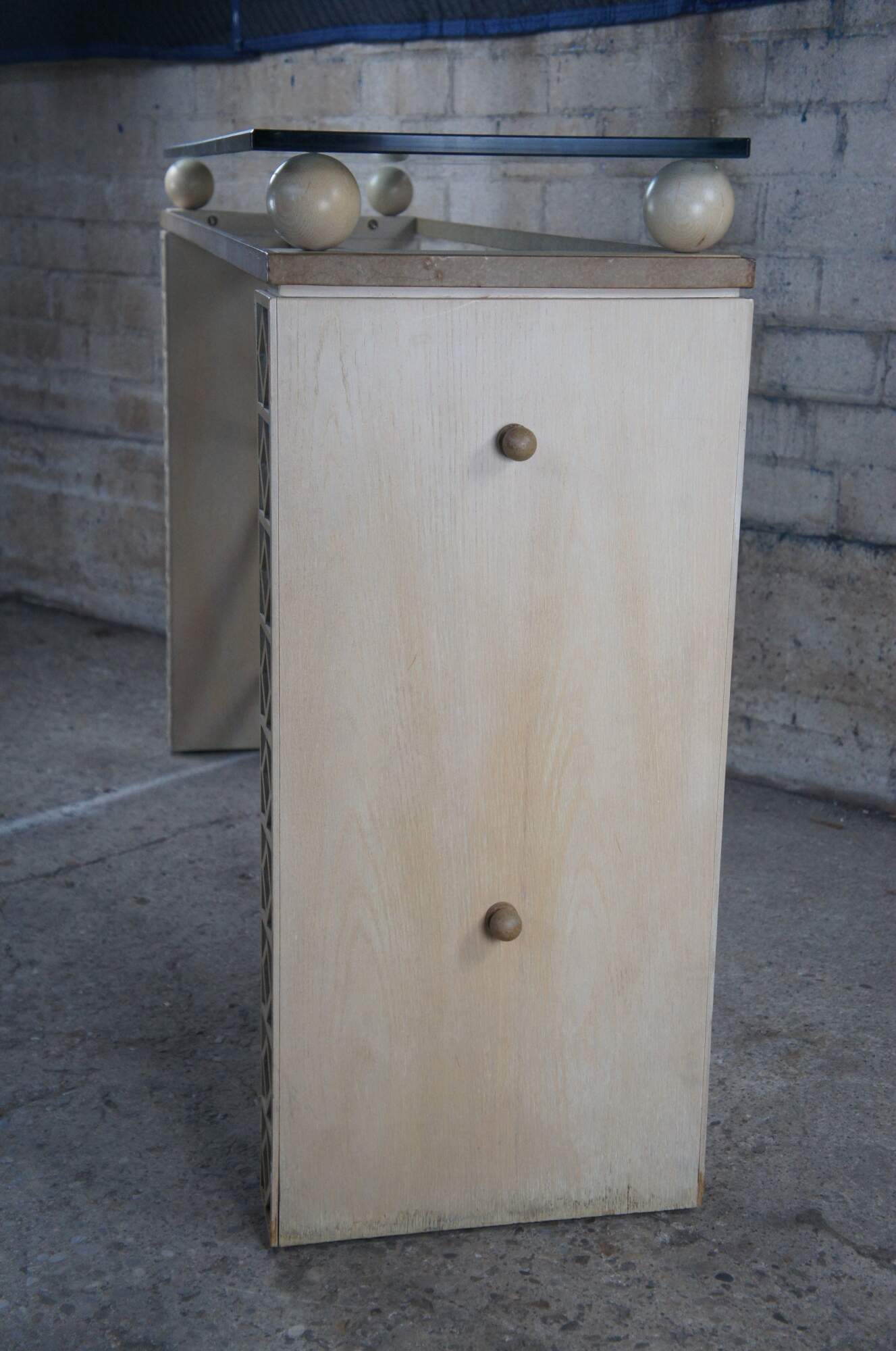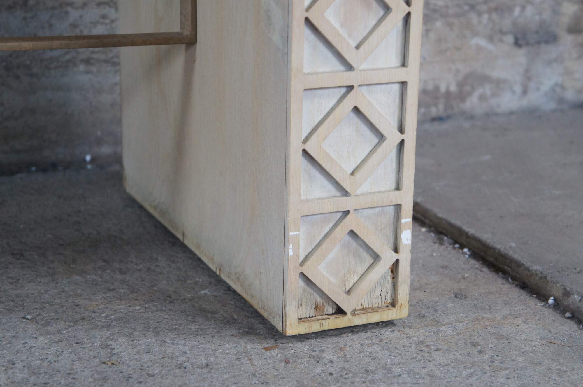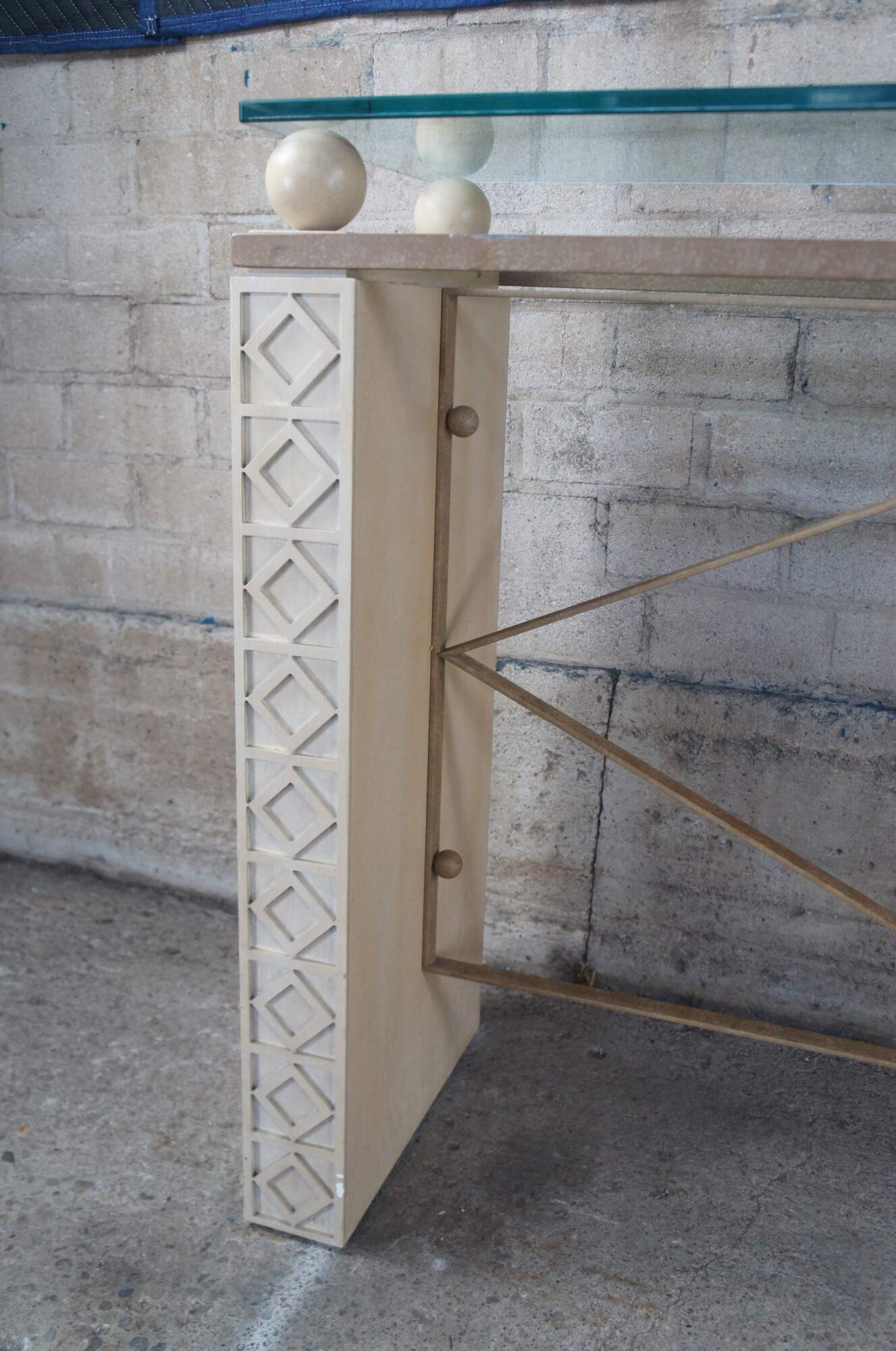 American Mid-Century console table with two solid limed oak side pedestals / panels with a carved diamond pattern fretwork, connected by an iron frame, with a thick glass top set on four round ball / sphere supports.
