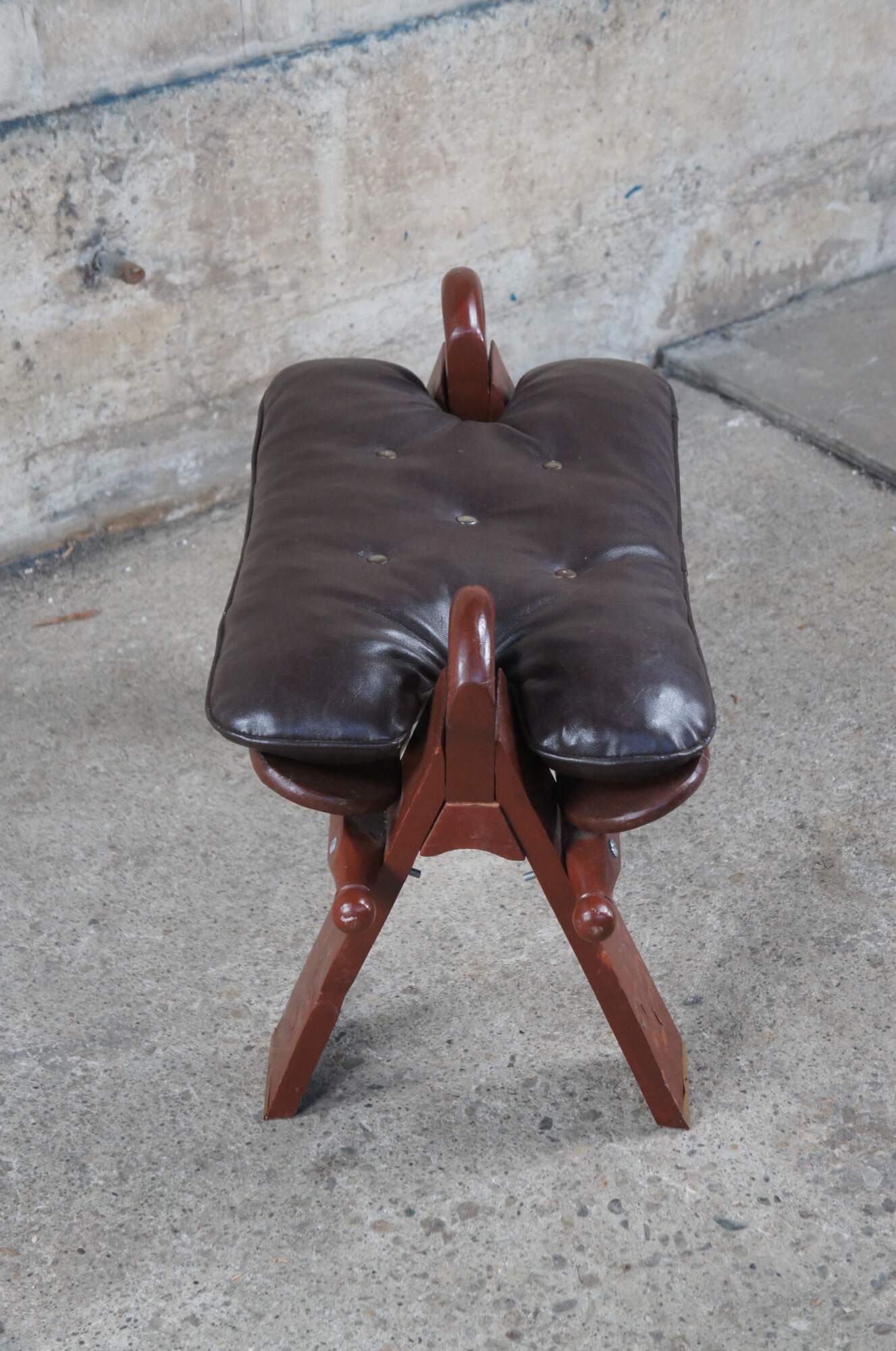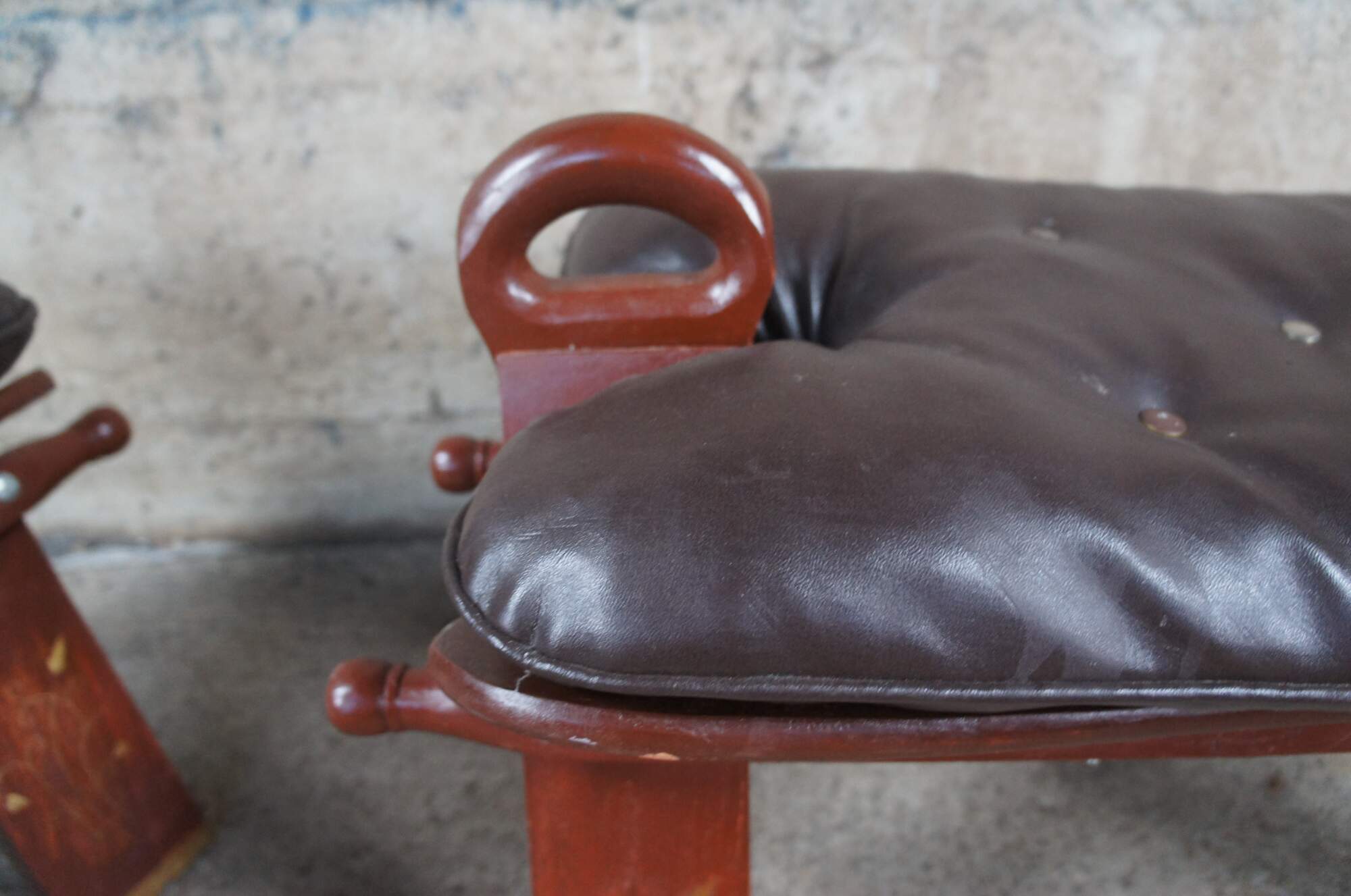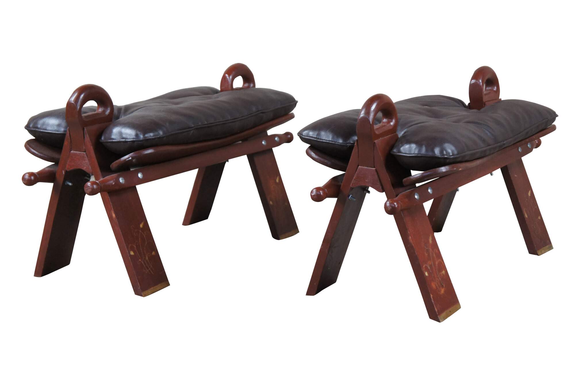 Pair of two mid century (1960s) camel seat stools. Made of wood featuring tufted leather seat and brass accents.