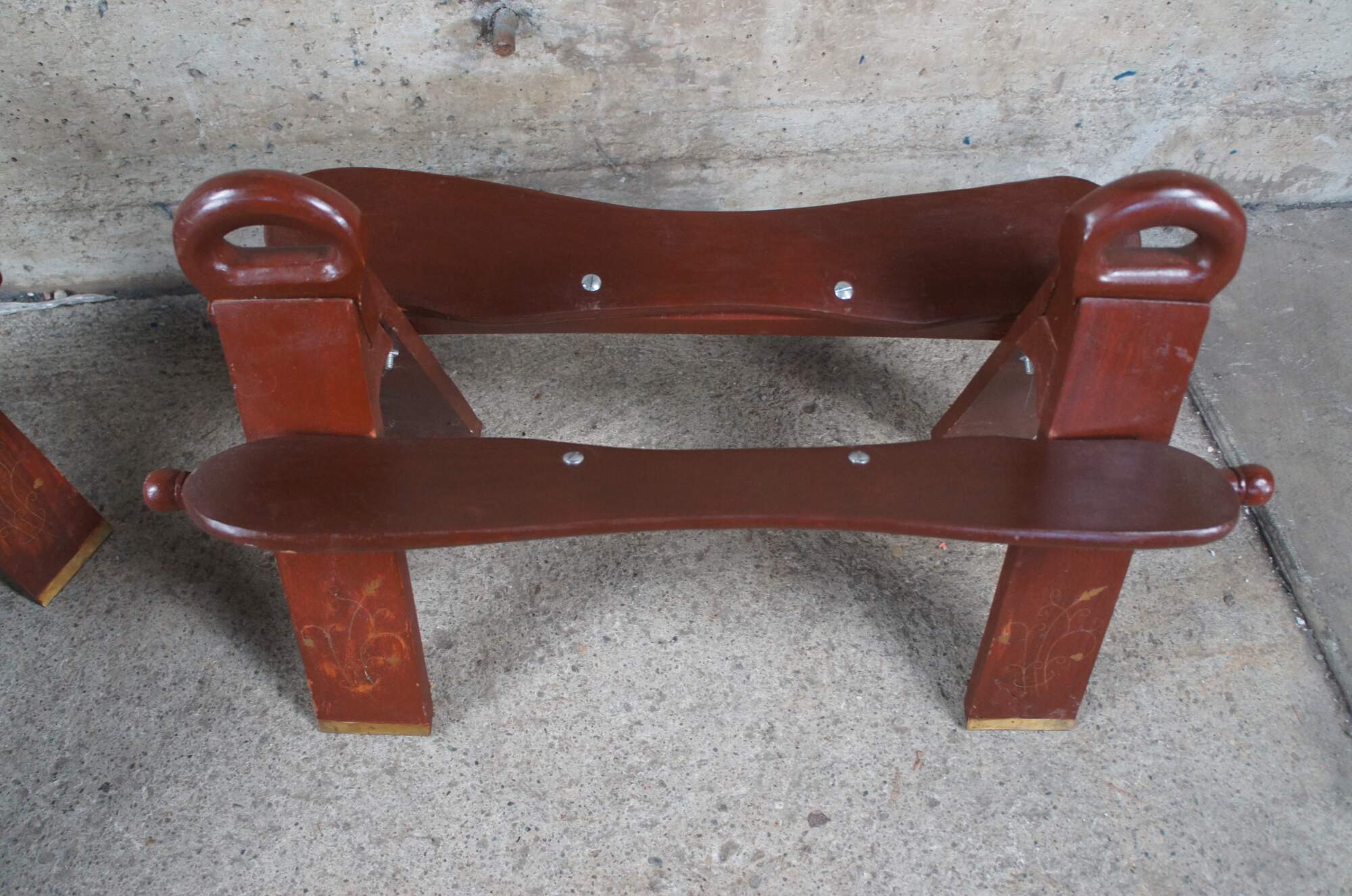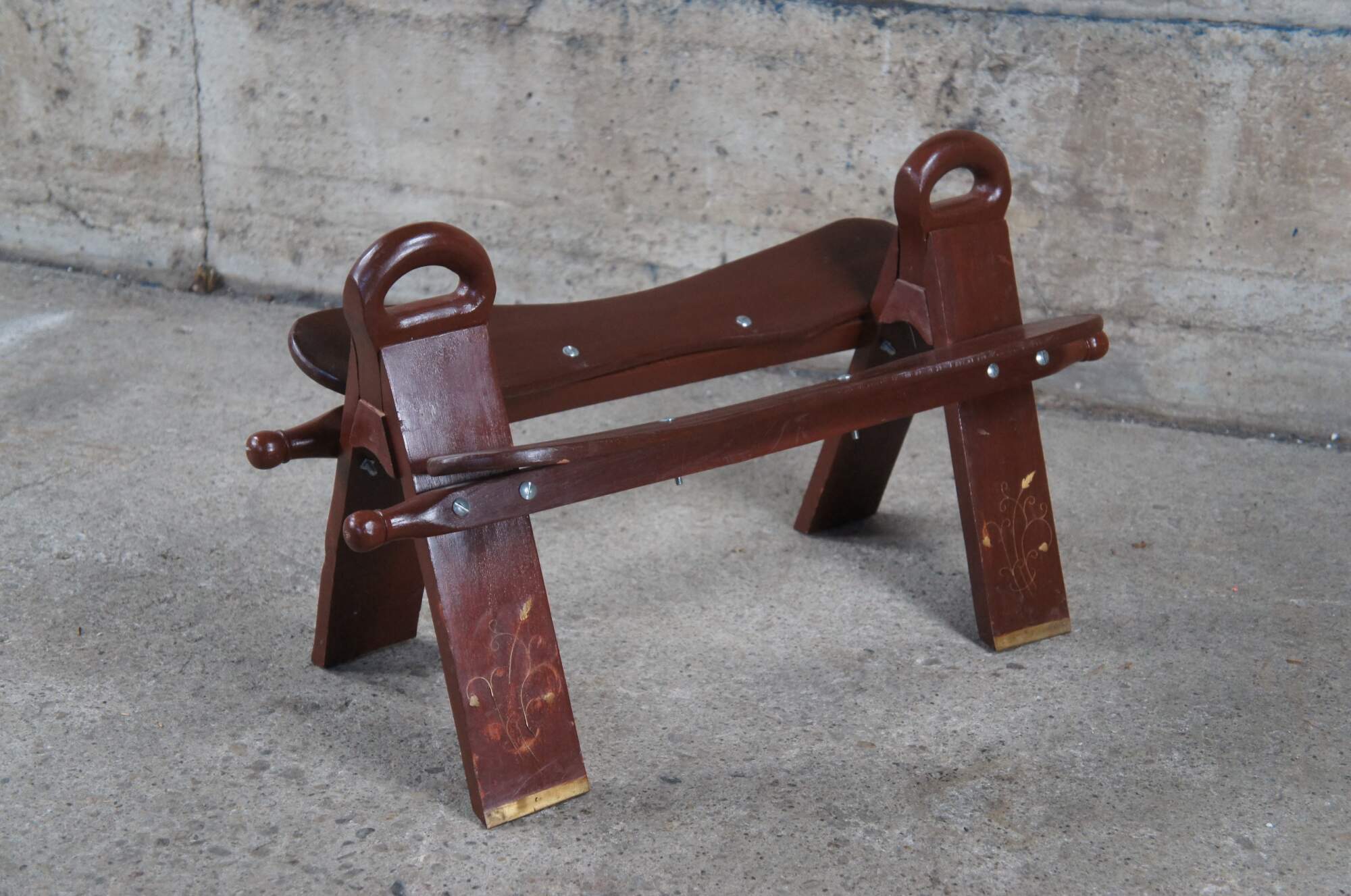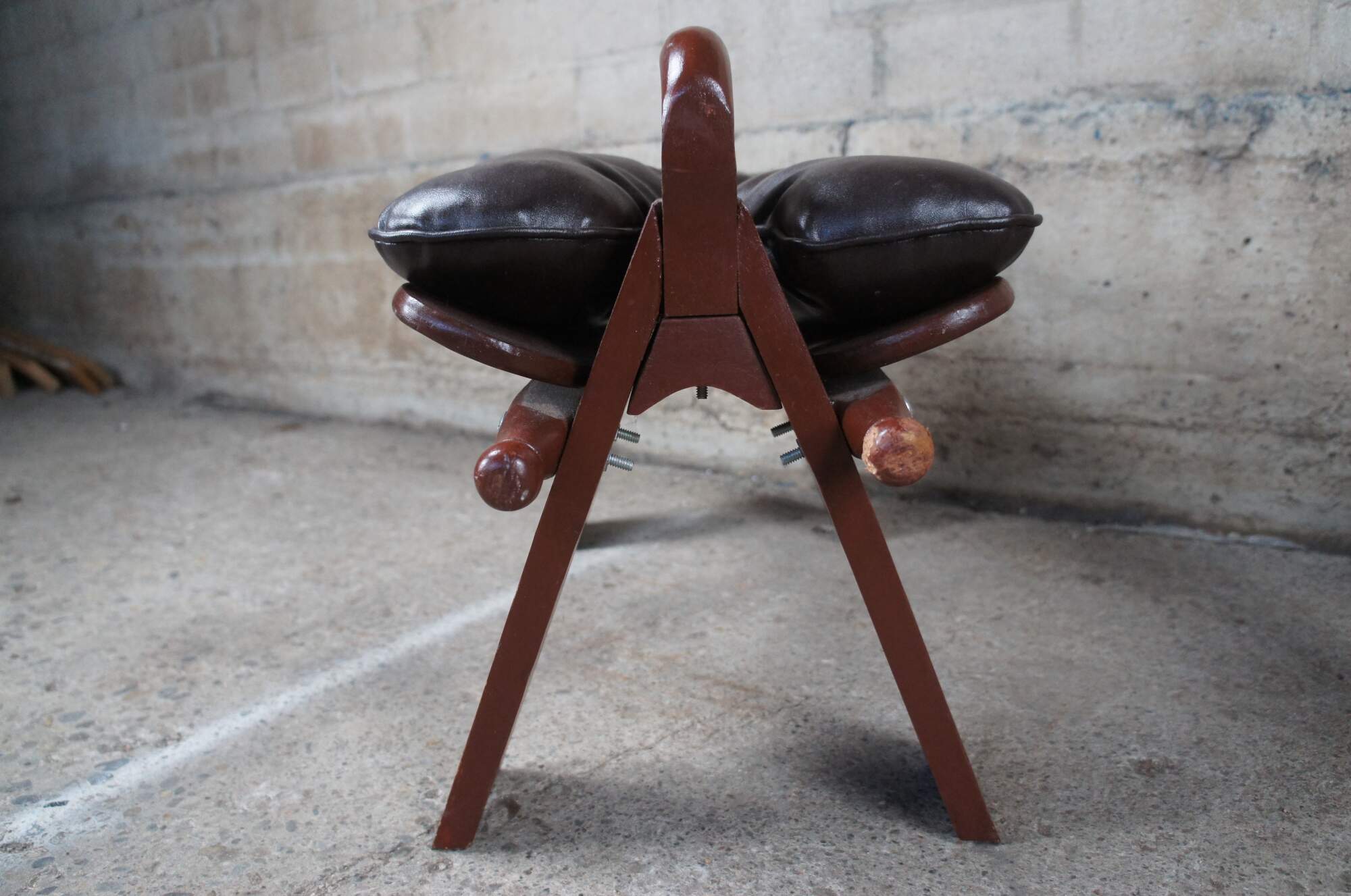 Pair of two mid century (1960s) camel seat stools. Made of wood featuring tufted leather seat and brass accents.