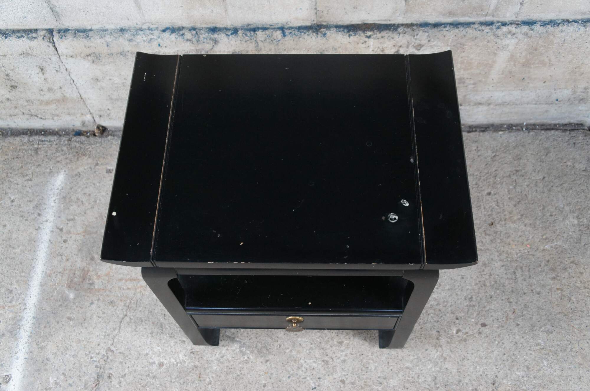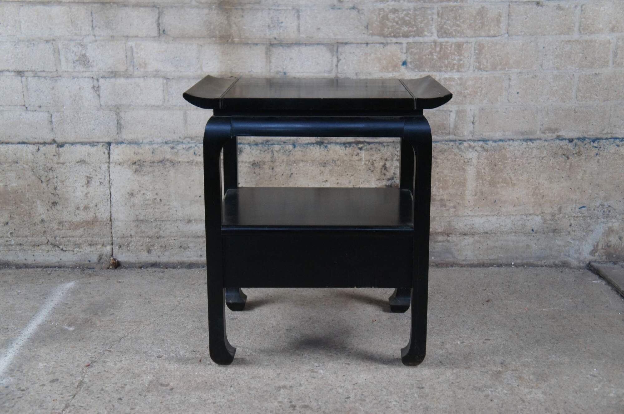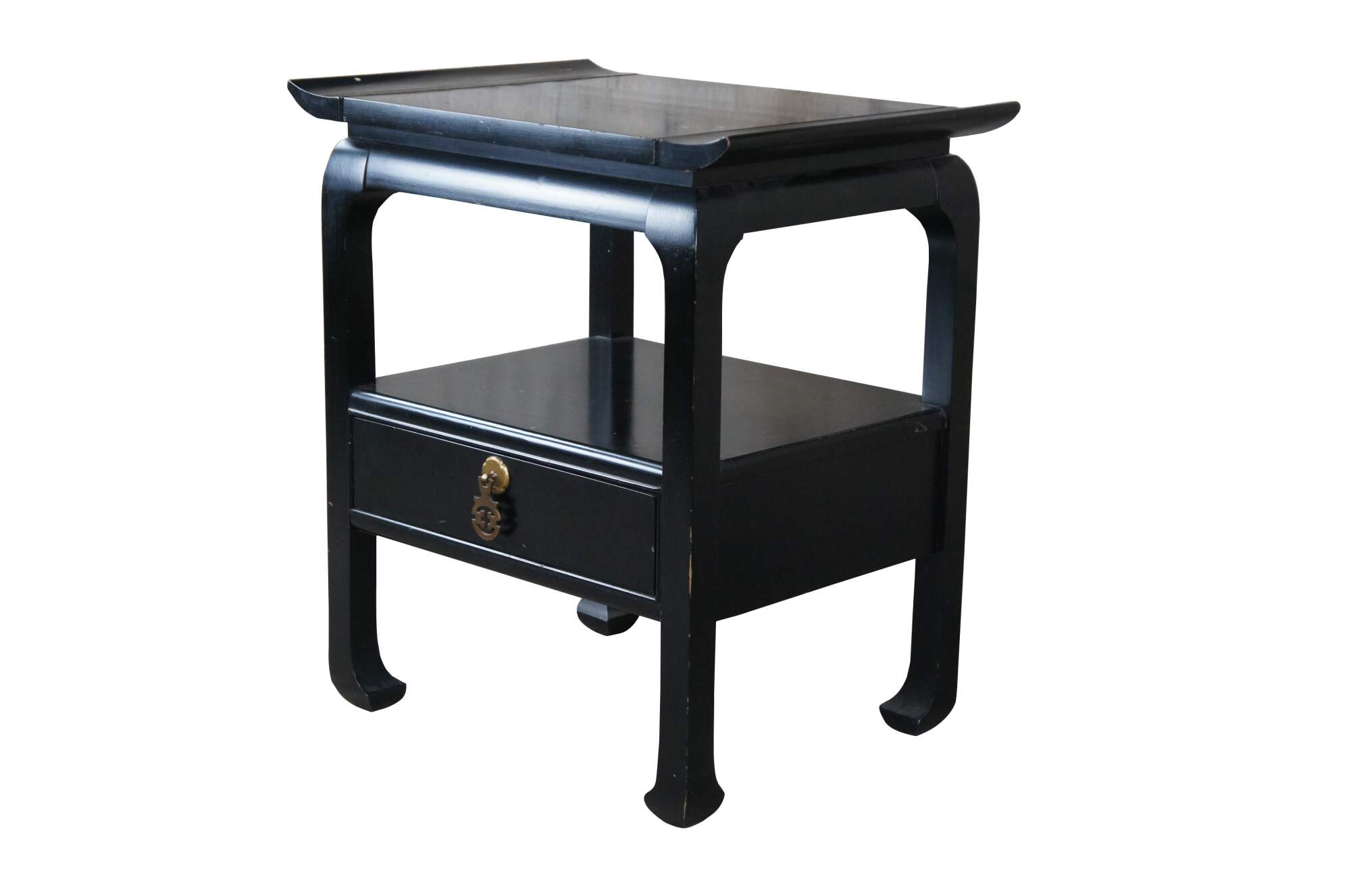 Vintage Chinese Chippendale side accent table or nightstand featuring chinoiserie styling with tiered design, one drawer and flared top.