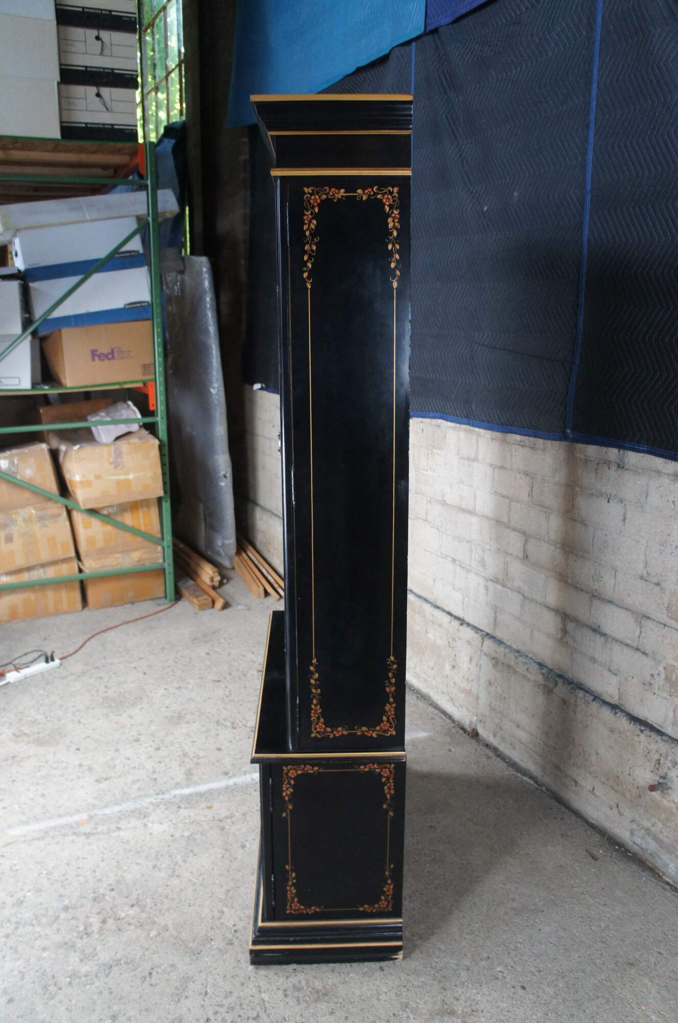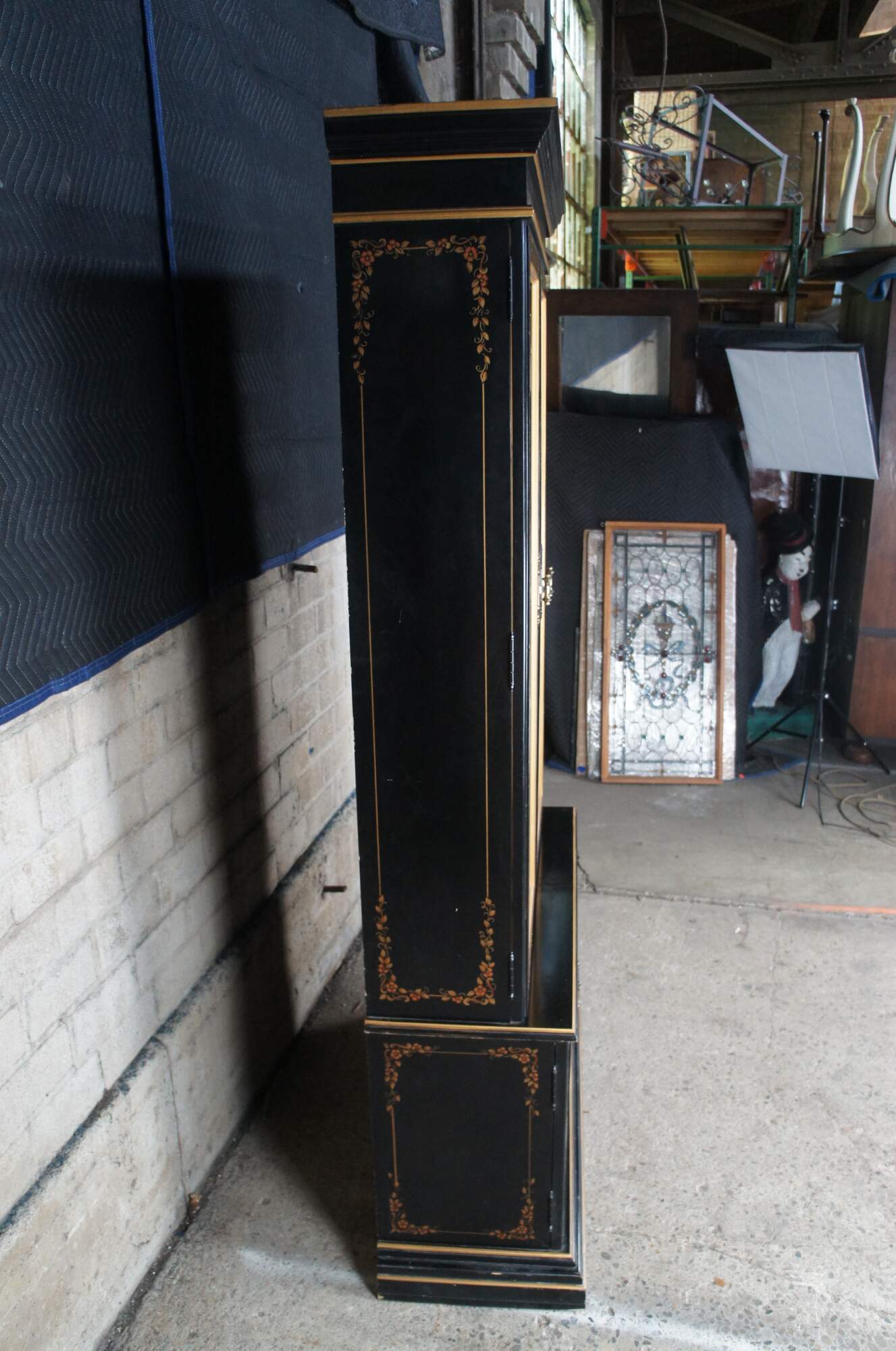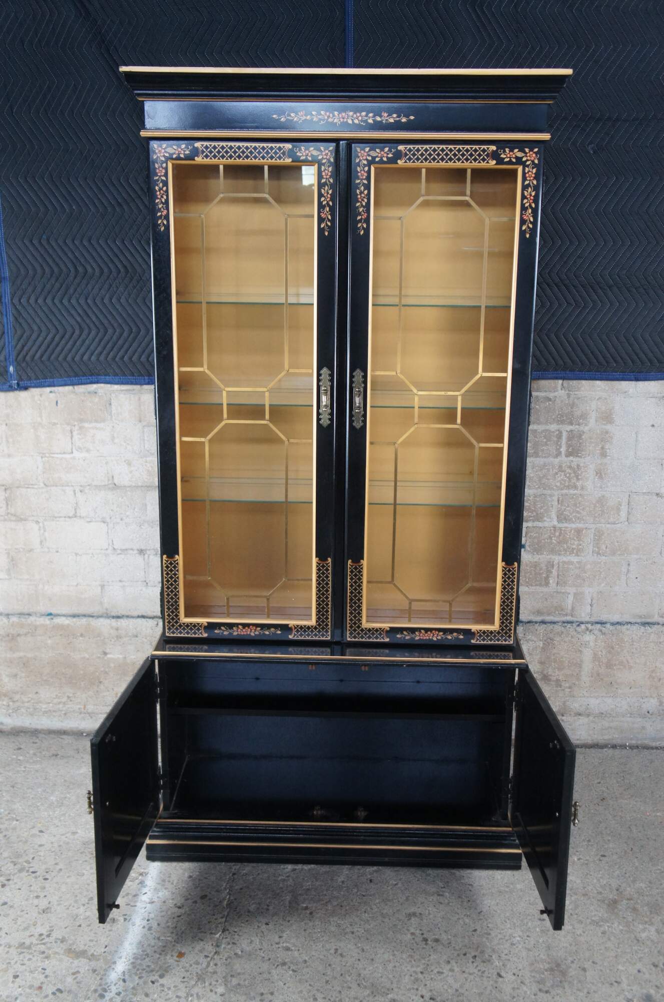 Vintage Habersham black lacquer illuminated china display cabinet. Chinese Chippendale / Chinoiserie styling with upper lattice doors decorated with floral motif, over lower cabinet that features a landscape / seascape with pagoda and fisherman.