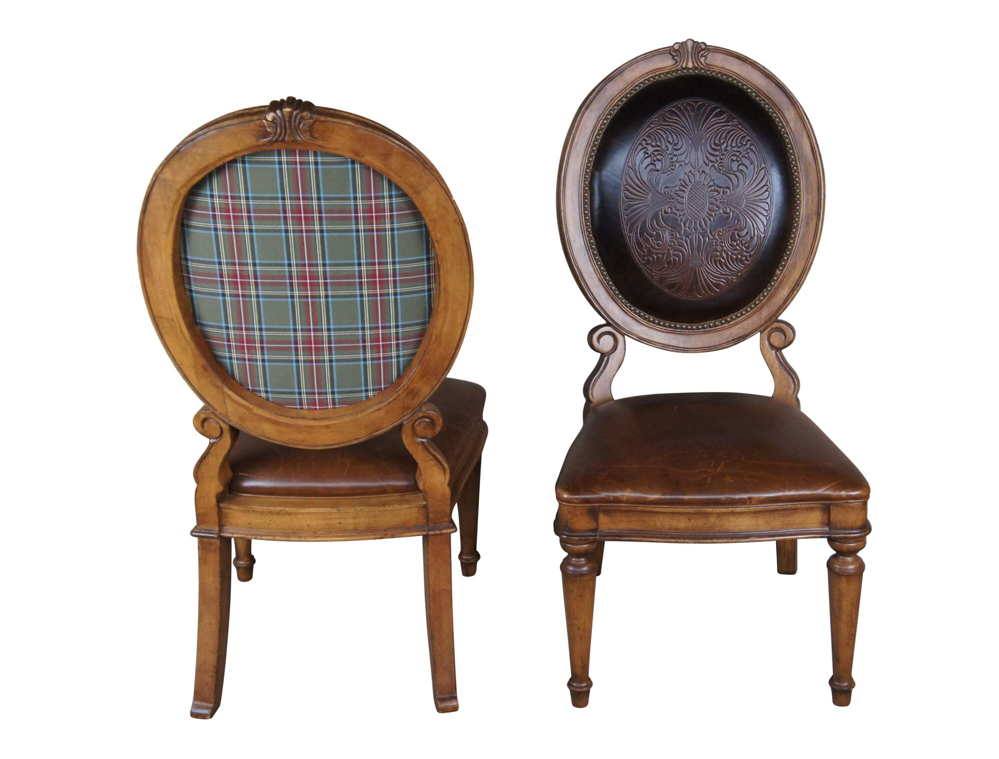 Vintage set of ten Tuscan Old World style oval back dining chairs. Featuring tooled leather nailhead back with scrolled supports, leather seat, and plaid upholstered back. The chairs are supported by turned and tapered front feet and spade feet along the back.