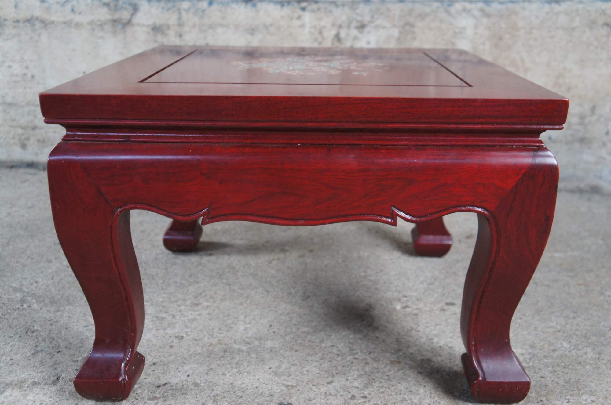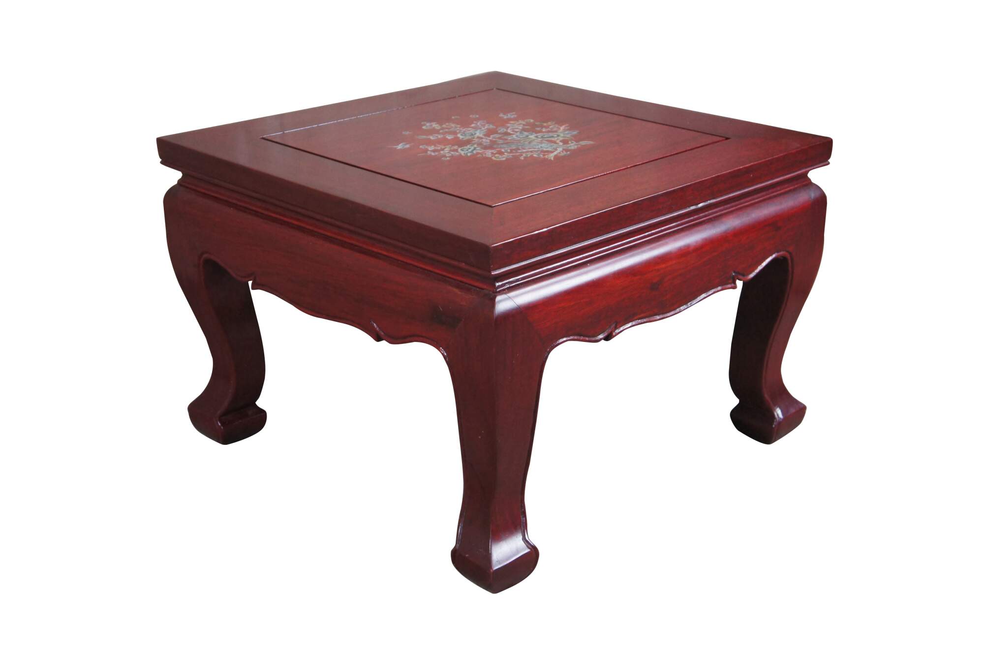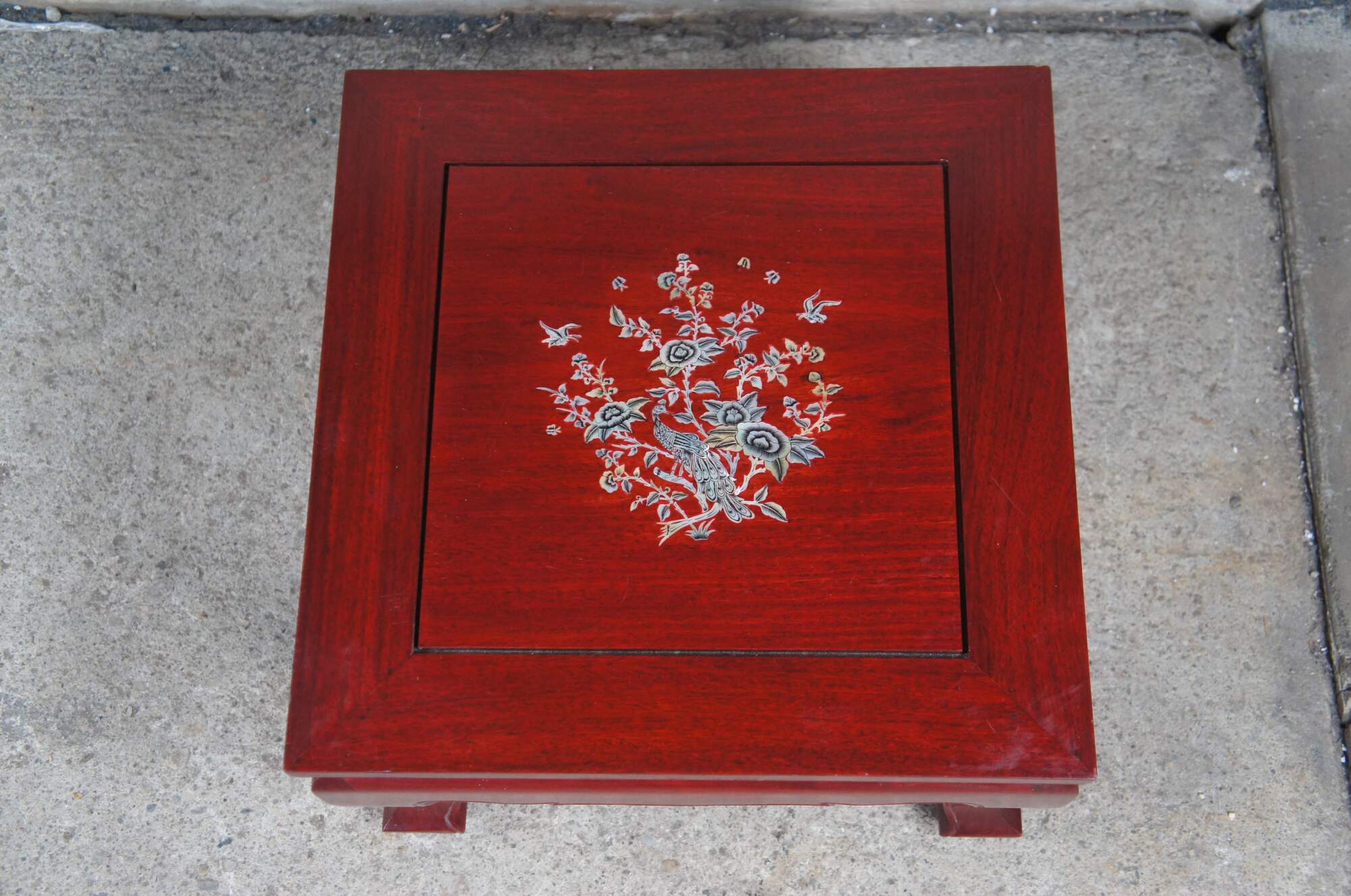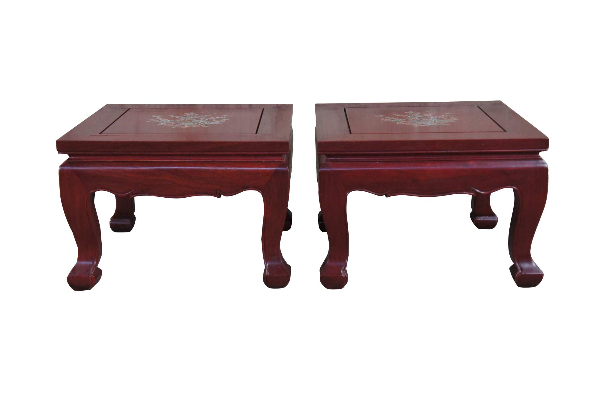 Pair of vintage Chinese Rosewood foot stools or low side tables featuring square form with inlaid MOP mother of pearl floral rose peacock and butterfly design supported by Chippendale style legs. Great for use as plant stands or sculpture pedestals.
