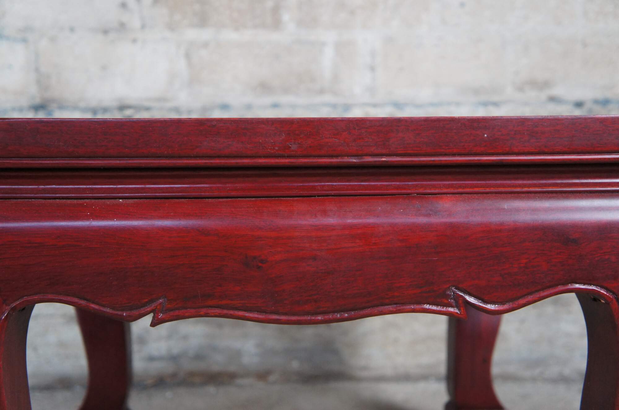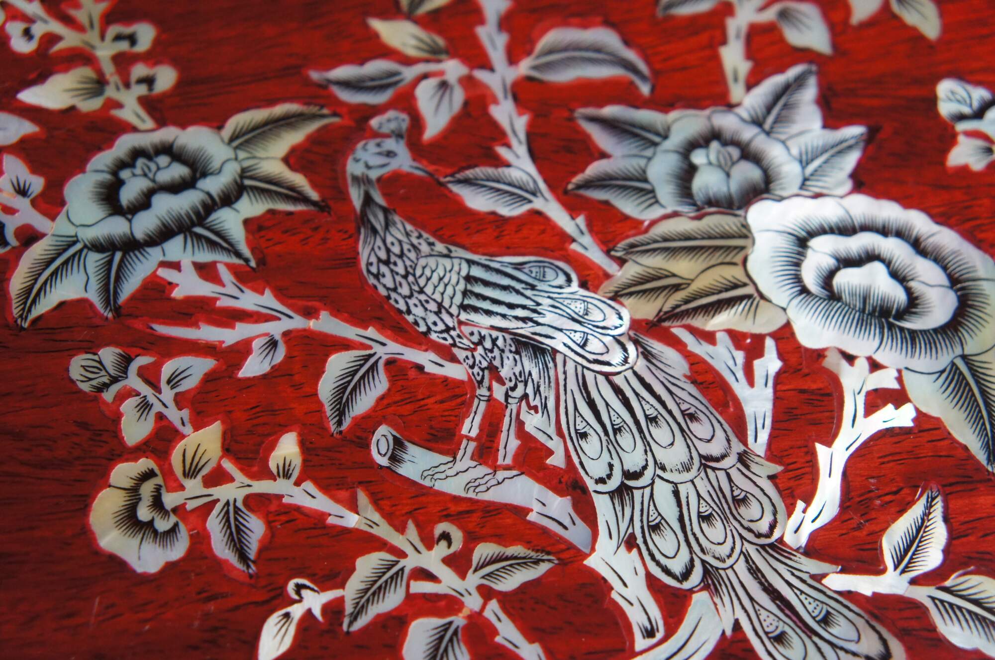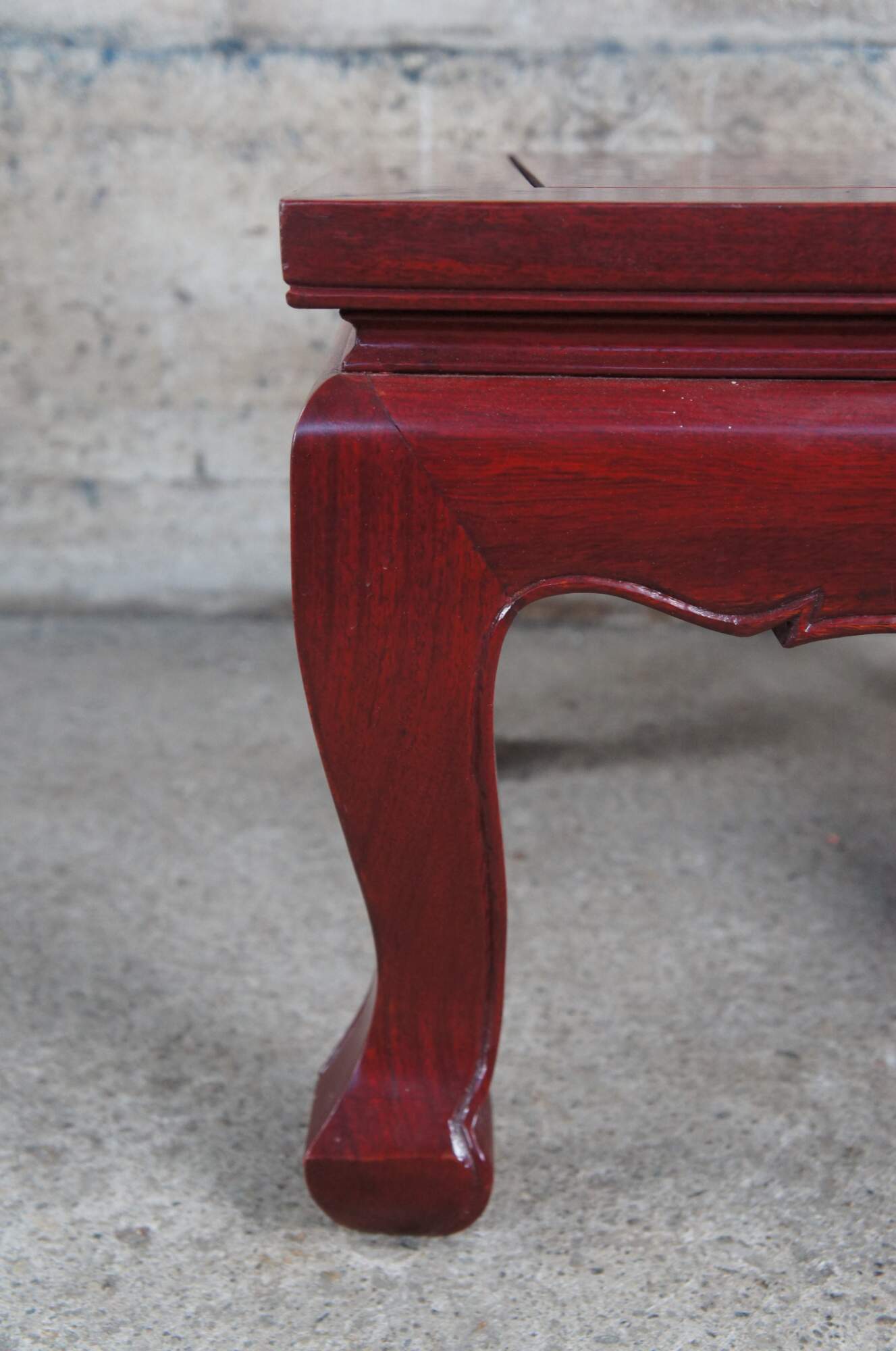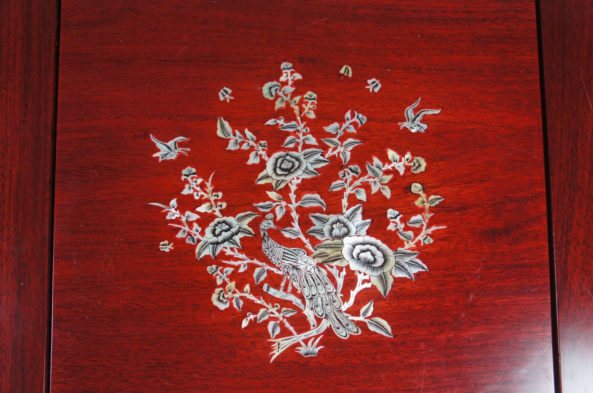Pair of vintage Chinese Rosewood foot stools or low side tables featuring square form with inlaid MOP mother of pearl floral rose peacock and butterfly design supported by Chippendale style legs. Great for use as plant stands or sculpture pedestals.