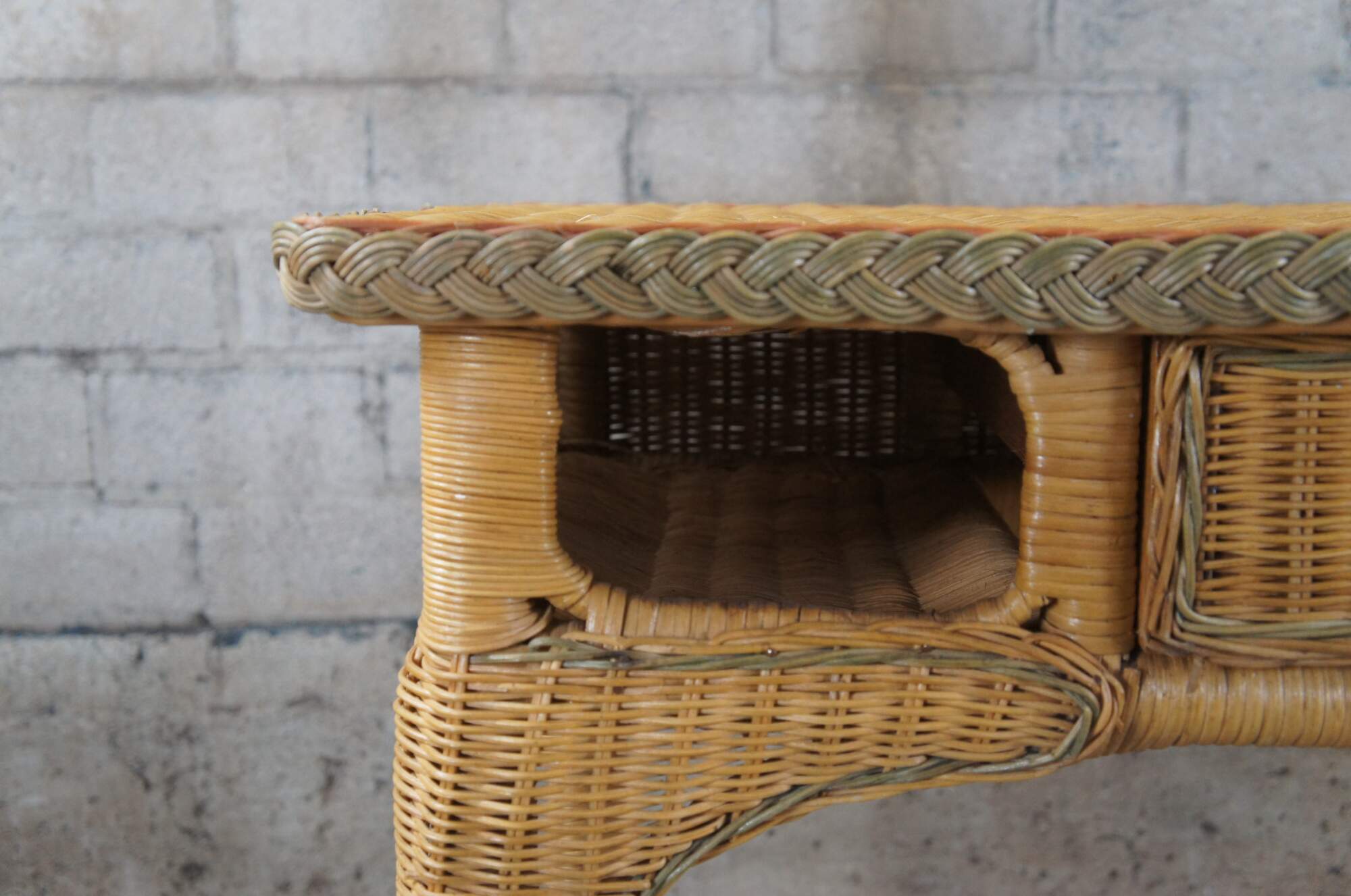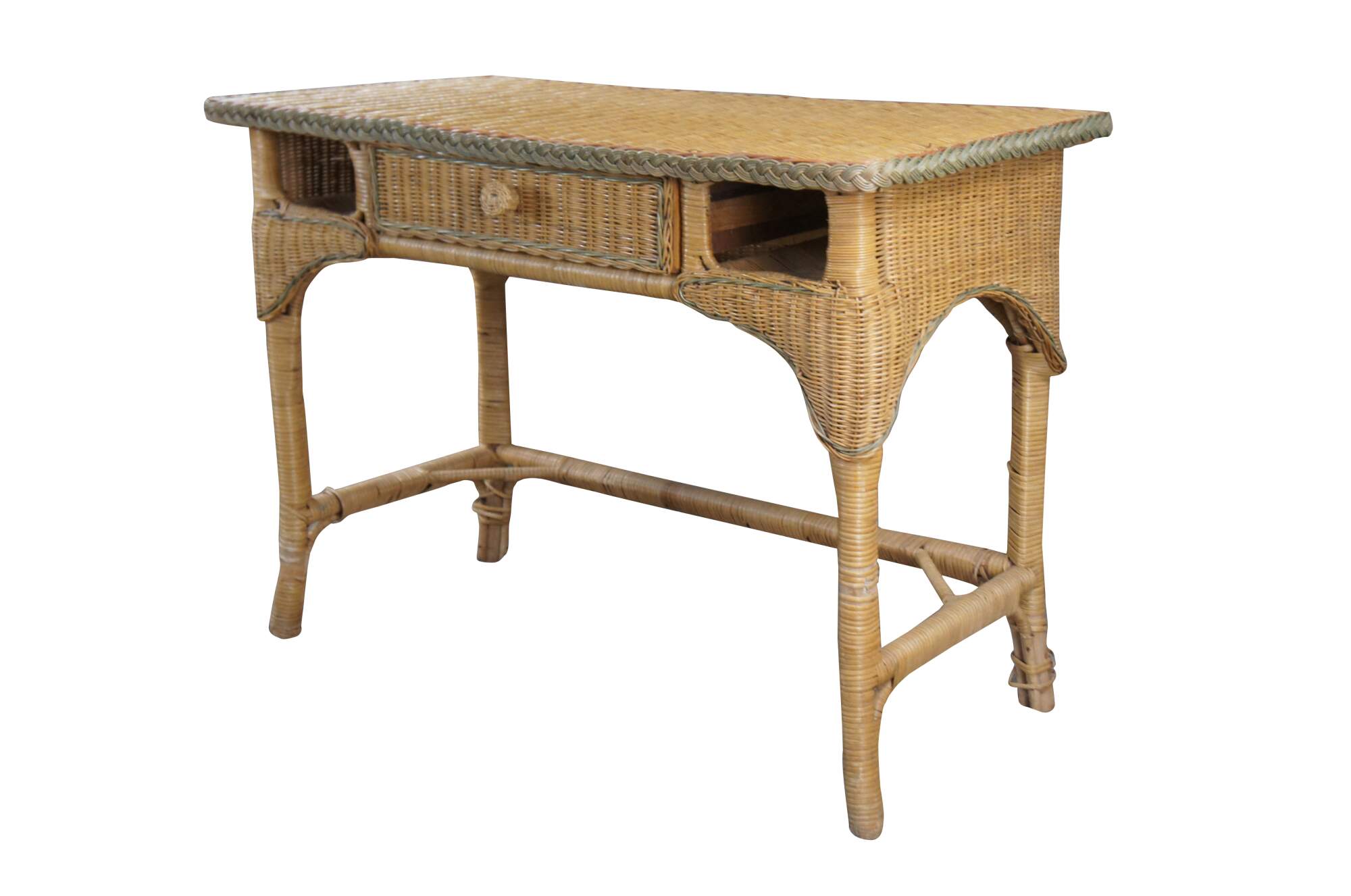 Vintage wicker desk and side chair featuring bamboo frames with woven green accents and one drawer flanked by two cubbies.