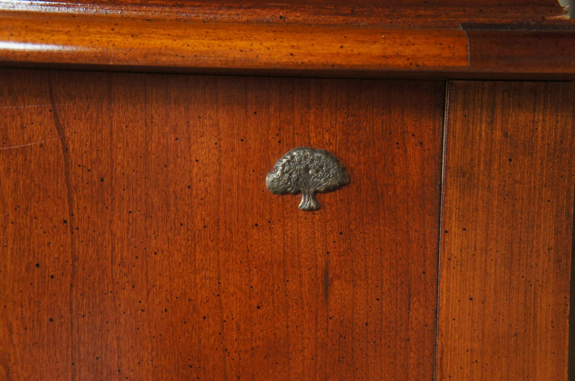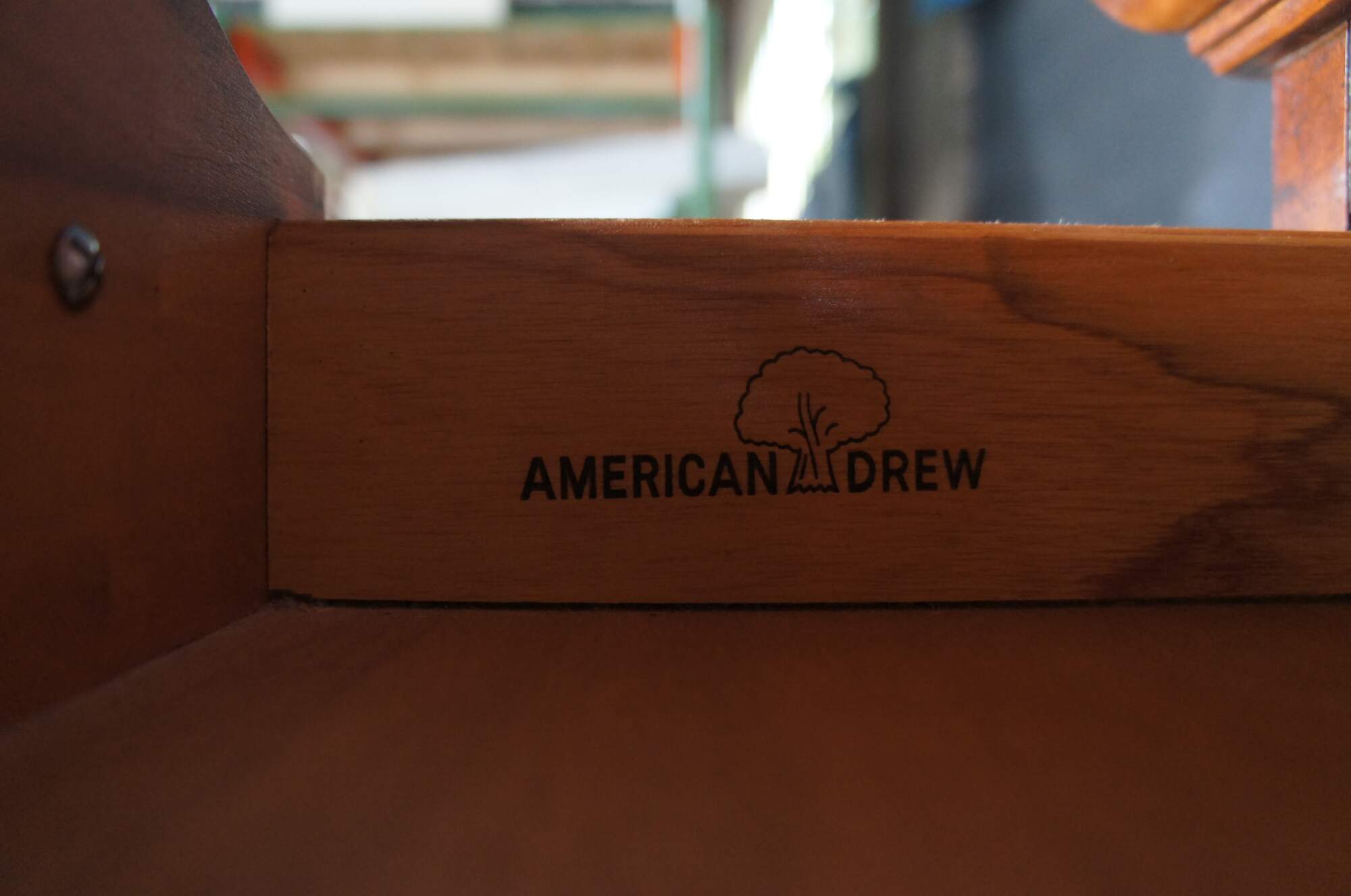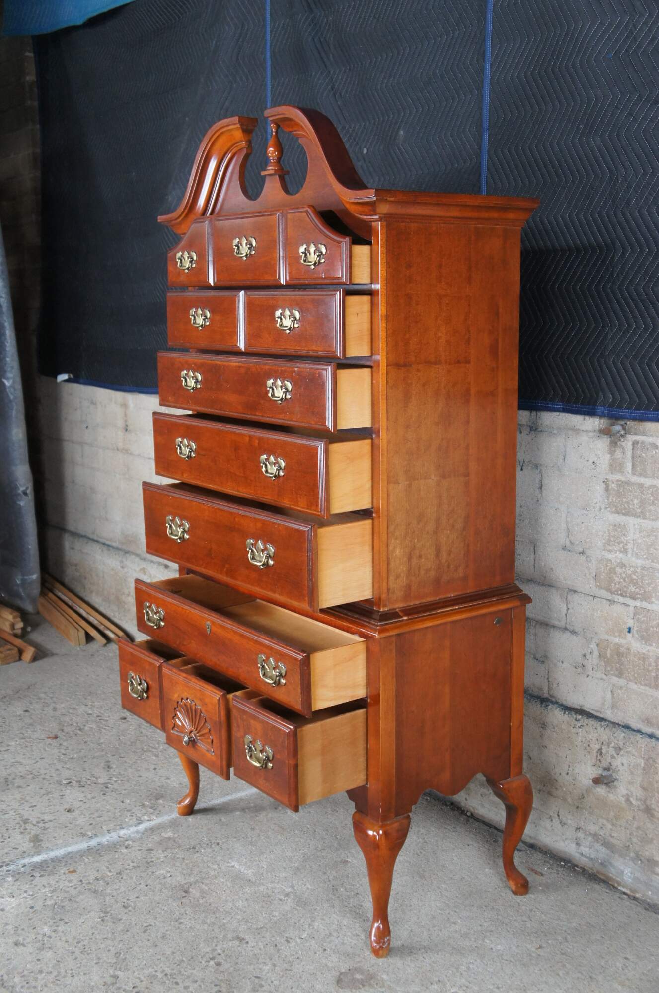 Vintage American Drew highboy chest or dresser. A chest on chest design made of cherry featuring Queen Anne styling with open pediment crown over nine drawers with Federal style brass hardware and sepentine cabriole legs.