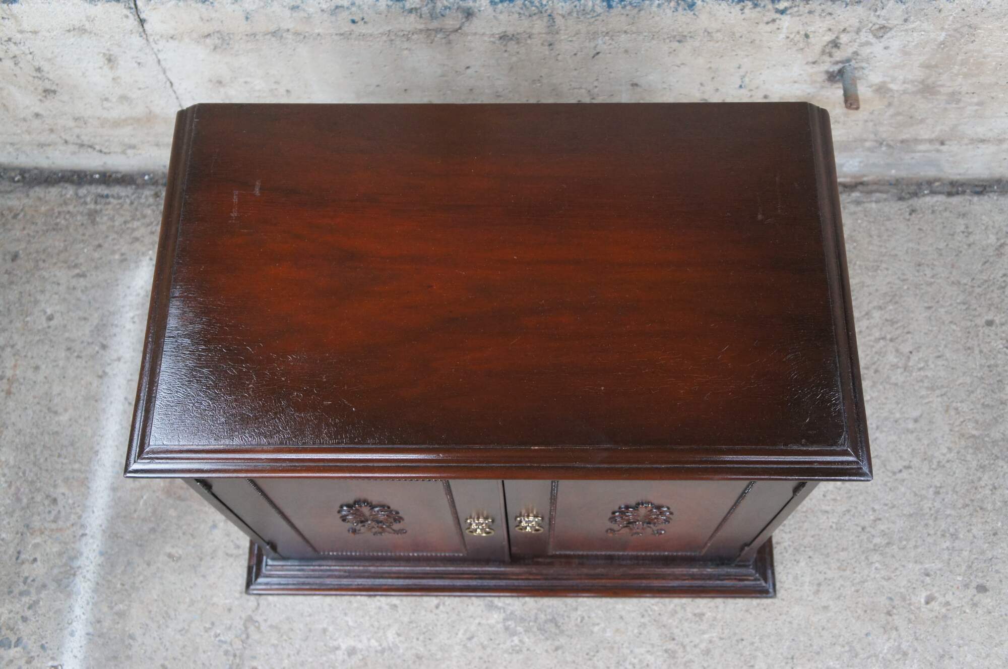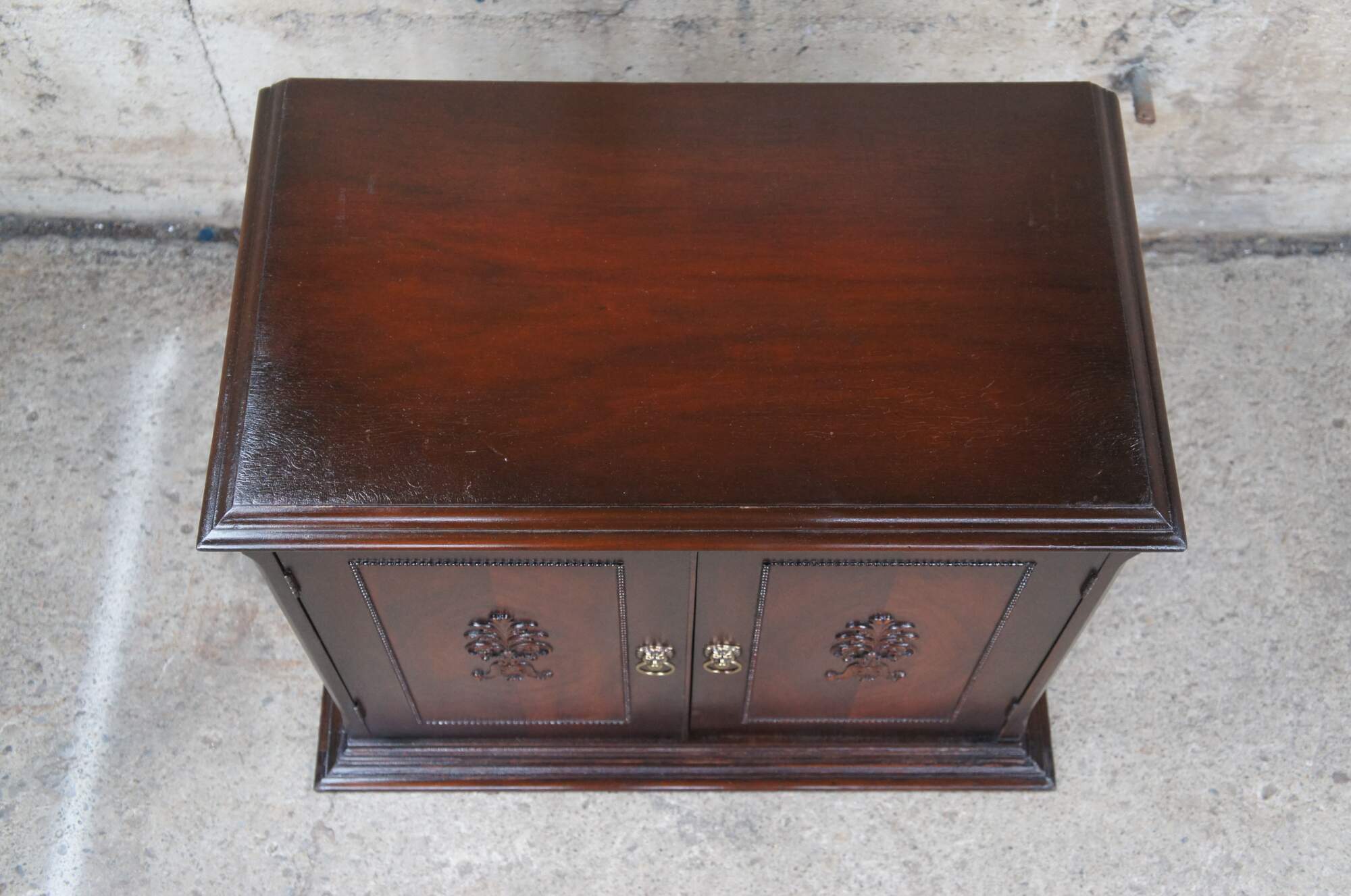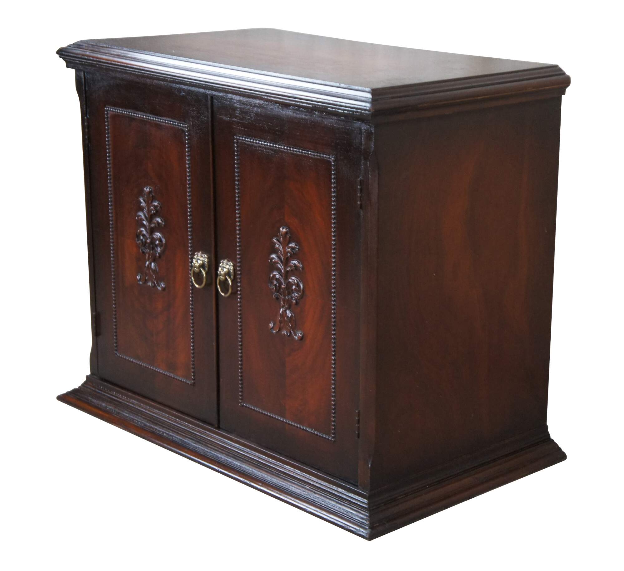 1940s vintage 2 door cabinet. Made from walnut with matchbook doors featuring beaded trim and acanthus carved center. The cabinet opens via lion head knocker pulls to a storage area with s helf. Vented along back left. This cabinet was originally on a stand. Most likely used for a tube radio. It will be a great console, record cabinet or side table.