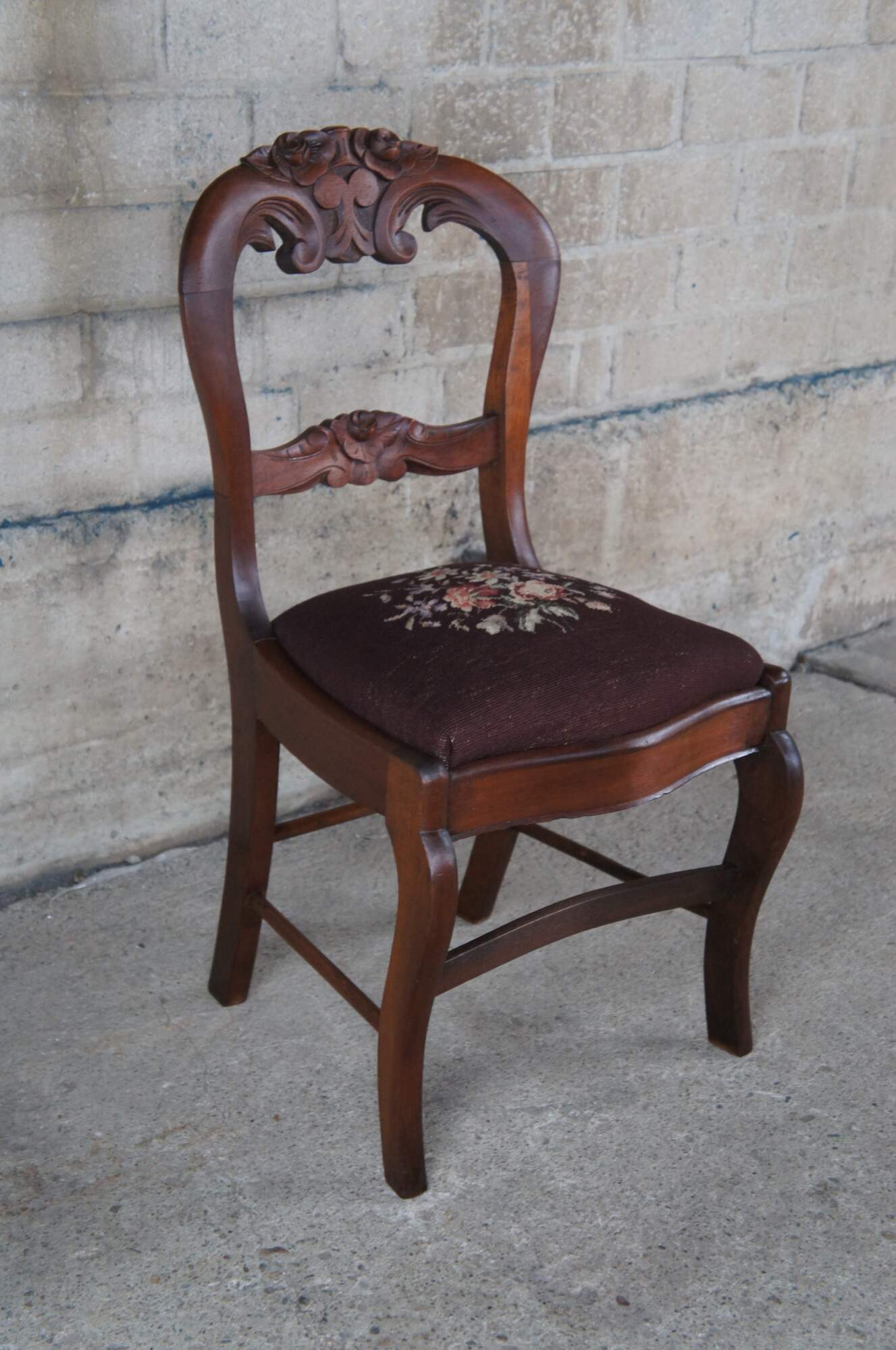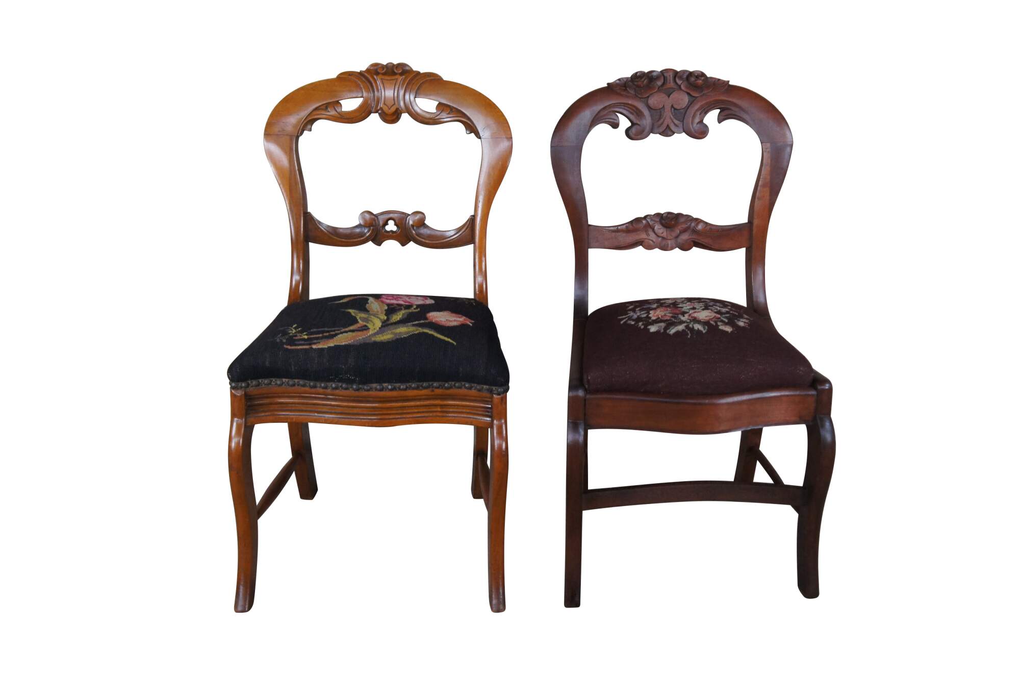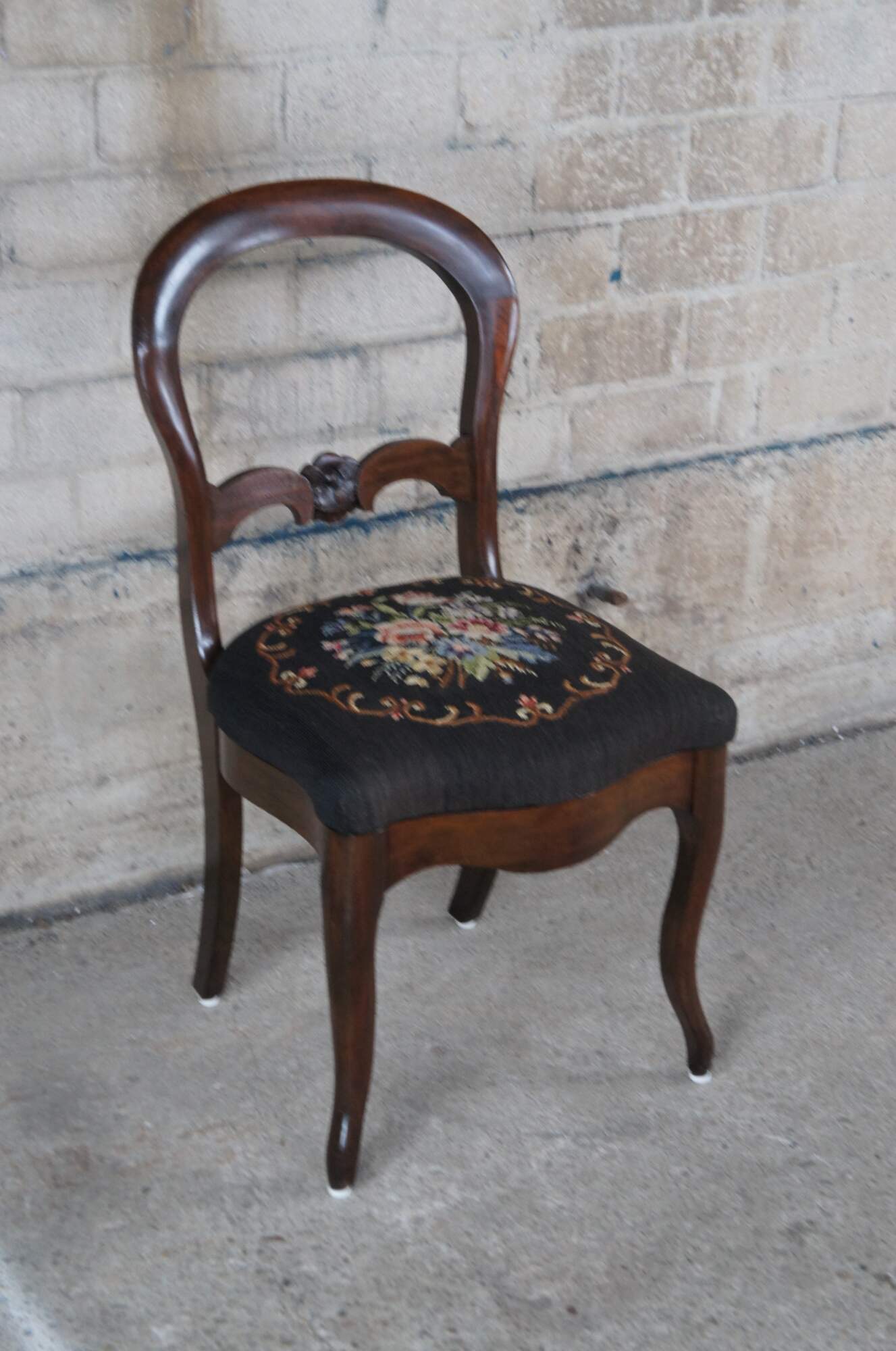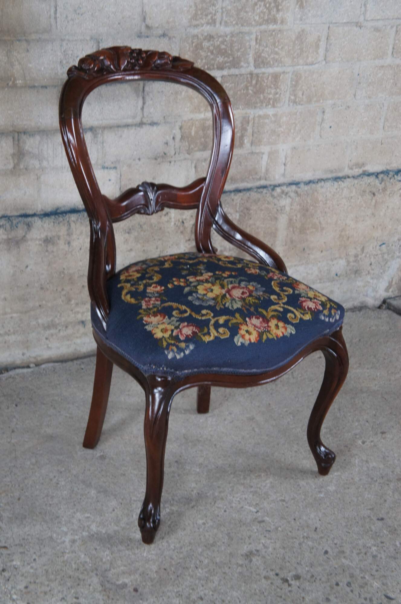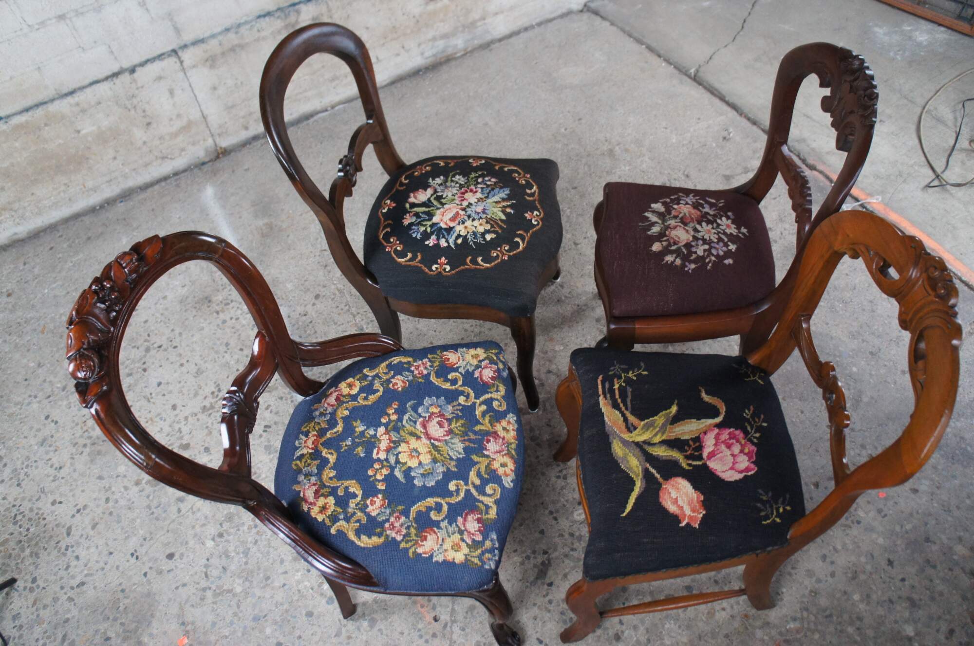 Lot of 4 Victorian Dining or side chairs from the last half of the 19th century. Each is made from mahogany with a carved balloon back and floral needelpoint. Each of the chairs has a serpentine front apron and contoured or cabriole legs.