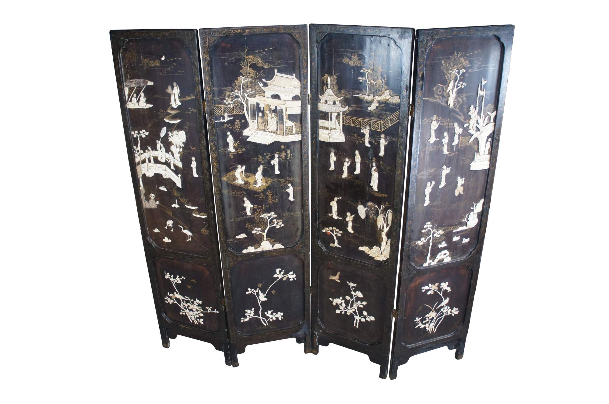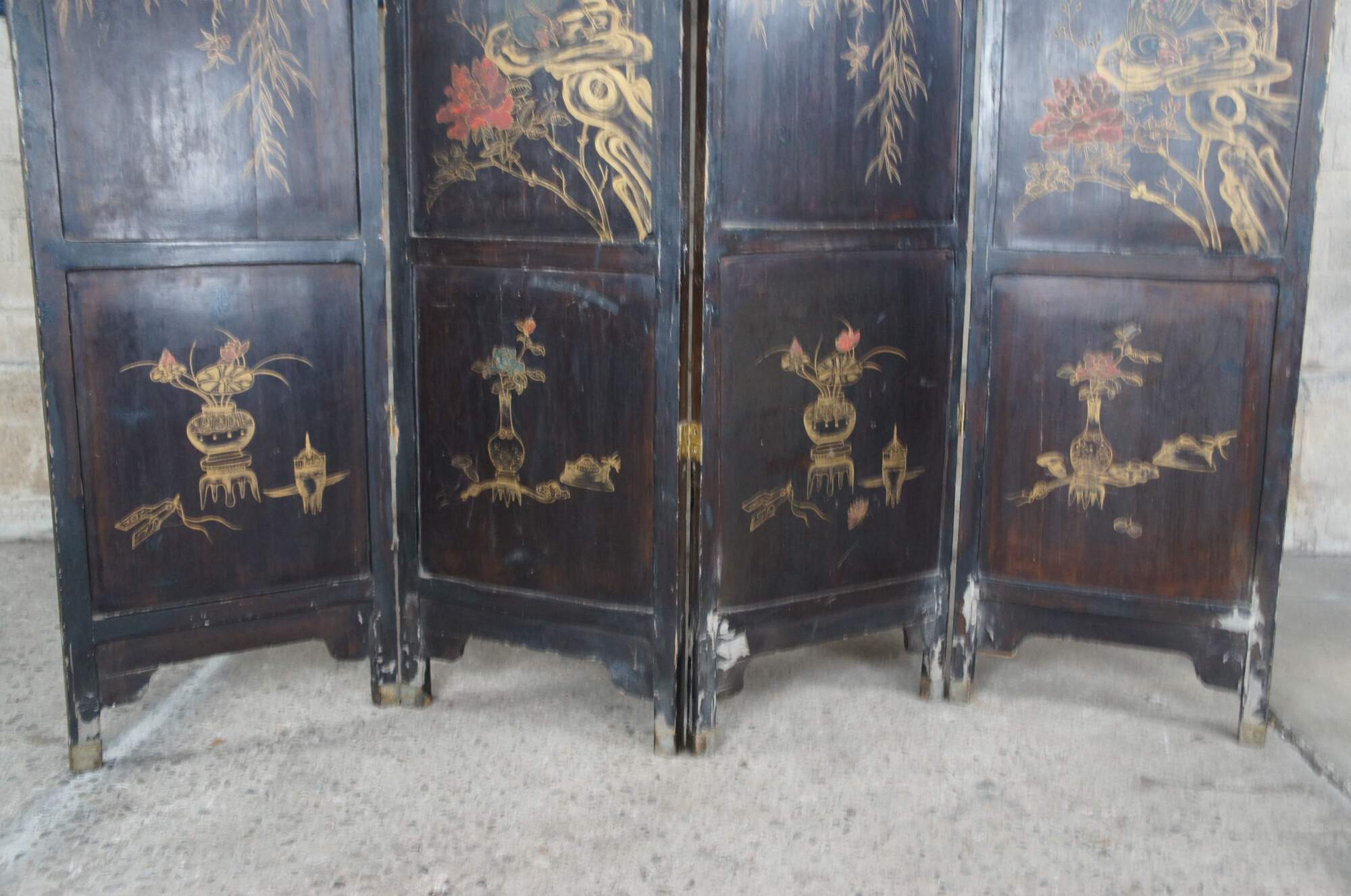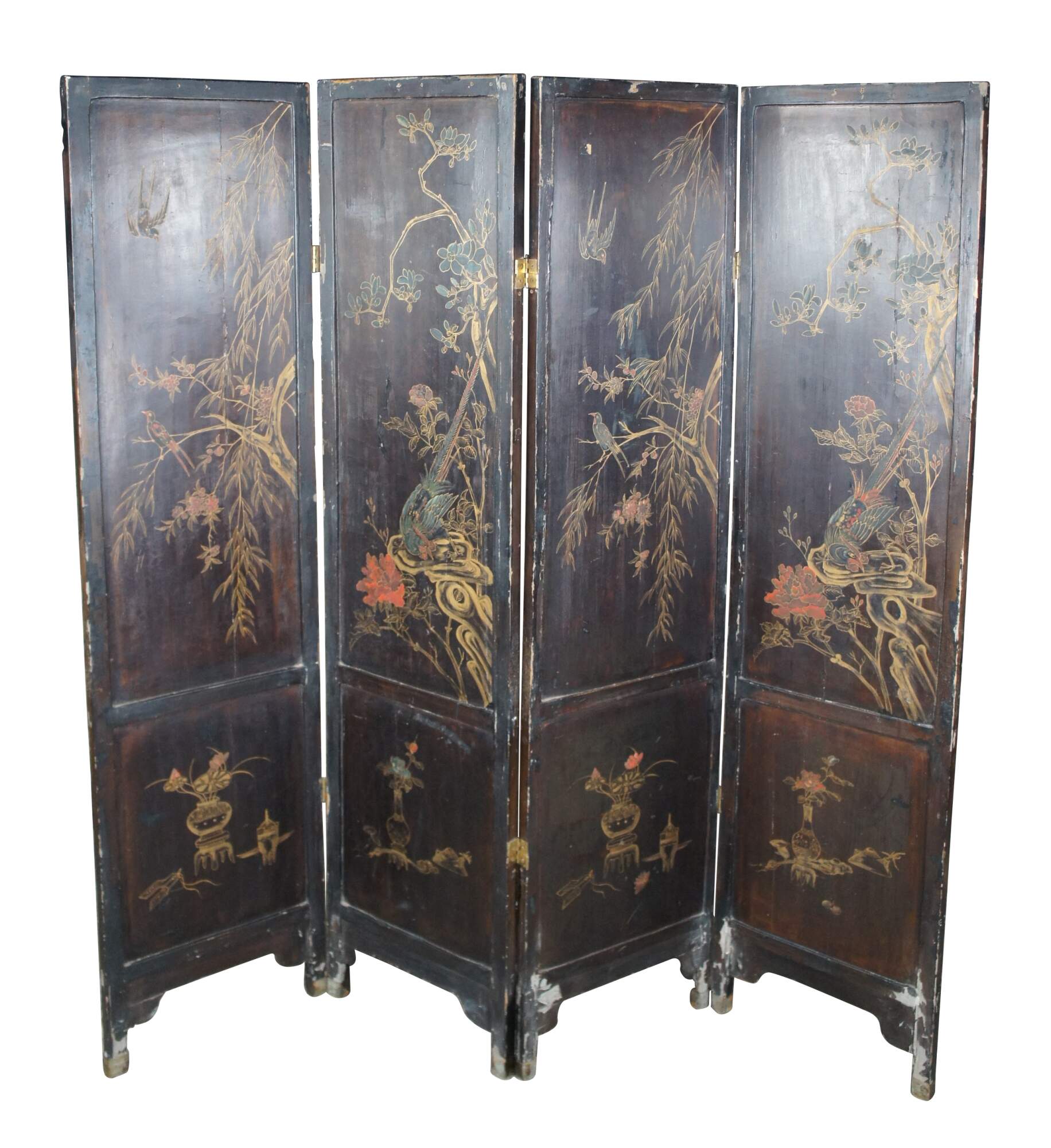 A beautiful early 20th century Chinese Coromandel 4 panel black lacquer room divider. One side Features a Chinese village and river landscape with applied and carved bovine over a gold painted backing. A pagoda or temple is at the fore front with geishas, scholars and animals placed throughout the scene. The bottom part of the screen has four smaller panels with cherry blossoms and birds. The other side carries on the bird motif with an intricate hand painted scene of tropical birds and foliage. Vibrantly painted in gold with highlights of red and green for the flowers and birds. The base of the screen has metal capped feet and the panels are joined with brass two way hinges. An amazing screen with great depth and design elements that will add warmth to any space.