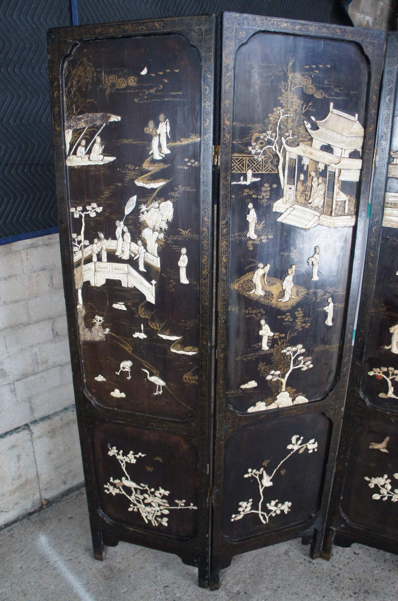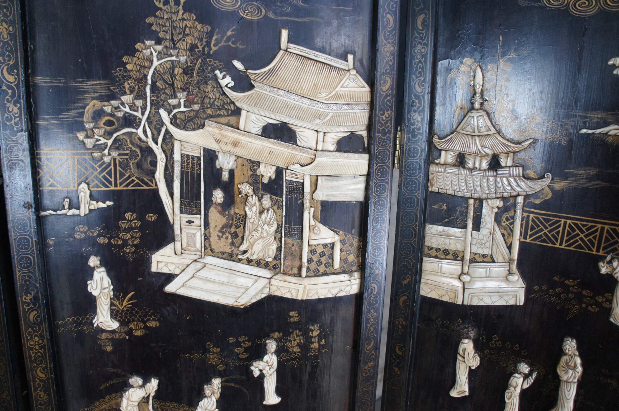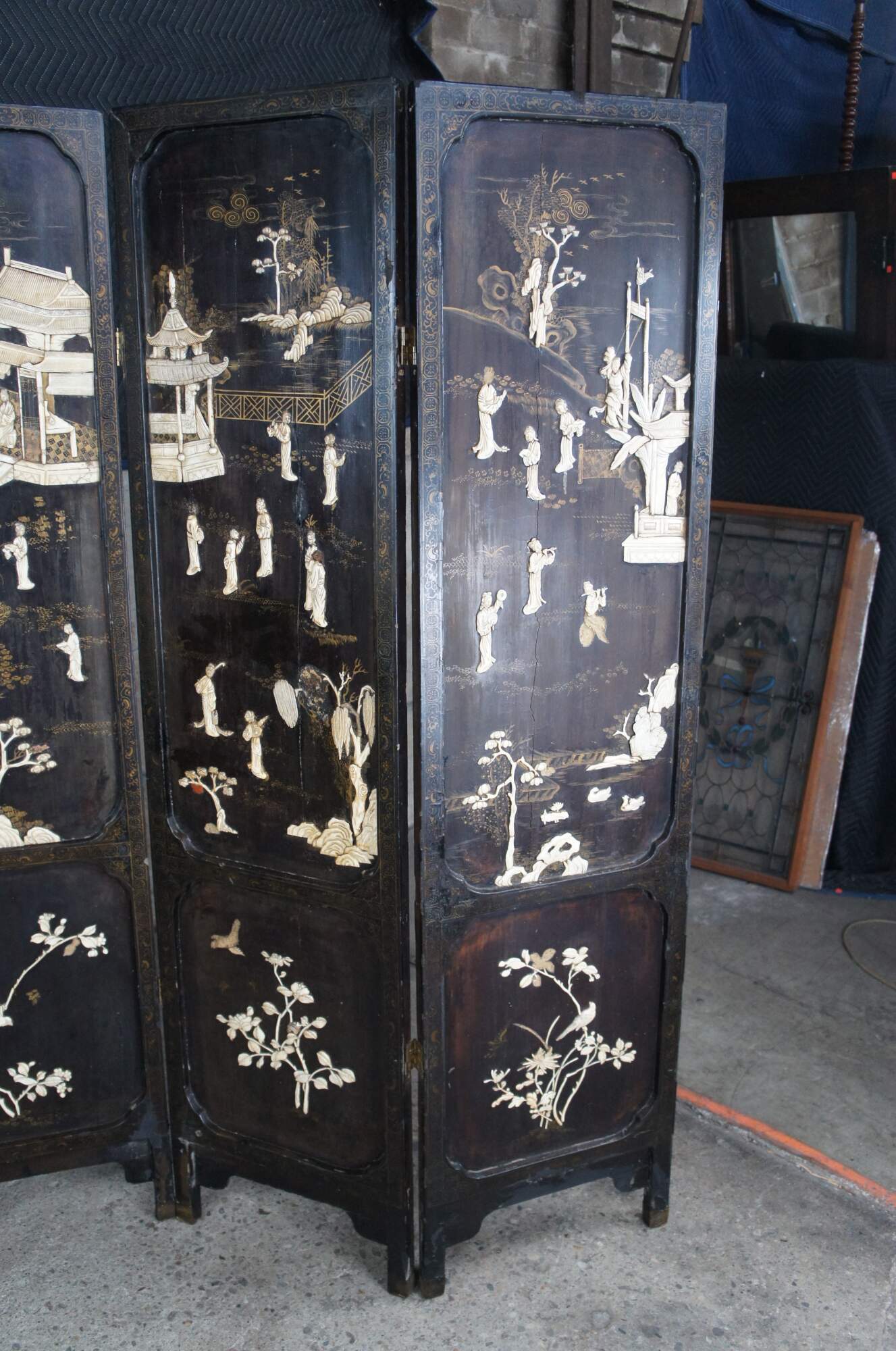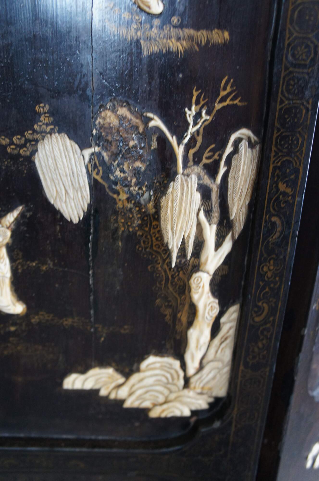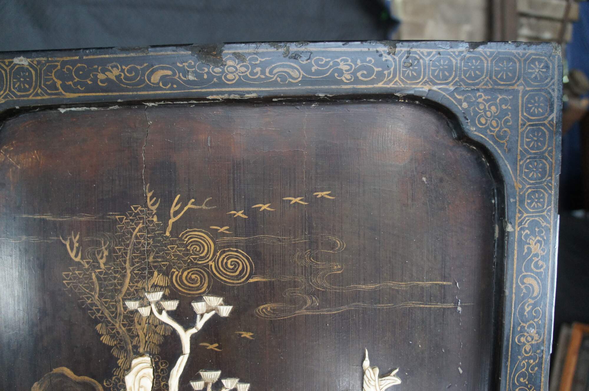Wear and distressing consistent with age and use. Some hazing to the lacquer as well as missing and chipped paint. The carved side is brittle from drying out with several missing pieces. The pieces sometimes fall off when it is moved. Hinges are slightly loose from being moved around and re-drilled over the past century. Could be restored, or used as is.