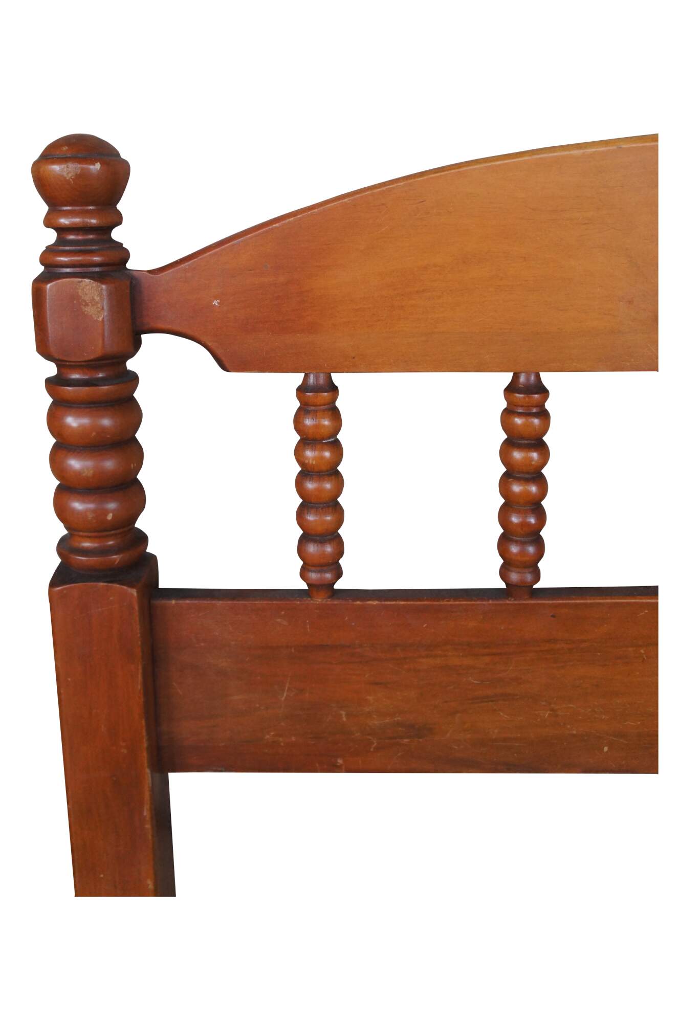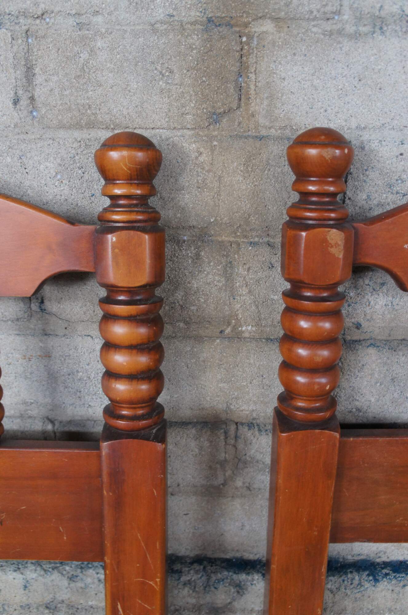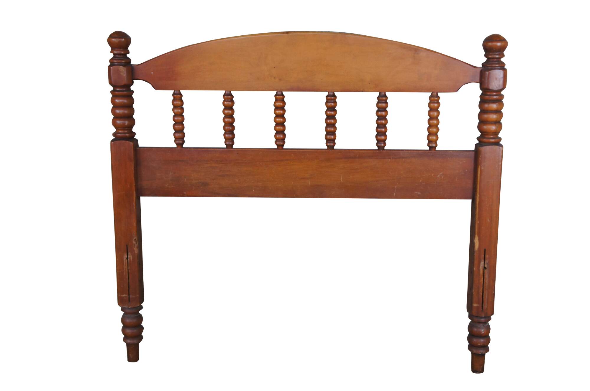Pair of Early American style twin size headboards. Made from maple with a crescent shaped back with ribbed spindles and turned posts.