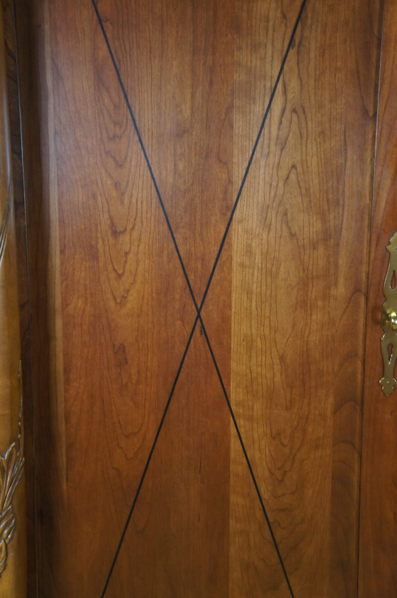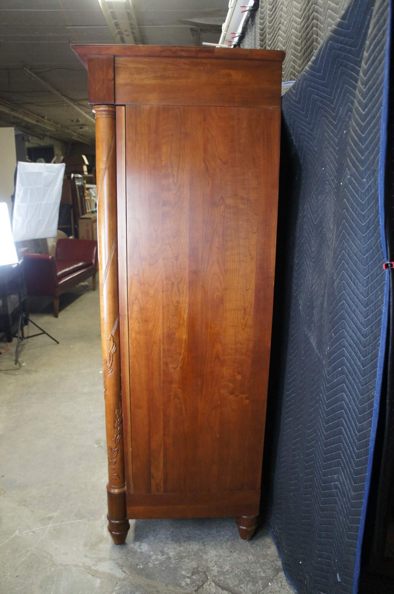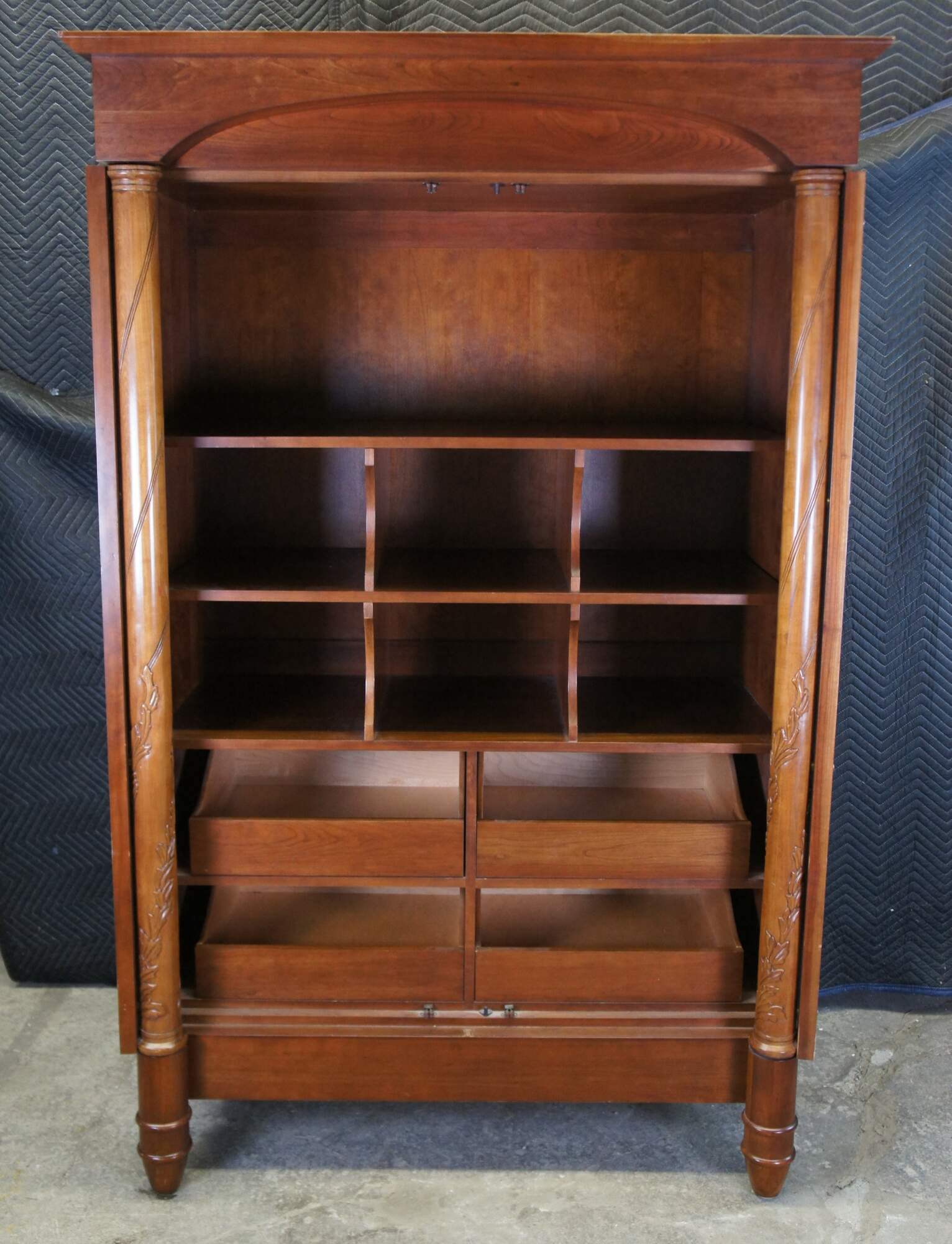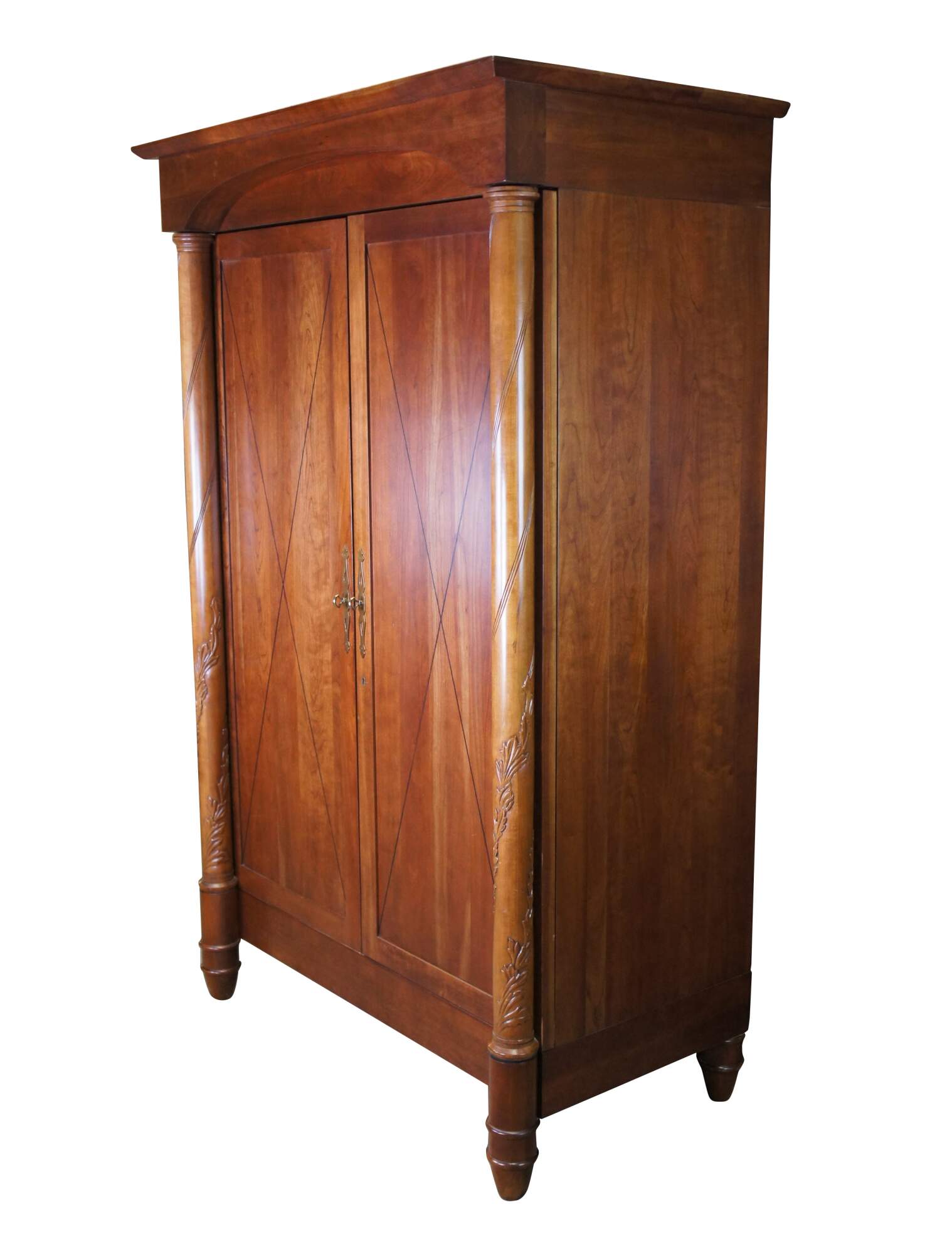 An exceptional wardobe by Harden Furniture; circa 1980s. Drawing inspiration from Italian and Neoclassical styling. Made from solid Cherry with double doors set behind acanthus carved and spiral fluted columns. The doors feature classic X inlay in black and brass brass pulls. The armoire opens to cubbies, shelves and dovetailed drawers for storage. The cabinet has a beautifully arched crown with beveled top edge and rests on tapered robbed feet.