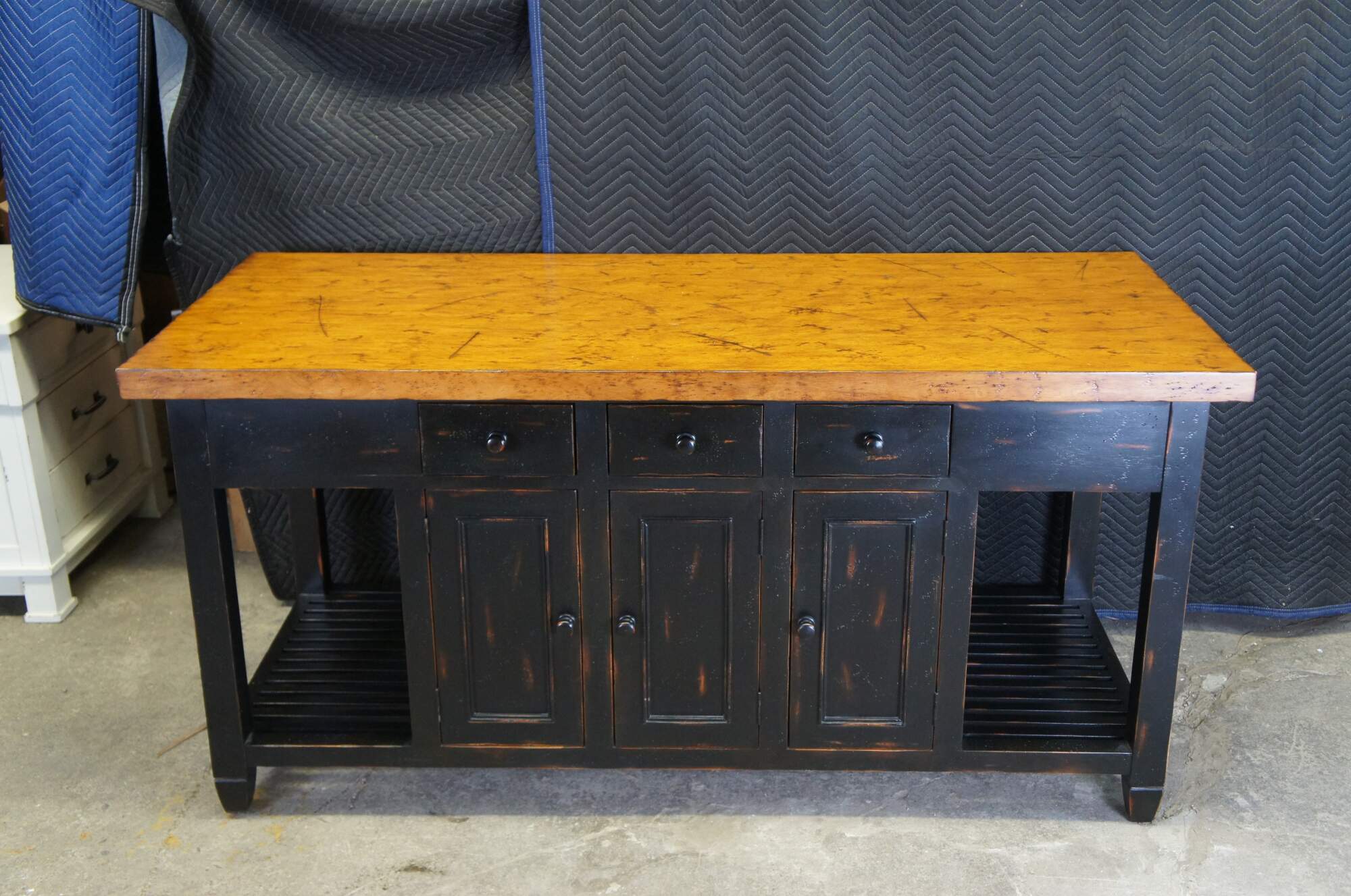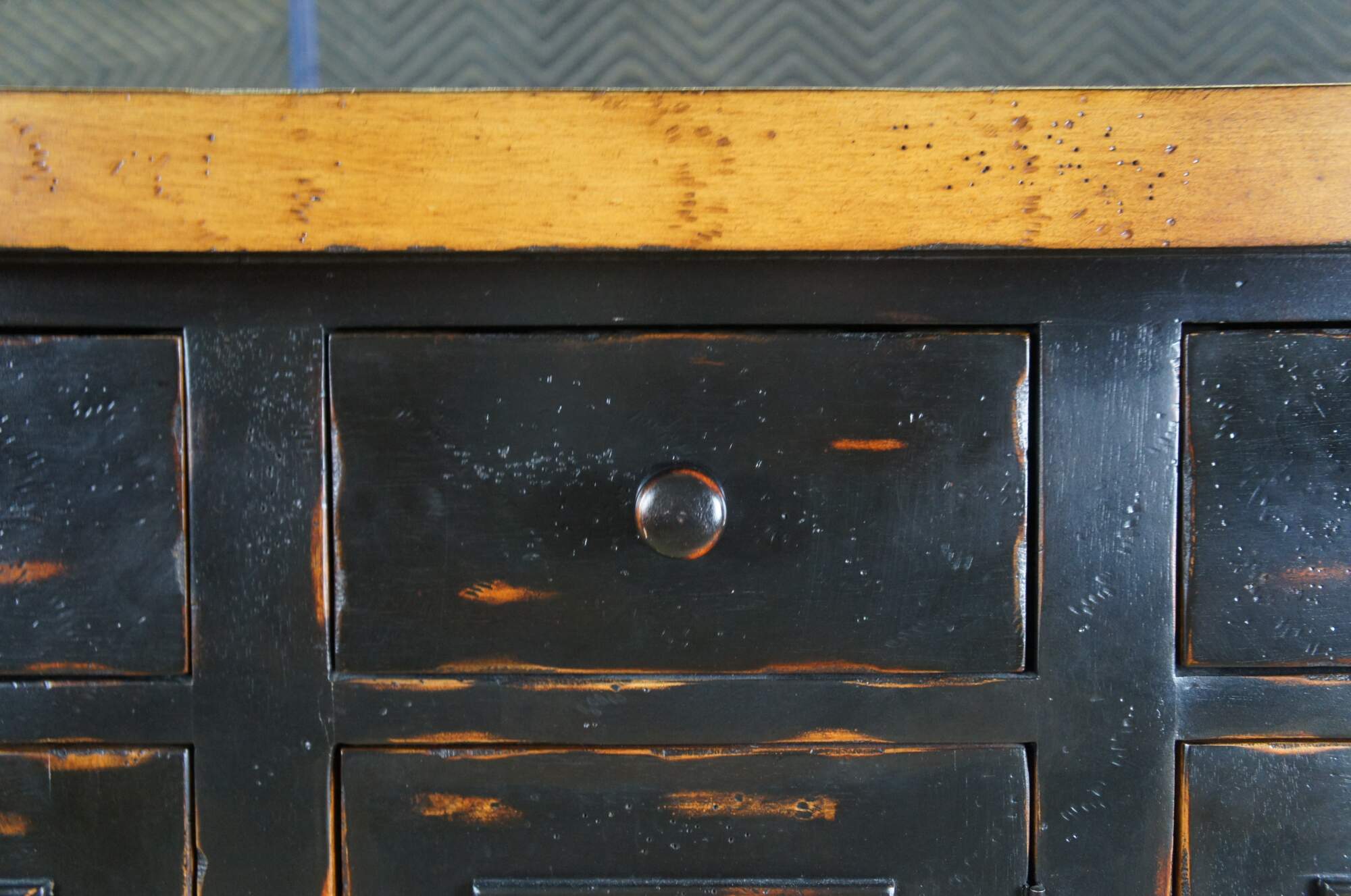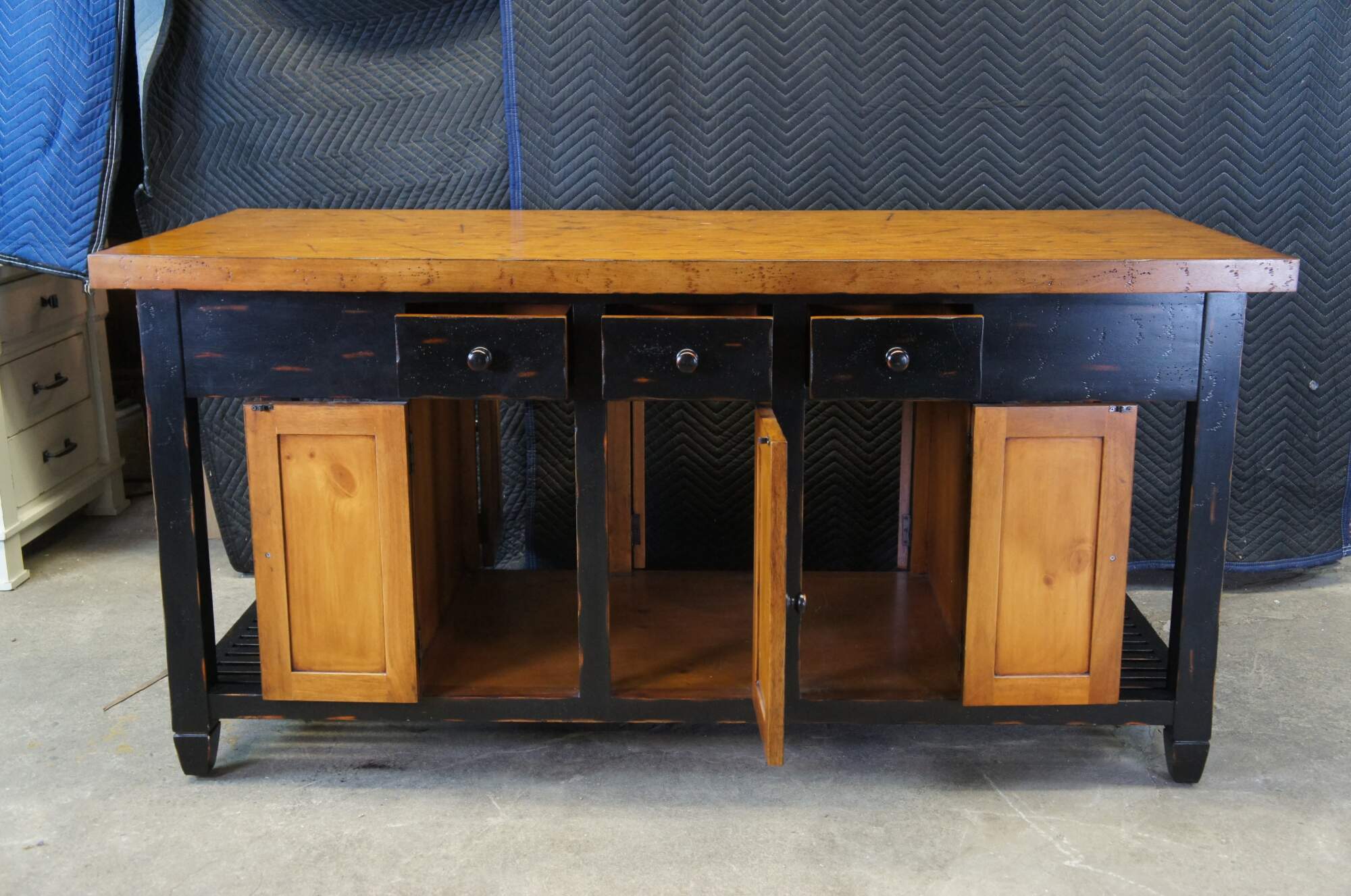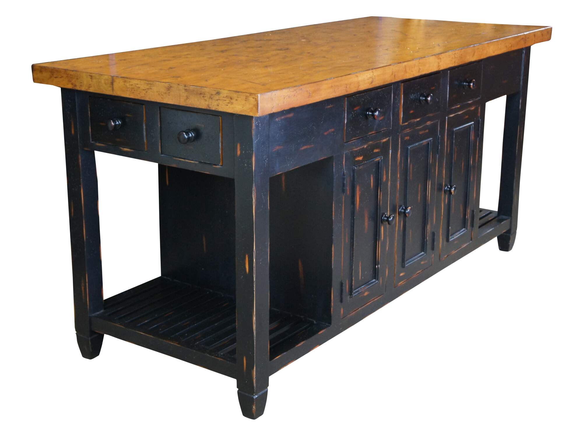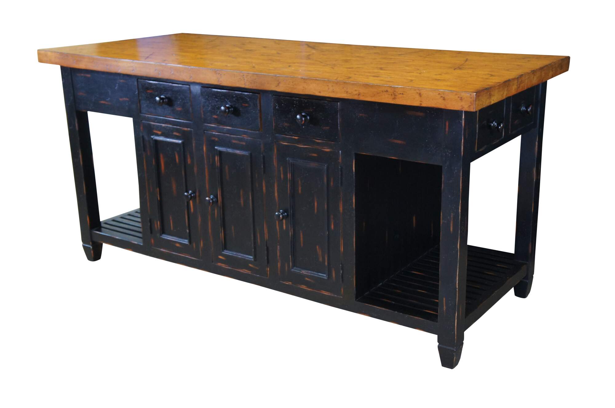 Vintage Sarreid Ltd Farmhouse island / table. Drawing inspiration from French Country and Farmhoues styling. Made from pine with natural distressing throughout. The base or cabinet portion of the table has a dark finish allowing the natural wood tone to show through in the distressed areas. Features three drawers over three cabinets on each side as well as two drawers on the shorter sides and an open shelf on each end. A refreshing modern take on rustic farmhouse design. Could be used as a console table , workshop stand alone in any space for additional storage. Marked Sarreid Ltd along underside.