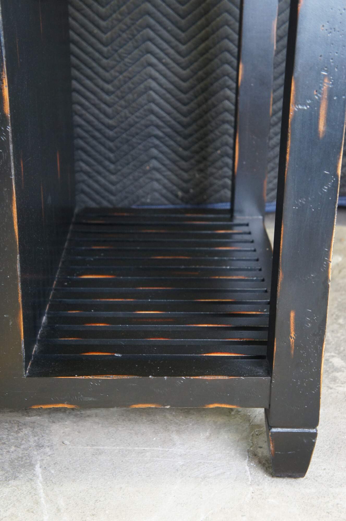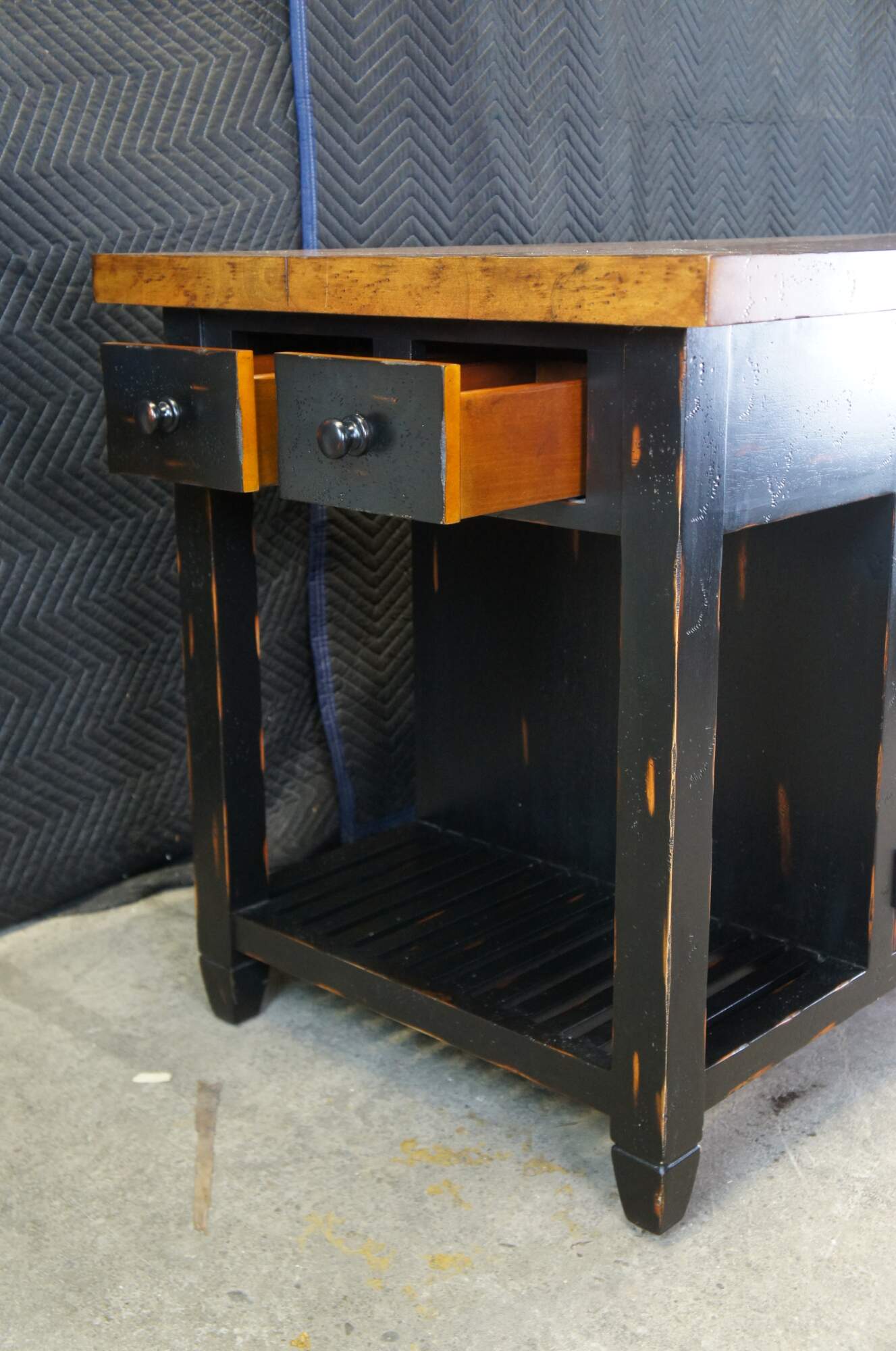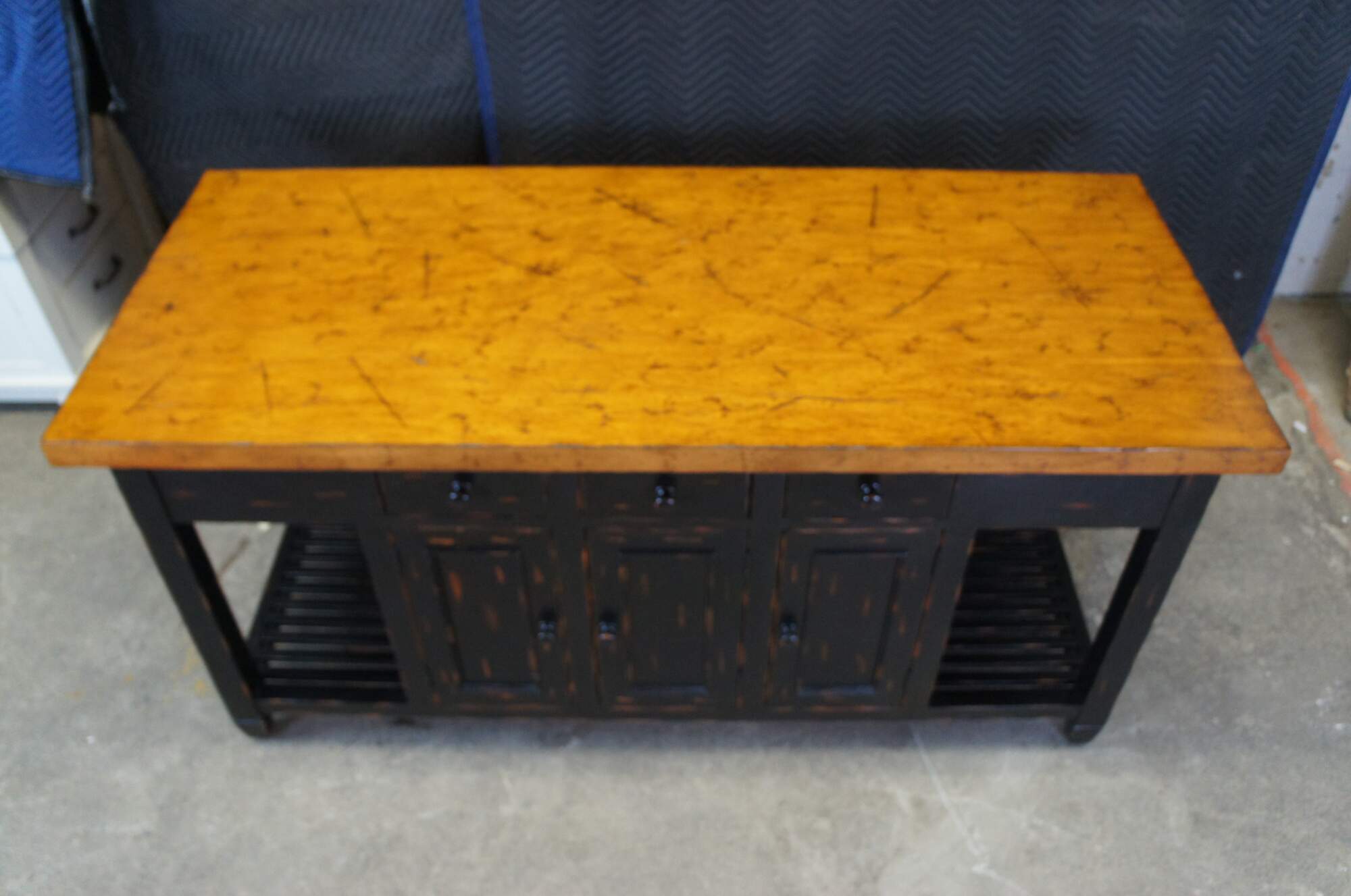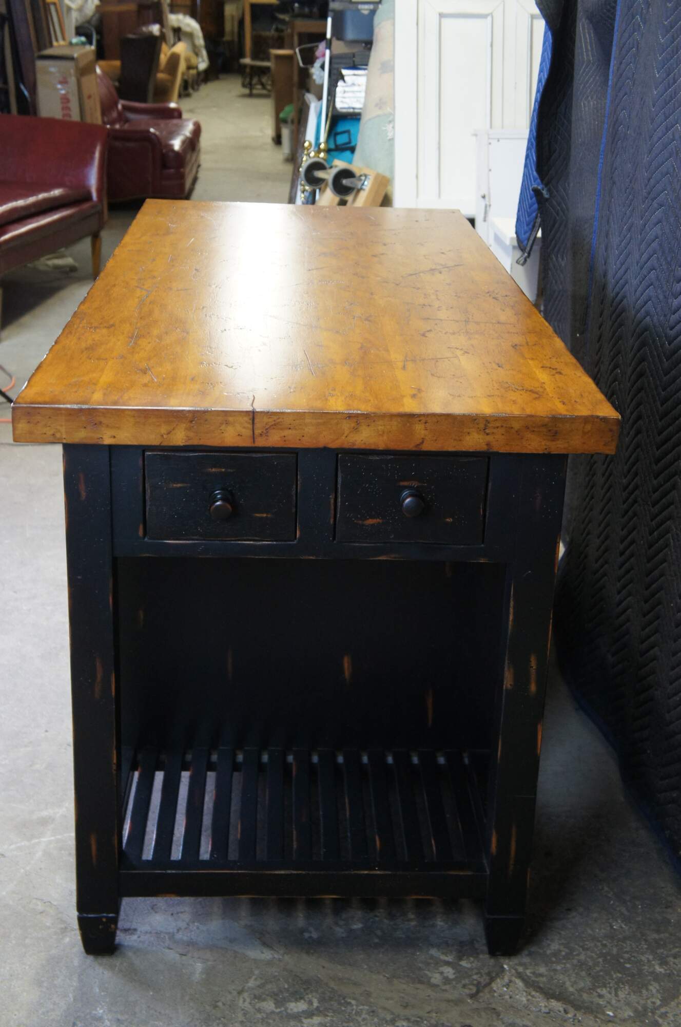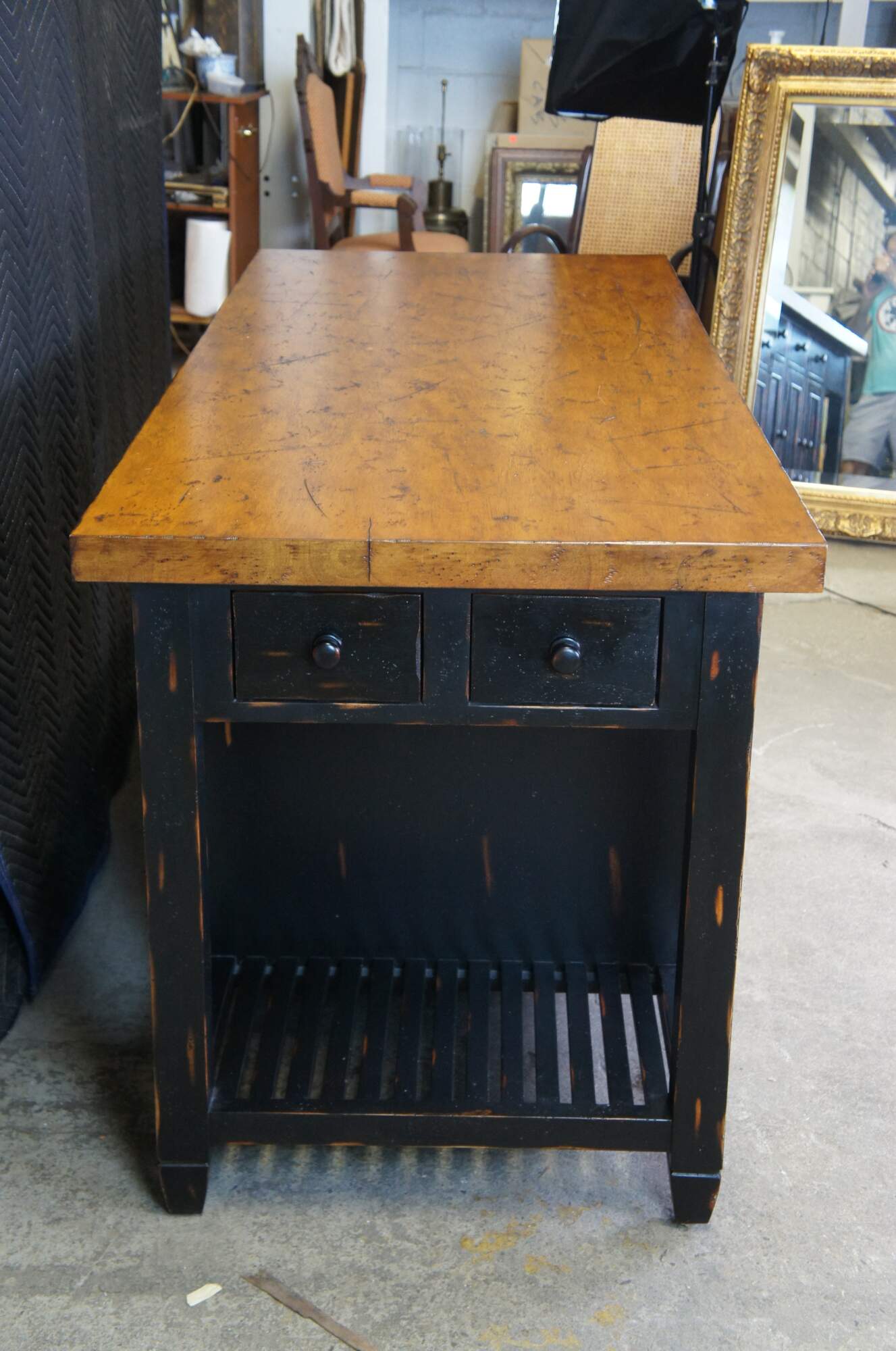 Vintage Sarreid Ltd Farmhouse island / table. Drawing inspiration from French Country and Farmhoues styling. Made from pine with natural distressing throughout. The base or cabinet portion of the table has a dark finish allowing the natural wood tone to show through in the distressed areas. Features three drawers over three cabinets on each side as well as two drawers on the shorter sides and an open shelf on each end. A refreshing modern take on rustic farmhouse design. Could be used as a console table , workshop stand alone in any space for additional storage. Marked Sarreid Ltd along underside.