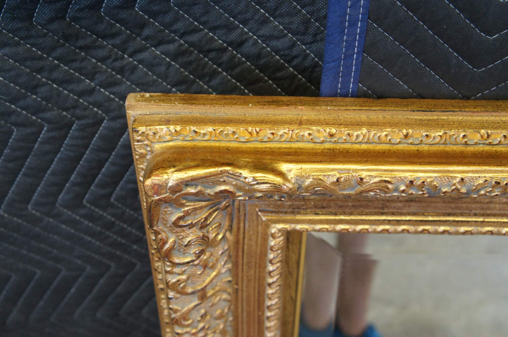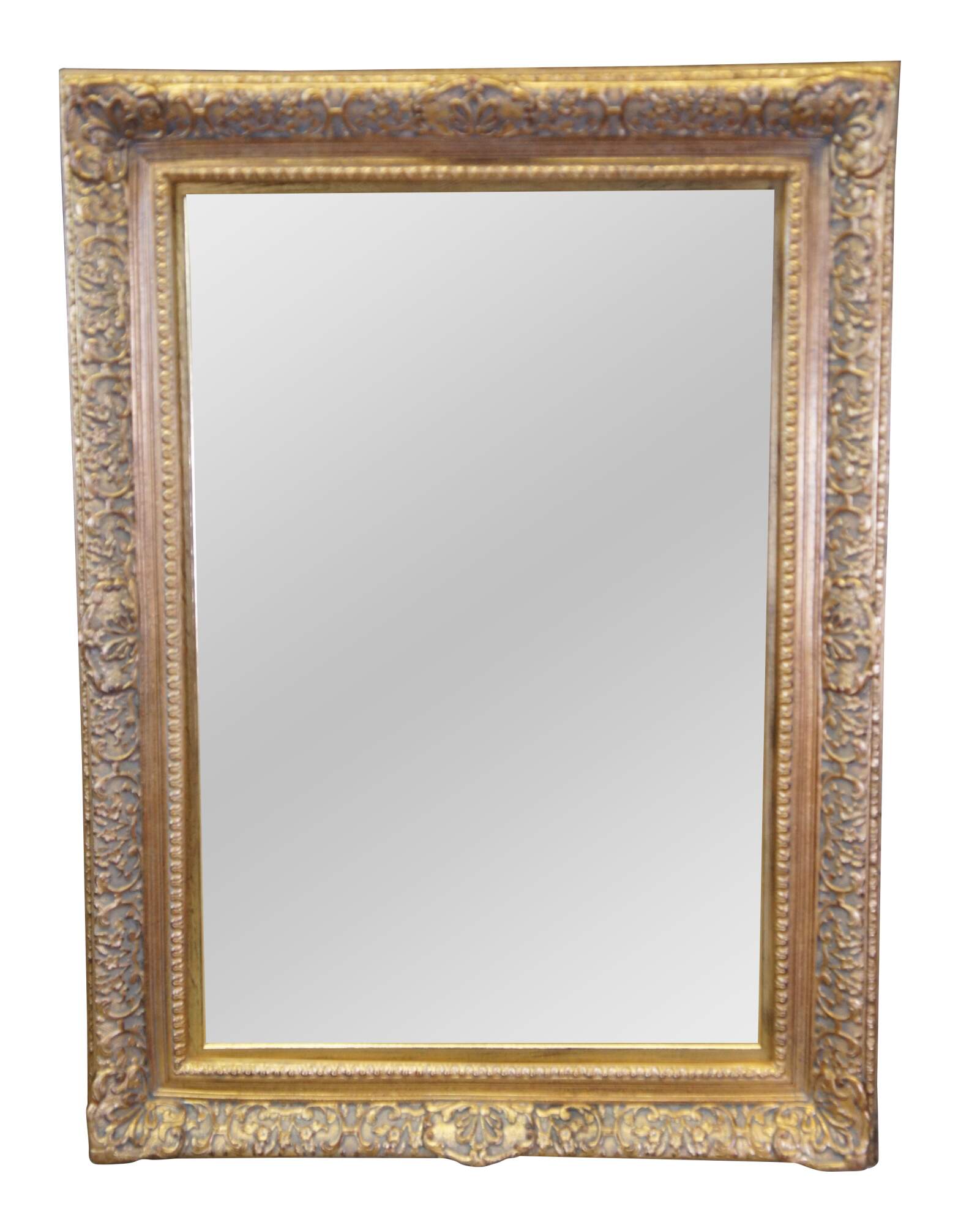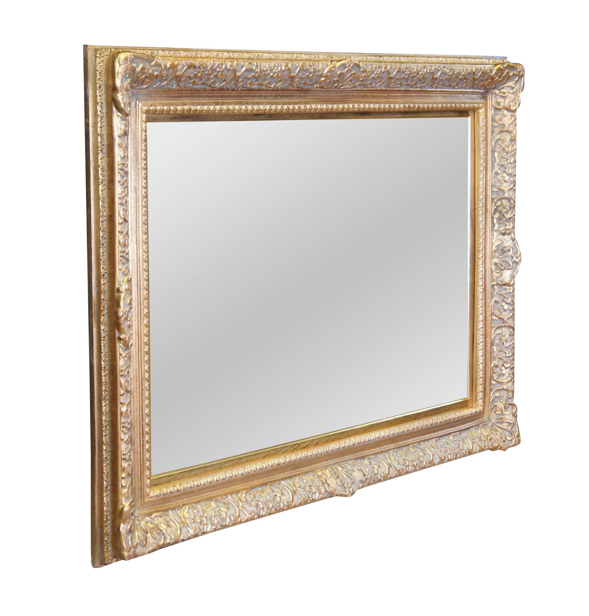 An italian Italian Baroque style mirror. Features an ornate gold frame made from pine and beveled glass plate mirror. Can be hun vertical or horizontal. Great for over a console, bathroom, bedroom or above a mantel. Would also work well as a painting / artwork frame. Interior measurements 24" x 36