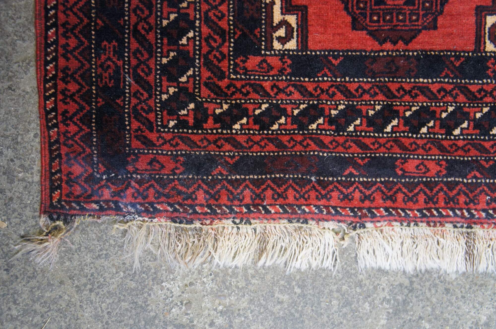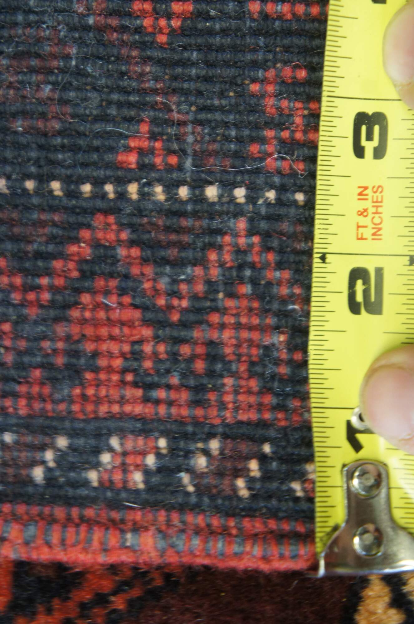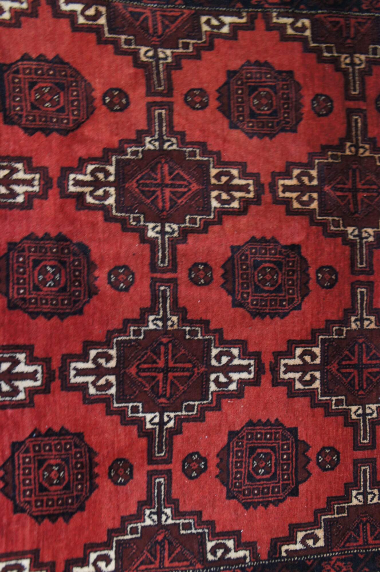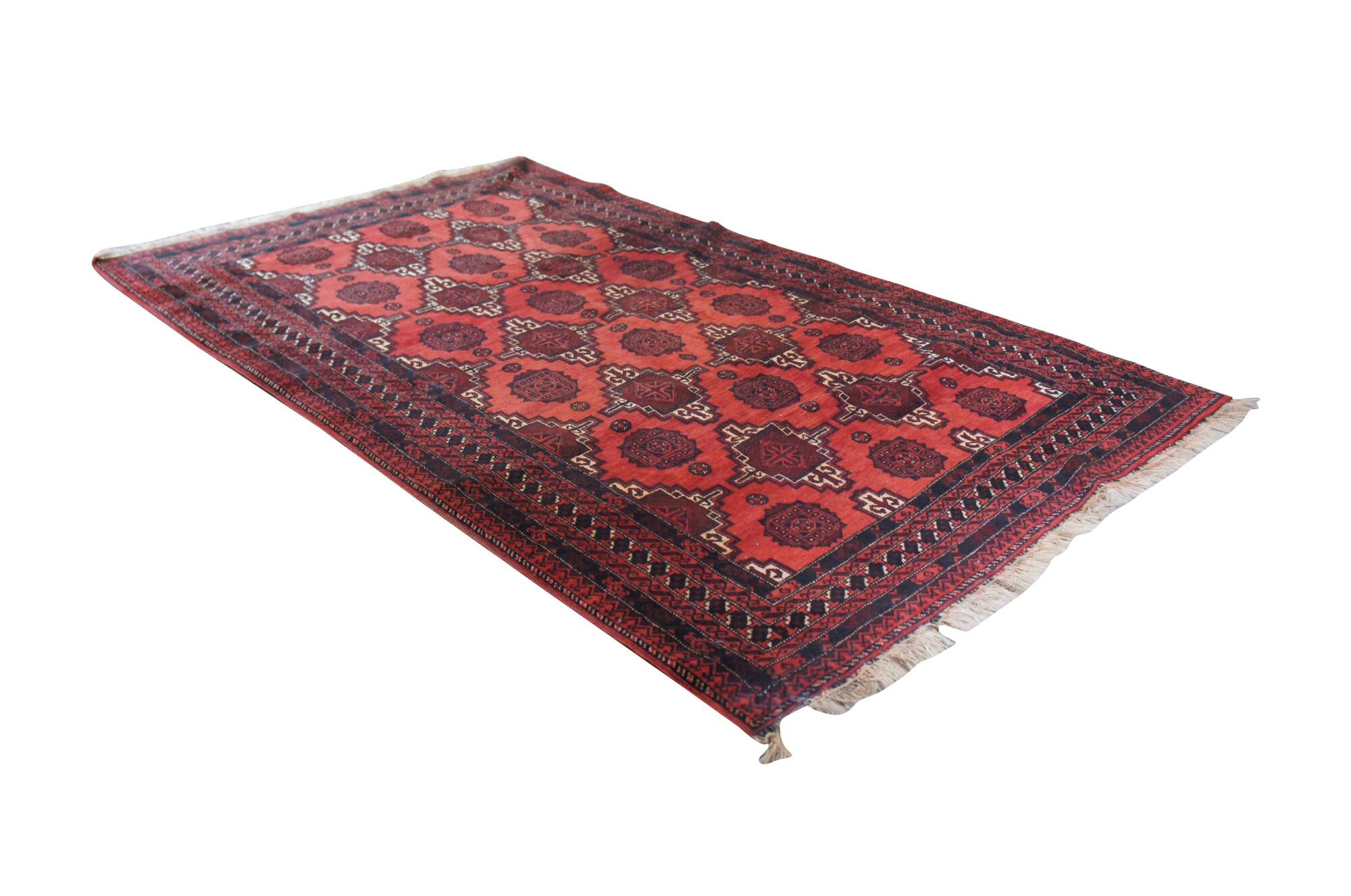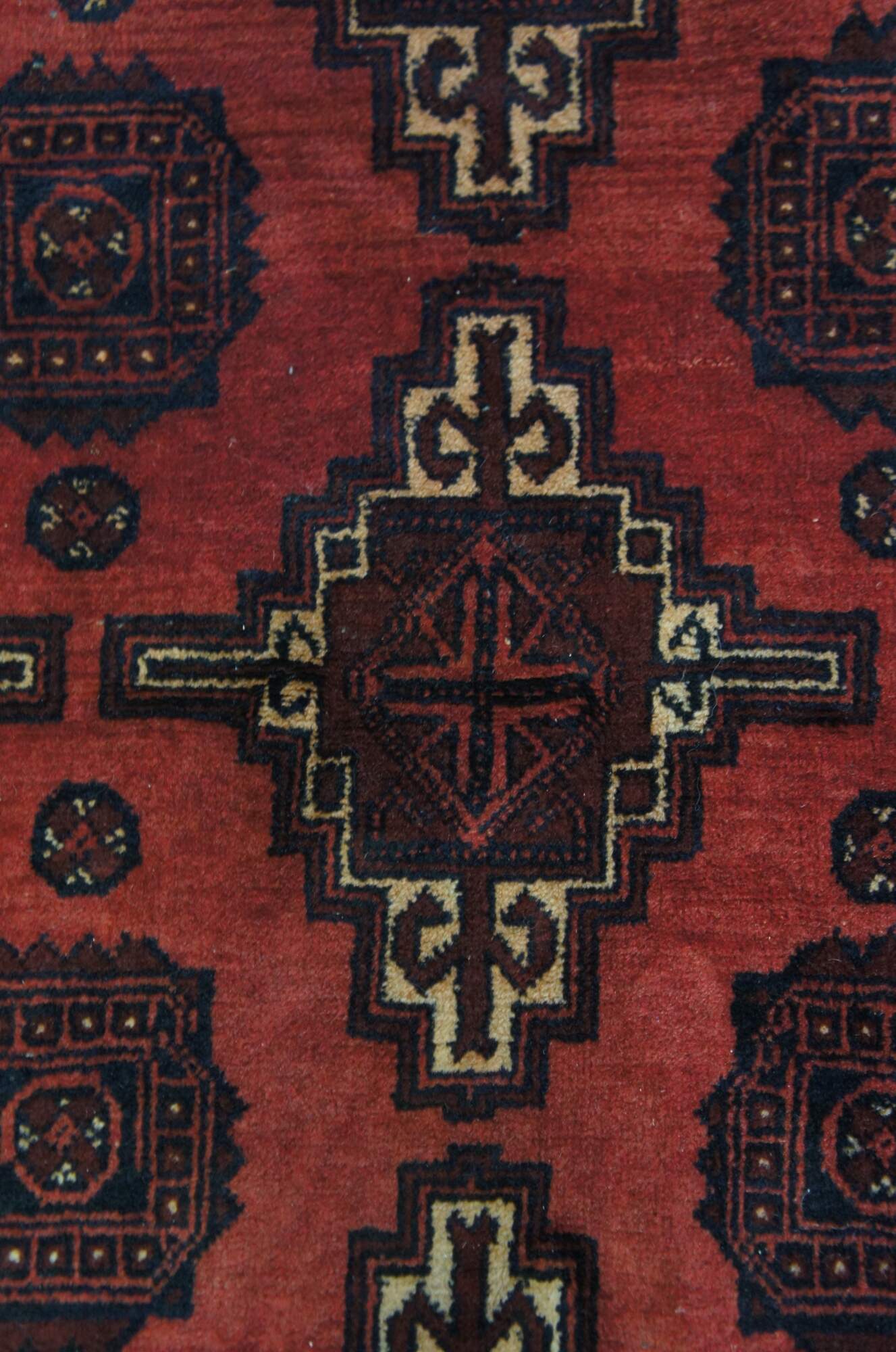 A beautiful hand knotted wool geometric area rug. Features reds and beige